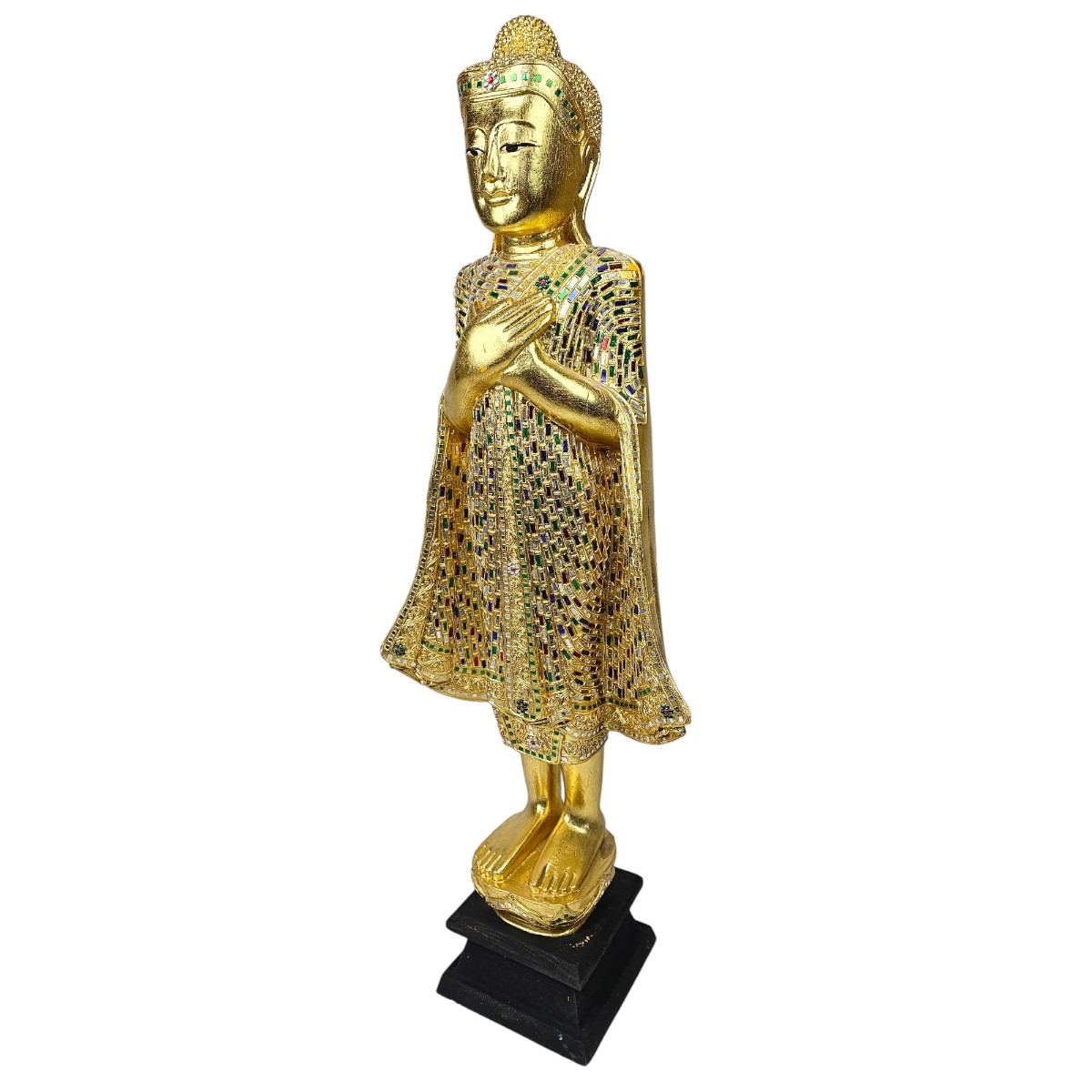 "Eintauchen in die mystische Welt der spirituellen Erleuchtung mit unserem handgefertigten goldfarbenen Holz-Buddha. Ein wahrhaft einzigartiges Kunstwerk, meisterhaft in Thailand hergestellt und üppig mit glitzernden Mosaiksteinen verziert. Seine majestätische goldene Farbe symbolisiert Weisheit und Wissen, während die sorgfältig platzierten Mosaiksteine die kulturelle Tiefe des Buddhismus hervorbringen. Lassen Sie diesen Buddha einen Raum mit Ausgeglichenheit und Frieden füllen, während er zugleich ein beeindruckendes dekoratives Schmuckstück darstellt. Schaffen Sie eine Oase der Ruhe in Ihrem Zuhause mit diesem handgefertigten Schatz aus dem exotischen Thailand."