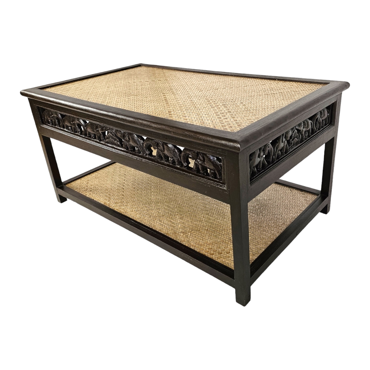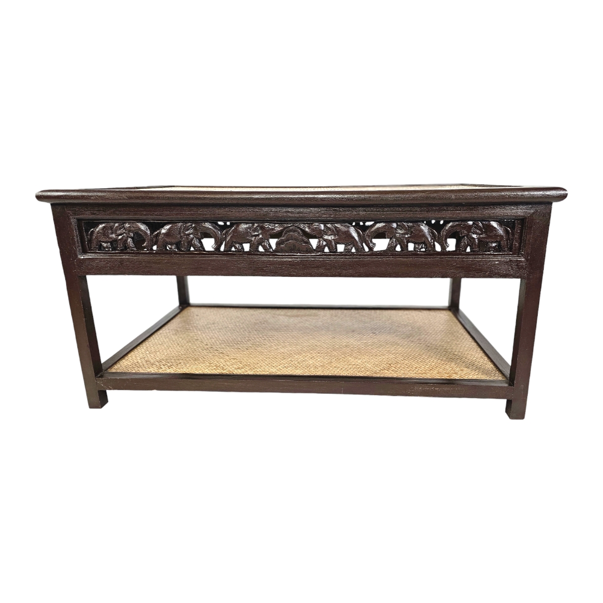 Verleihen Sie Ihrem Wohnzimmer einen Hauch von Exotik mit unserem einzigartigen Couchtisch aus Thailand. Dieses Meisterwerk der Handwerkskunst sticht besonders durch die liebevoll handgeschnitzten Elefantenmotive hervor, die den kompletten Rand des Tisches zieren. Jedes Detail der Schnitzerei erzählt eine eigene Geschichte und zieht die Blicke Ihrer Gäste magisch an. Der Couchtisch besticht nicht nur durch seine kunstvolle Oberfläche, sondern auch durch seine Funktionalität. Unter der Hauptplatte bietet eine zusätzliche Ablagefläche, die mit edlem Rattan bezogen ist, ausreichend Platz für Zeitschriften, Fernbedienungen und andere Alltagsgegenstände. Die Tischplatte selbst besteht ebenfalls aus hochwertigem Rattan, das nicht nur robust, sondern auch pflegeleicht ist. Mit seinen natürlichen Materialien und der handwerklichen Detailarbeit bringt dieser Tisch Wärme und Charakter in jeden Raum. Ob im Wohnzimmer, im Wintergarten oder in einer Leseecke, dieser Couchtisch ist nicht nur ein Möbelstück, sondern ein echtes Kunstwerk, das Ihre Einrichtung bereichert. Investieren Sie in dieses Schmuckstück, und bringen Sie ein Stück thailändische Kultur und Kunstfertigkeit in Ihr Zuhause. Der Couchtisch ist ideal für alle, die Wert auf Design, Qualität und Einzigartigkeit legen.