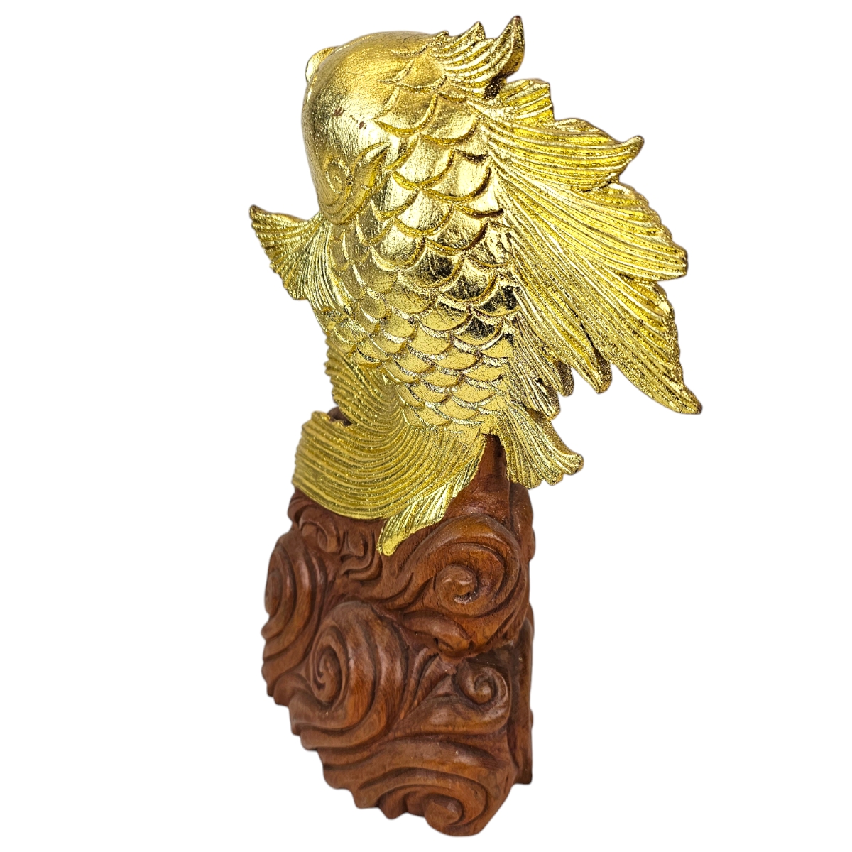 Attraktivieren Sie Ihr Zuhause mit unserem auffallend schönen, in Thailand handgefertigten, "Fisch der aus dem Wasser springt". Dieses exquisit gestaltete Kunstwerk ist aus hochwertigem Holz gefertigt und in einem luxuriösen Goldton bemalt, der jedem Raum einen Hauch von Raffinesse und Eleganz verleiht. Darüber hinaus symbolisiert dieser goldene Fisch das Glück, was ihn zu einem perfekten Geschenk oder zu einer wertvollen Ergänzung Ihrer eigenen Sammlung macht. Erwecken Sie Ihre Inneneinrichtung mit diesem spektakulären Stück zum Leben und lassen Sie sich von seinem Charme verzaubern. Der Fisch, der aus dem Wasser springt, ist mehr als nur eine Dekoration - er ist ein Omen für Wohlstand und Glück.