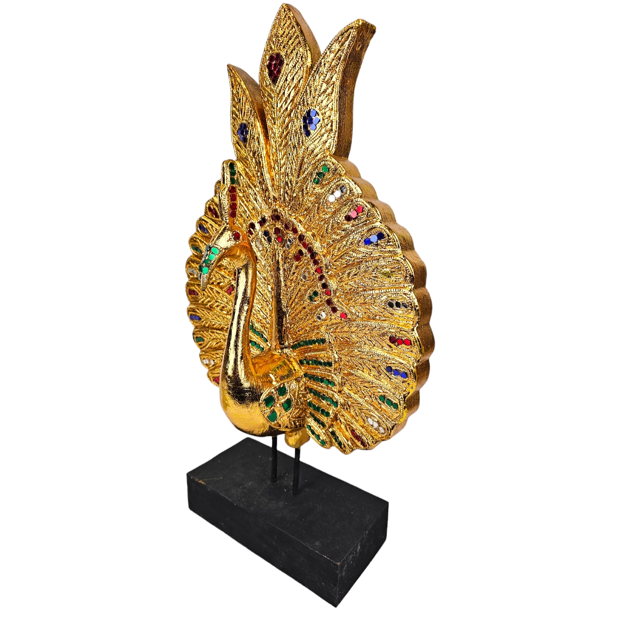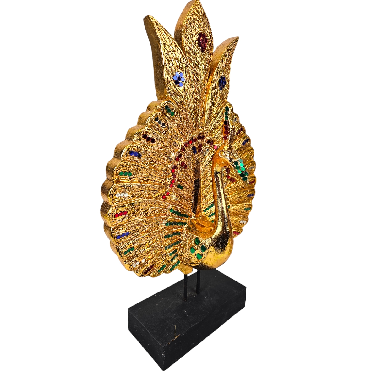 Entzücken Sie Ihre Sinne und füllen Sie Ihr Zuhause mit einem Hauch von serener Eleganz mit unserem "Glücks Pfau" - einem handgefertigten Meisterwerk direkt aus Thailand. Dieses exquisite Produkt, sorgfältig aus Holz geschnitzt, verströmt den Charme und die Herrlichkeit der thailändischen Handwerkskunst. Bedeckt in einer atemberaubenden goldenen Farbe, spiegelt dieser Pfau nicht nur die Pracht der Natur wider, sondern bringt auch eine Aura von Glück und Wohlstand in Ihr Zuhause. Die funkelnden Mosaiksteine, die kunstvoll auf dem gesamten Körper des Pfaus platziert sind, fügen einen Hauch von Opulenz und Raffinesse hinzu, der sicherlich die Aufmerksamkeit aller auf sich zieht. Der Glücks Pfau ist nicht nur ein Ausdruck von Schönheit und Luxus, sondern symbolisiert auch Wohlstand und Glück - eine perfekte Ergänzung für jedes Heim oder Büro. Verschenken Sie es als einzigartiges Geschenk oder gönnen Sie sich selbst dieses exquisite Kunstwerk. Machen Sie Ihr Zuhause mit unserem Glücks Pfau einzigartig und spektakulär! Für jeden, der die Kunst und Kultur Thailands schätzt, ist der Glücks Pfau eine unwiderstehliche Ergänzung zu Ihrer Sammlung. Setzen Sie ein Zeichen mit unserem prächtigen Glücks Pfau und lassen Sie Ihr Zuhause in neuer Pracht erstrahlen.