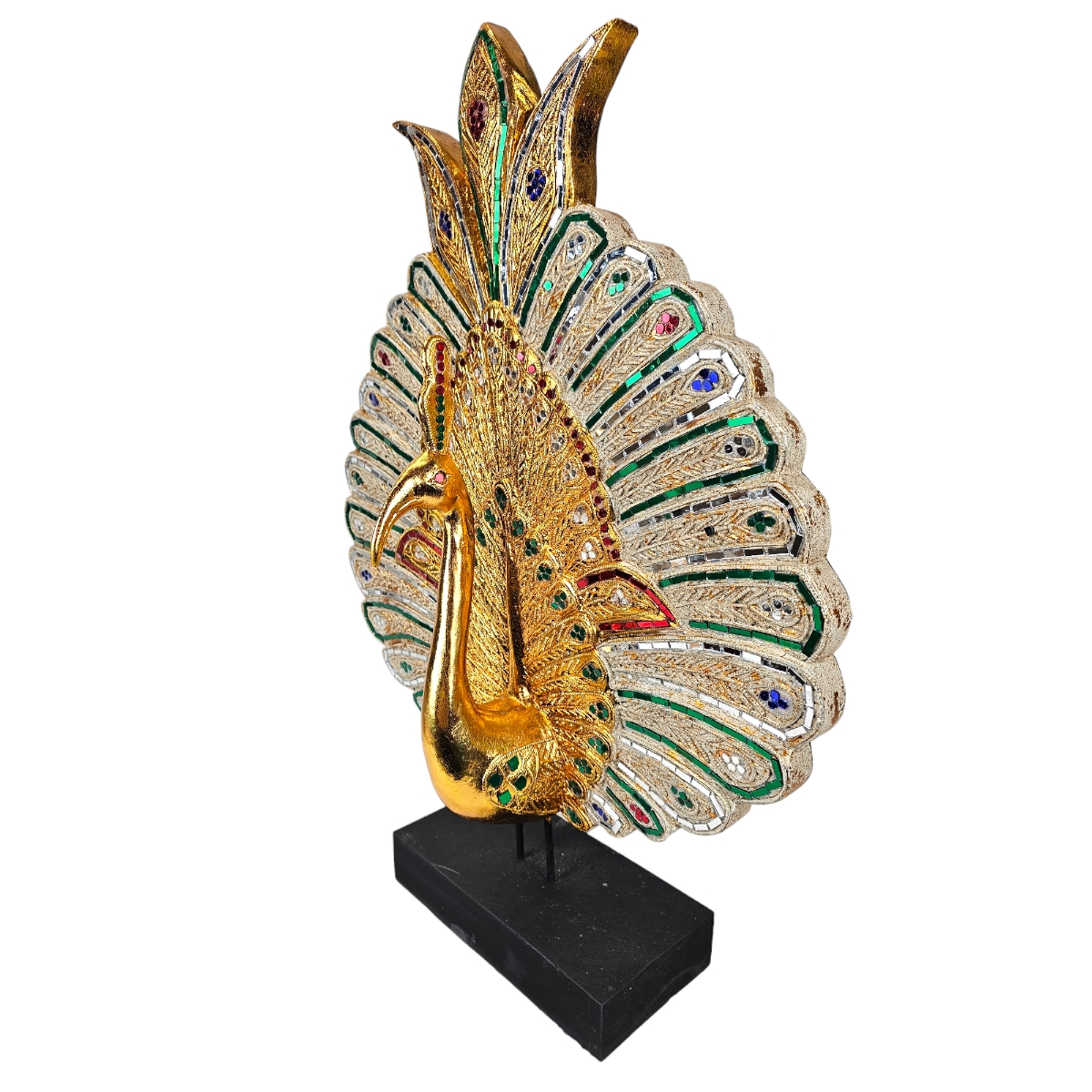 Entzücken Sie Ihre Sinne und füllen Sie Ihr Zuhause mit einem Hauch von serener Eleganz mit unserem "Glücks Pfau" - einem handgefertigten Meisterwerk direkt aus Thailand. Dieses exquisite Produkt, sorgfältig aus Holz geschnitzt, verströmt den Charme und die Herrlichkeit der thailändischen Handwerkskunst. Bedeckt in einer atemberaubenden weiß goldenen Farbe, spiegelt dieser Pfau nicht nur die Pracht der Natur wider, sondern bringt auch eine Aura von Glück und Wohlstand in Ihr Zuhause. Die funkelnden Mosaiksteine, die kunstvoll auf dem gesamten Körper des Pfaus platziert sind, fügen einen Hauch von Opulenz und Raffinesse hinzu, der sicherlich die Aufmerksamkeit aller auf sich zieht. Der Glücks Pfau ist nicht nur ein Ausdruck von Schönheit und Luxus, sondern symbolisiert auch Wohlstand und Glück - eine perfekte Ergänzung für jedes Heim oder Büro. Verschenken Sie es als einzigartiges Geschenk oder gönnen Sie sich selbst dieses exquisite Kunstwerk. Machen Sie Ihr Zuhause mit unserem Glücks Pfau einzigartig und spektakulär! Für jeden, der die Kunst und Kultur Thailands schätzt, ist der Glücks Pfau eine unwiderstehliche Ergänzung zu Ihrer Sammlung. Setzen Sie ein Zeichen mit unserem prächtigen Glücks Pfau und lassen Sie Ihr Zuhause in neuer Pracht erstrahlen.
