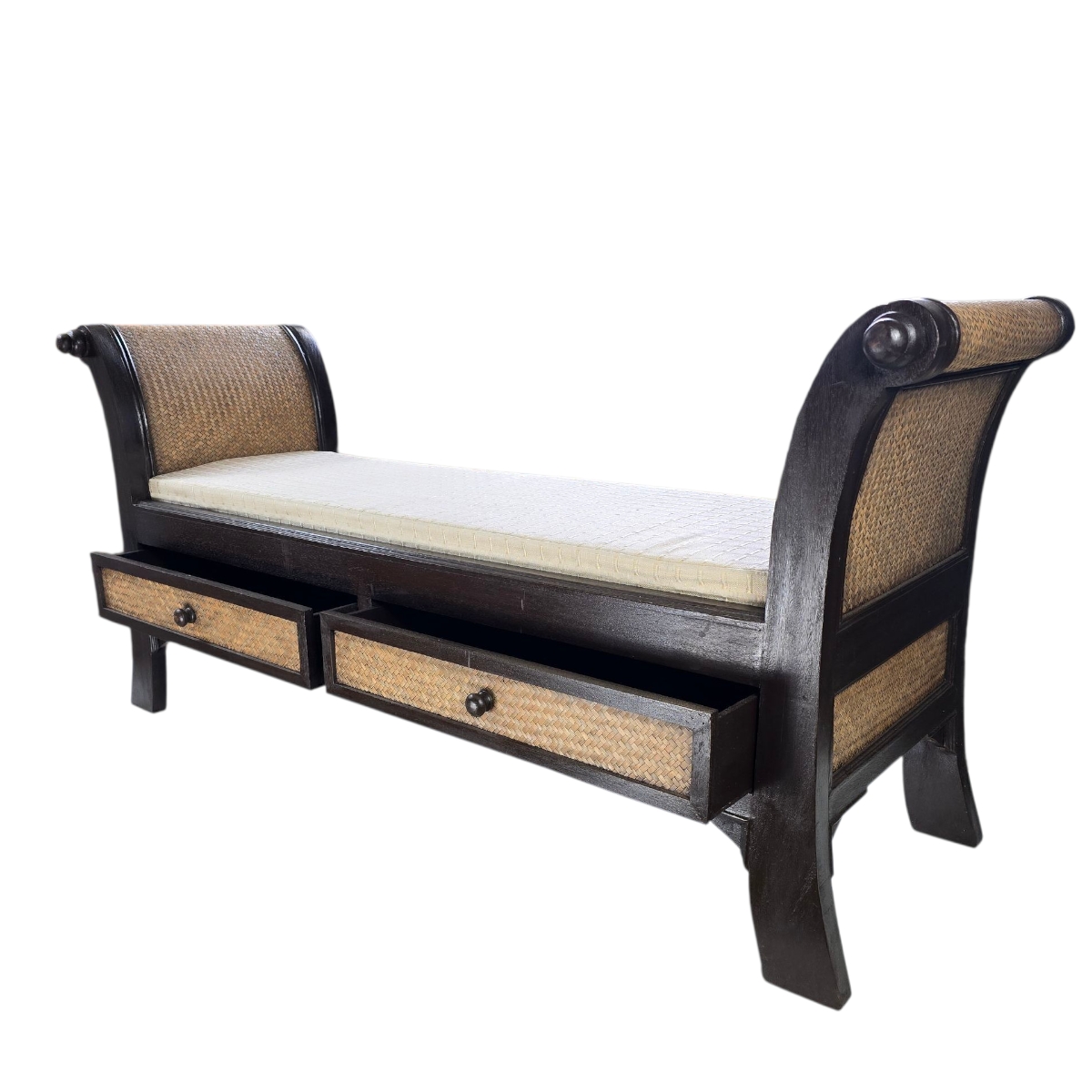 Unsere Rattan Sitzbank überzeugt durch ihr ansprechendes Design in einer warmen, braunen Farbe, die jedem Raum eine einladende Atmosphäre verleiht. Das Gestell der Bank ist aus hochwertigem Holz gefertigt und garantiert Stabilität sowie Langlebigkeit. Die Seitenteile und die Fronten der beiden großzügigen Schubladen sind mit feinem Rattan bezogen, was dem Möbelstück eine natürliche und gleichzeitig elegante Optik verleiht.