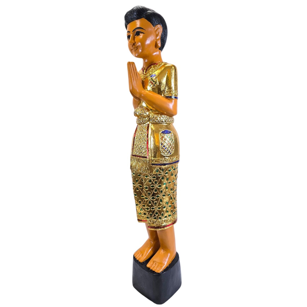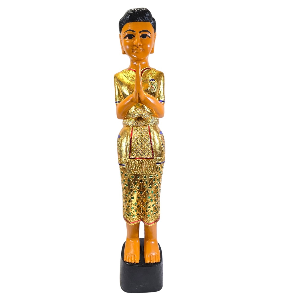 - Schwarze Haare: Die Figur ist mit traditionell schwarzen Haaren versehen, die die klassische Eleganz und Anmut thailändischer Statuen widerspiegeln.