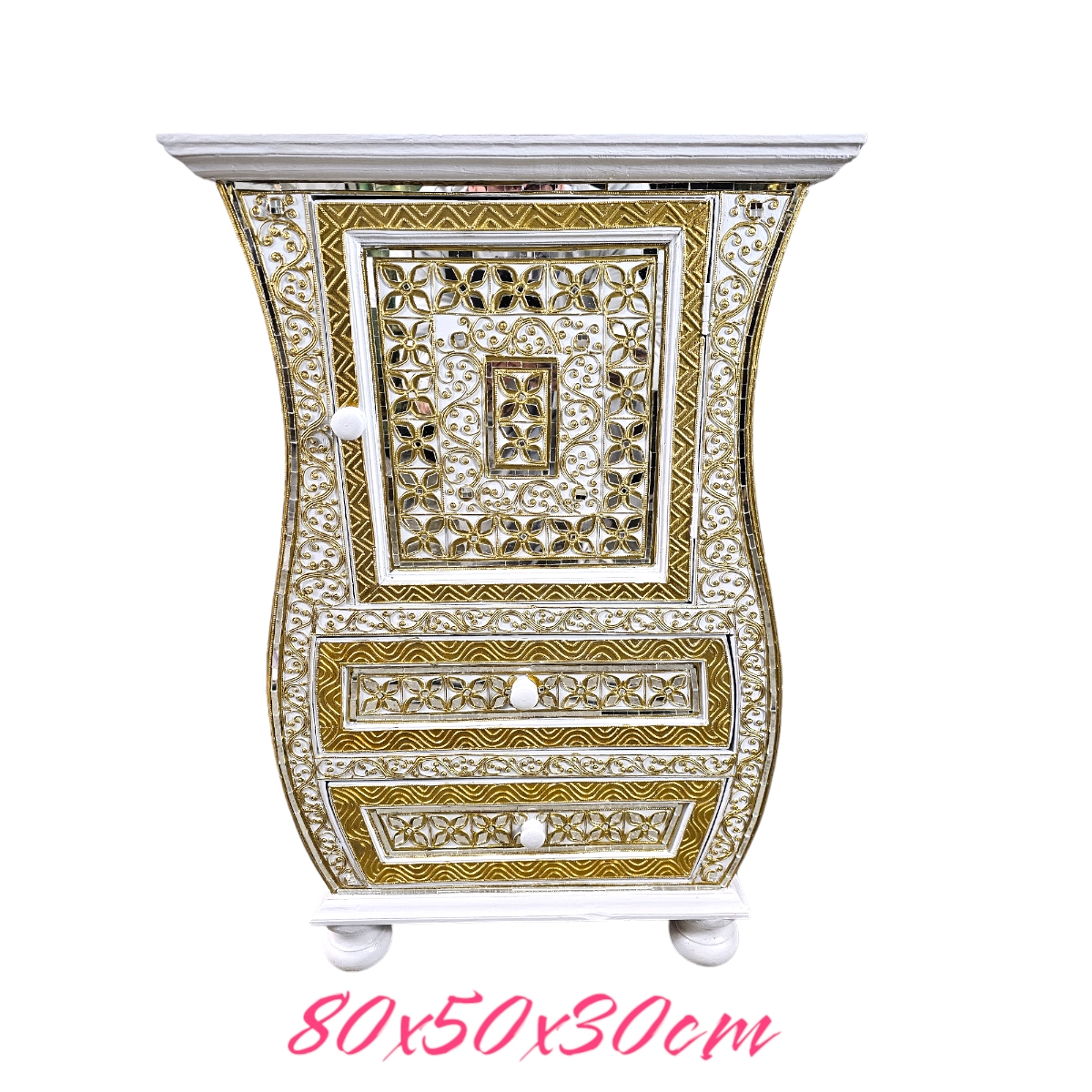 Ergreifen Sie diese Gelegenheit und fügen Sie Ihrer Inneneinrichtung eine Prise Eleganz und Raffinesse hinzu. Entdecken Sie unseren Schrank Weiß/Gold, handgefertigt in Thailand: eine perfekte Kombination aus kompromissloser Funktionalität und unvergleichlicher Schönheit. Mit glitzernden Goldakzenten, die auf seinem makellos weißen Hintergrund hervorstechen, wird dieser Schrank sicherlich zu einem wahren Blickfang in Ihrem Zuhause. Er dient nicht nur zur Aufbewahrung, sondern setzt auch ein beeindruckendes Stilelement. Genießen Sie die Faszination und den Charme, den er ausstrahlt, während er mühelos Komplimente von Ihren Gästen erntet. Unser Schrank Weiß/Gold - das perfekte Highlight für eine schicke und stilvolle Einrichtung.