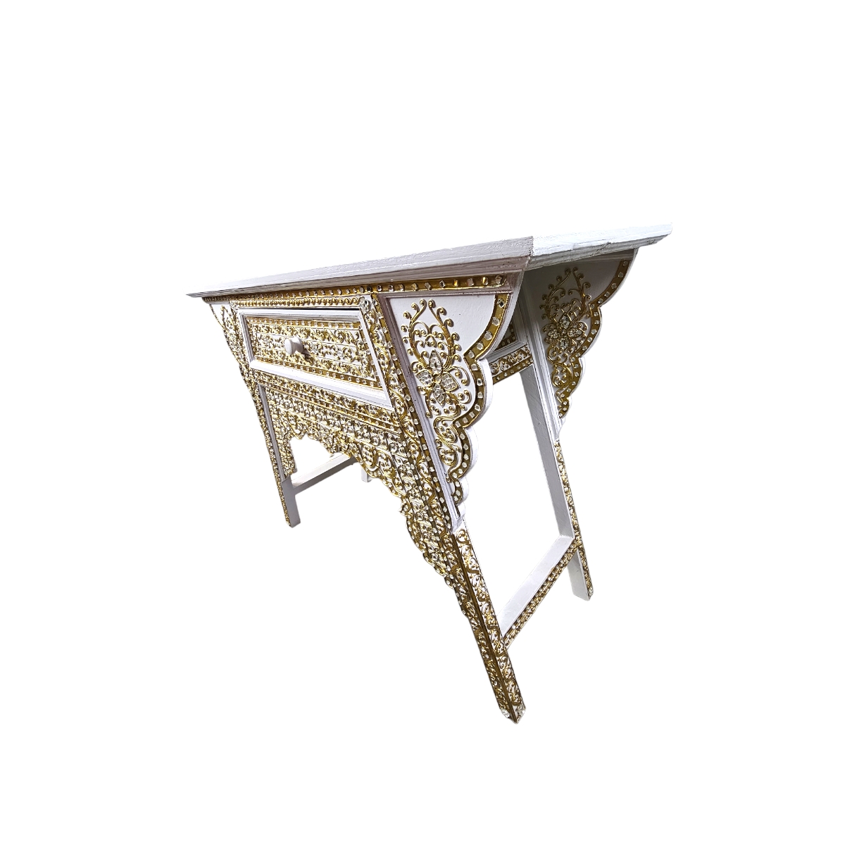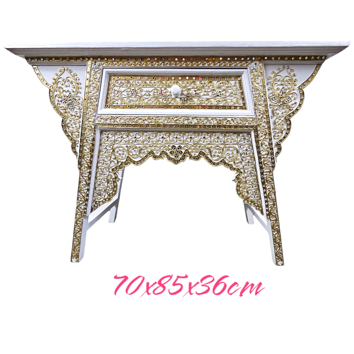 Ergreifen Sie diese Gelegenheit und fügen Sie Ihrer Inneneinrichtung eine Prise Eleganz und Raffinesse hinzu. Entdecken Sie unseren Schrank Weiß/Gold, handgefertigt in Thailand: eine perfekte Kombination aus kompromissloser Funktionalität und unvergleichlicher Schönheit. Mit glitzernden Goldakzenten, die auf seinem makellos weißen Hintergrund hervorstechen, wird dieser Schrank sicherlich zu einem wahren Blickfang in Ihrem Zuhause. Er dient nicht nur zur Aufbewahrung, sondern setzt auch ein beeindruckendes Stilelement. Genießen Sie die Faszination und den Charme, den er ausstrahlt, während er mühelos Komplimente von Ihren Gästen erntet. Unser Schrank Weiß/Gold - das perfekte Highlight für eine schicke und stilvolle Einrichtung.