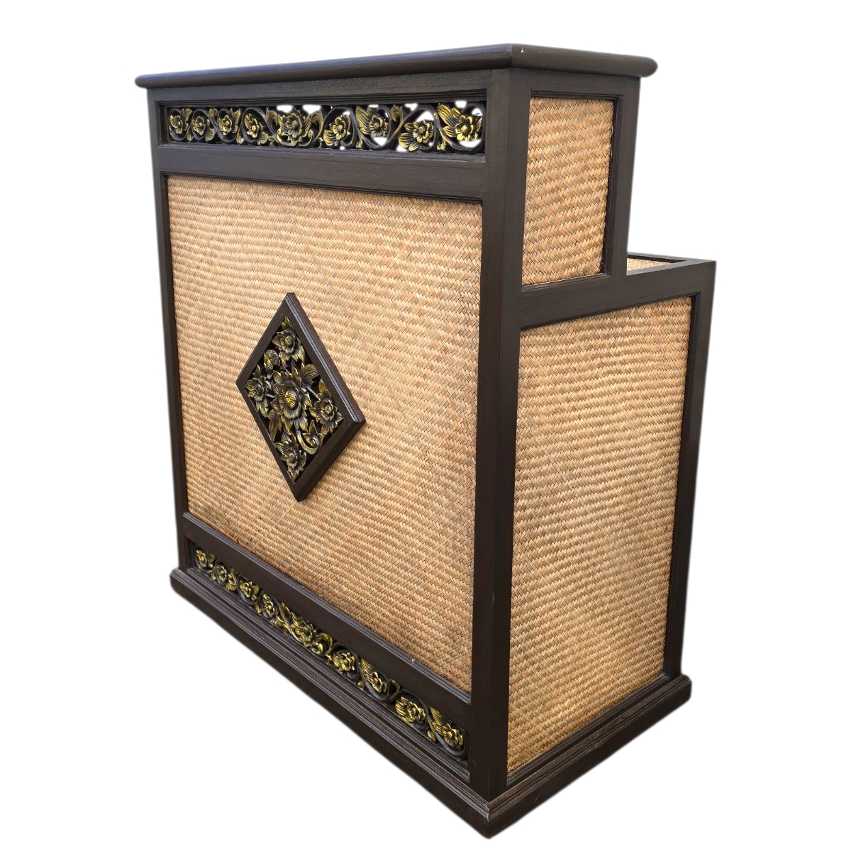 - Einzigartiges Design: Die Seitenwände und die Oberfläche sind mit hochwertigem Rattan gefertigt und verleihen jedem Raum eine natürliche und warme Atmosphäre. Die Vorderseite des Tresens ist mit einem kunstvollen Relief verziert und bietet einen ansprechenden Blickfang.