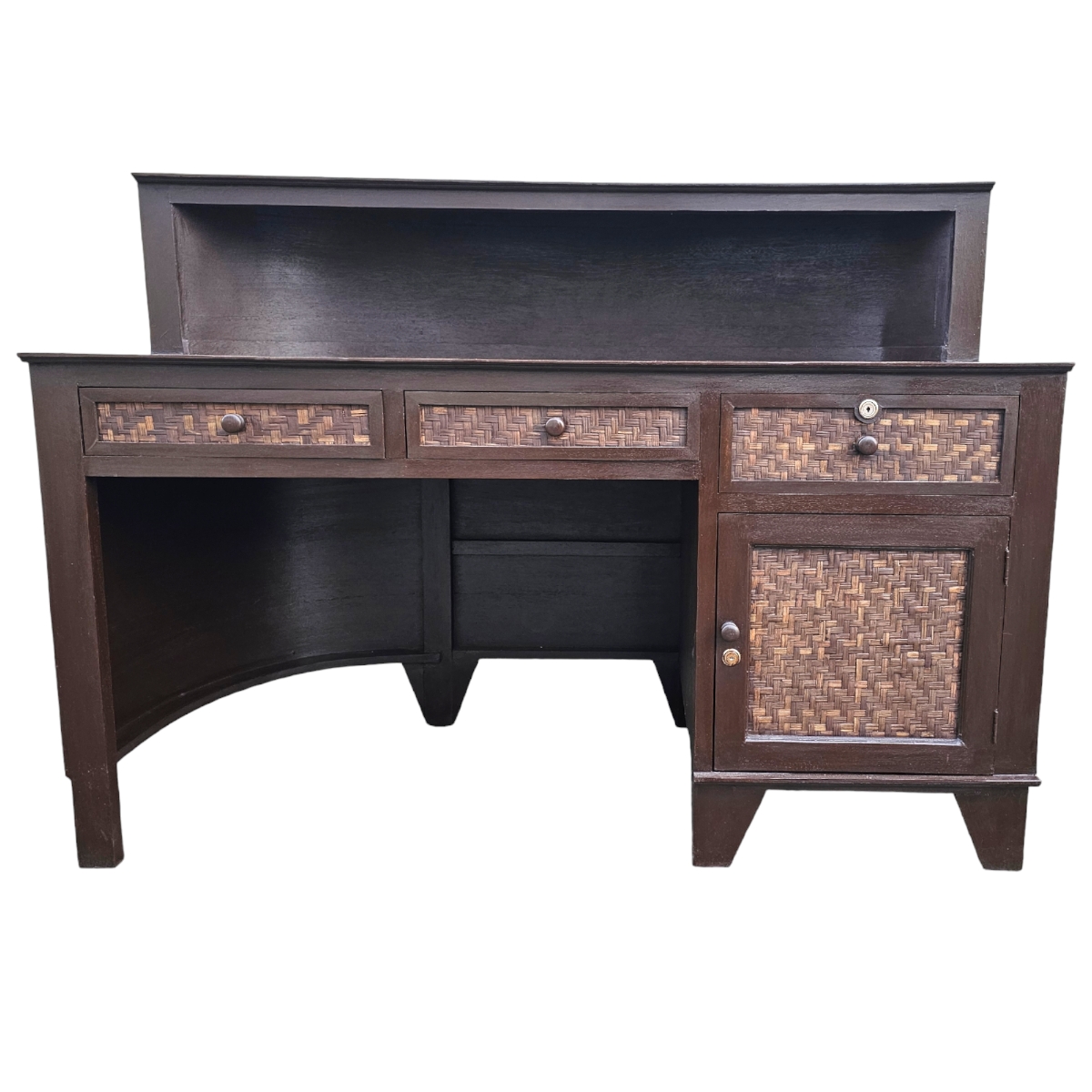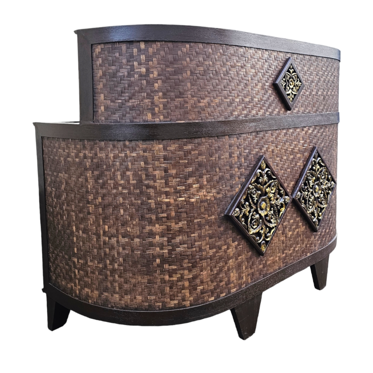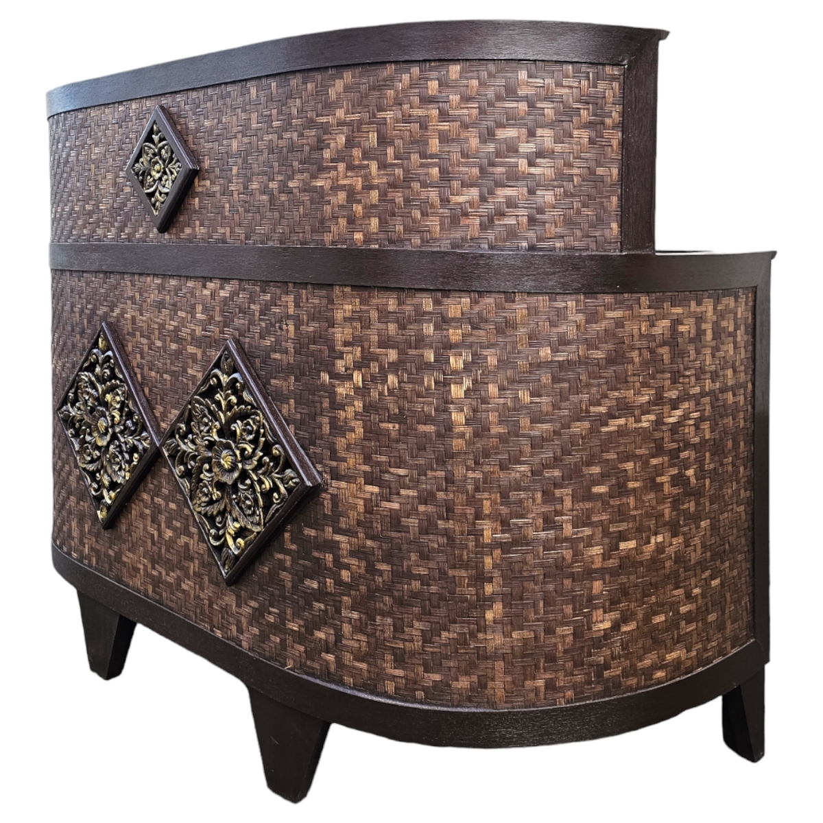 Entdecken Sie den Charme handgefertigter Perfektion mit unserem exquisiten Tresen, direkt aus den kunstvollen Händen thailändischer Handwerker. Dieses außergewöhnliche Möbelstück beeindruckt durch seine elegante, halbrunde Form, die sich nahtlos in jedes Raumkonzept einfügt – perfekt für Ihr Wohnzimmer, Ihre Küche oder den Eingangsbereich. Der stabile Rahmen aus hochwertigem Holz verspricht Langlebigkeit und Stabilität, während die mit Rattan bezogenen Flächen dem Tresen eine natürliche, warme Ausstrahlung verleihen. Rattan, bekannt für seine Robustheit, verbindet Tradition mit modernem Design und macht jedes Stück zu einem Unikat. Funktionalität trifft auf Ästhetik: Ausgestattet mit drei praktischen Schubladen und einem großzügigen Unterschrank bietet dieser Tresen ausreichend Stauraum für all Ihre Bedürfnisse. Die Frontseite wird durch zwei kunstvoll gestaltete Reliefs verziert, die dem Möbelstück einen Hauch von thailändischer Kultur und Handwerkskunst verleihen. Ob als stilvoller Empfang im Eingangsbereich oder als funktionales Highlight in Ihrer Küche, dieser handgefertigte Tresen ist mehr als nur ein Möbelstück – er ist eine Investition in Qualität und Design, die den Test der Zeit bestehen wird. Verleihen Sie Ihrem Zuhause ein Stück thailändischer Tradition und genießen Sie die Kombination aus Stil und Funktionalität.