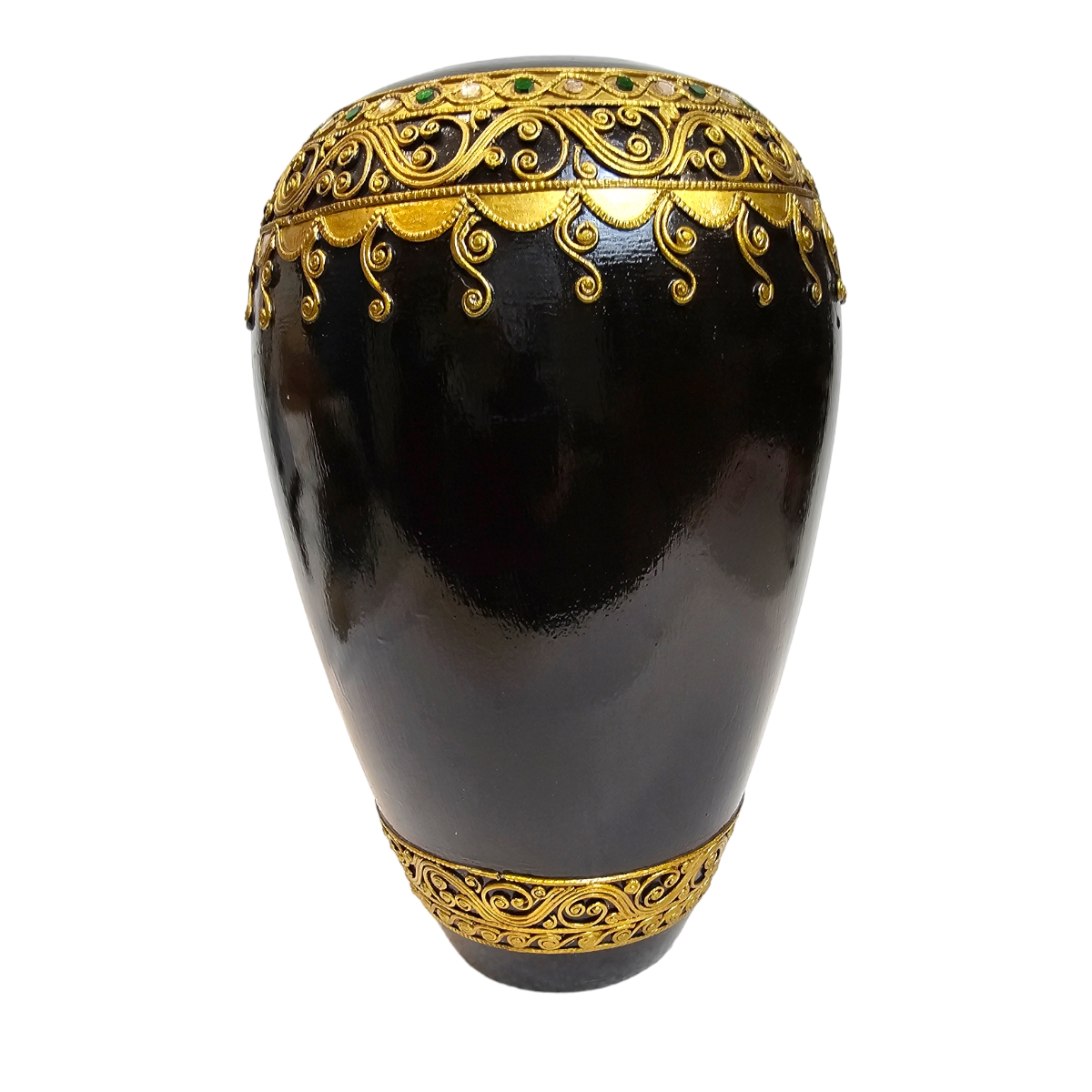 Erwecken Sie die Schönheit thailändischer Handwerkskunst in Ihrem Zuhause mit diesem exquisiten Holzvase. Mit Liebe handgefertigt und kunstvoll bemalt in edlem Schwarz, zeichnet sich dieses Produkt durch seine hervorragende Qualität und Detailgenauigkeit aus. Veredelt ist sie mit eleganten goldenen Verzierungen und verziert mit schimmernden Mosaiksteinen, die im Licht funkeln. Diese besondere Vase ist nicht nur ein praktisches Wohnaccessoire zum Aufstellen von Blumen und Zweigen, sondern auch ein echter Hingucker und eine exquisite Bereicherung für jeden Wohnraum. Erleben Sie mit dieser Vase die einzigartige Mischung aus Tradition und Moderne, die Ihr Zuhause in ein exotisches Paradies verwandelt.