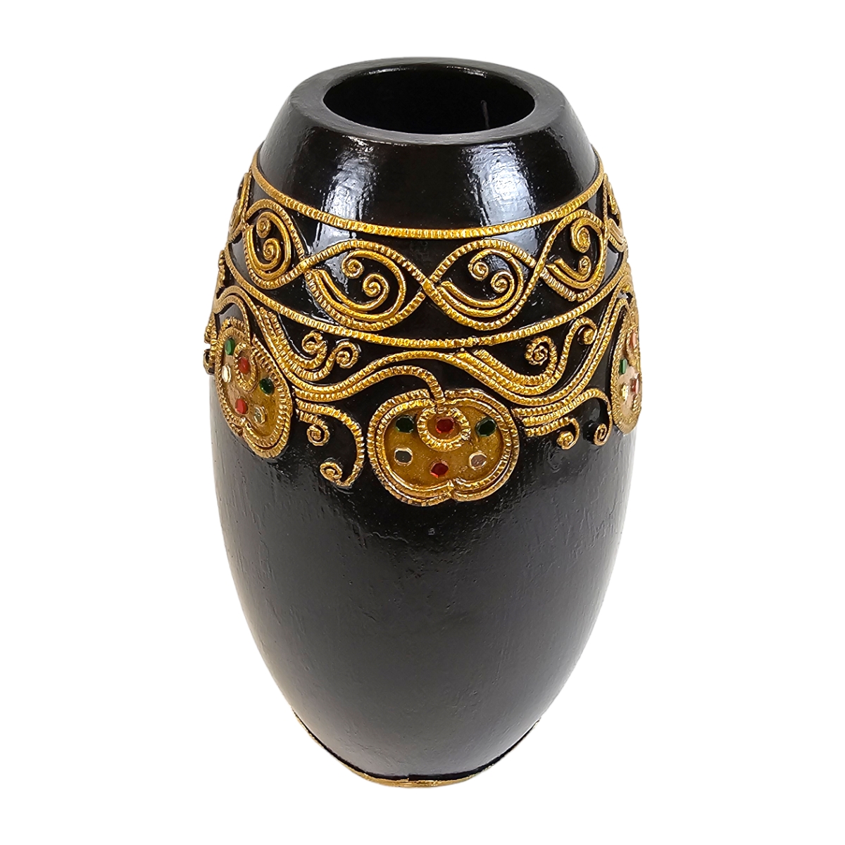 Erwecken Sie die Schönheit thailändischer Handwerkskunst in Ihrem Zuhause mit diesem exquisiten Holzvase. Mit Liebe handgefertigt und kunstvoll bemalt in edlem Schwarz, zeichnet sich dieses Produkt durch seine hervorragende Qualität und Detailgenauigkeit aus. Veredelt ist sie mit eleganten goldenen Verzierungen und verziert mit schimmernden Mosaiksteinen, die im Licht funkeln. Diese besondere Vase ist nicht nur ein praktisches Wohnaccessoire zum Aufstellen von Blumen und Zweigen, sondern auch ein echter Hingucker und eine exquisite Bereicherung für jeden Wohnraum. Erleben Sie mit dieser Vase die einzigartige Mischung aus Tradition und Moderne, die Ihr Zuhause in ein exotisches Paradies verwandelt.