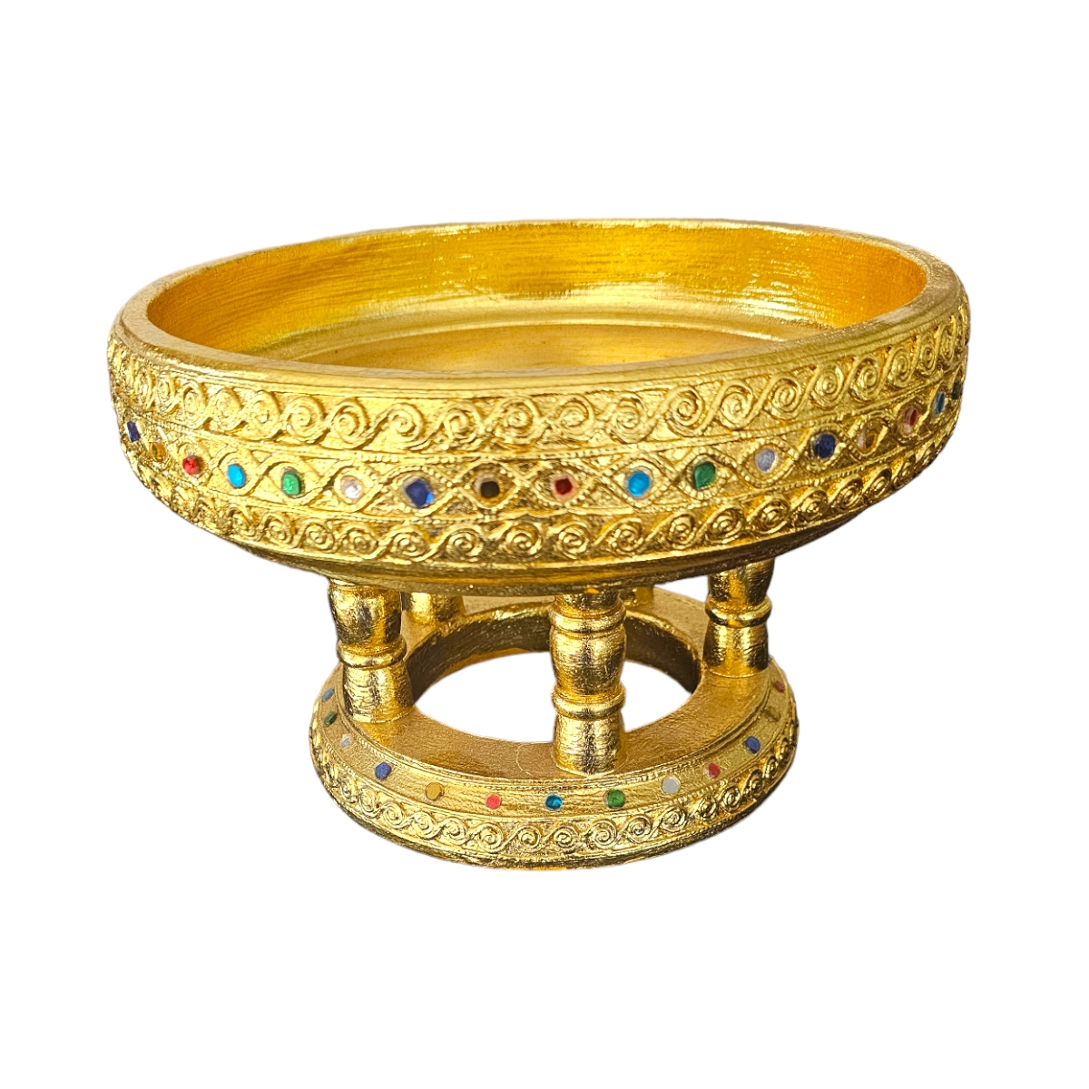 Entdecken Sie die wunderbare Welt des Öl Tablets – eine luxuriöse und elegante Ikone Thai-Handwerks. Dieses beeindruckende Tablet aus goldenem Holz ist nicht nur ein Nutzgegenstand, sondern auch ein Kunstwerk, das jeden Raum glänzen lässt. Sein Detailreichtum offenbart sich in einer aufwendigen Mosaikverzierung, die jeden Zentimeter des Tablets hervorhebt und ihm einzigartigen Glanz verleiht. Verzaubern Sie Ihre Gäste mit diesem exquisiten Dekorationsstück, das die Faszination Thailands in Ihrem Zuhause wieder spiegelt. Das Öl Tablet ein Ausdruck von Luxus und Eleganz.