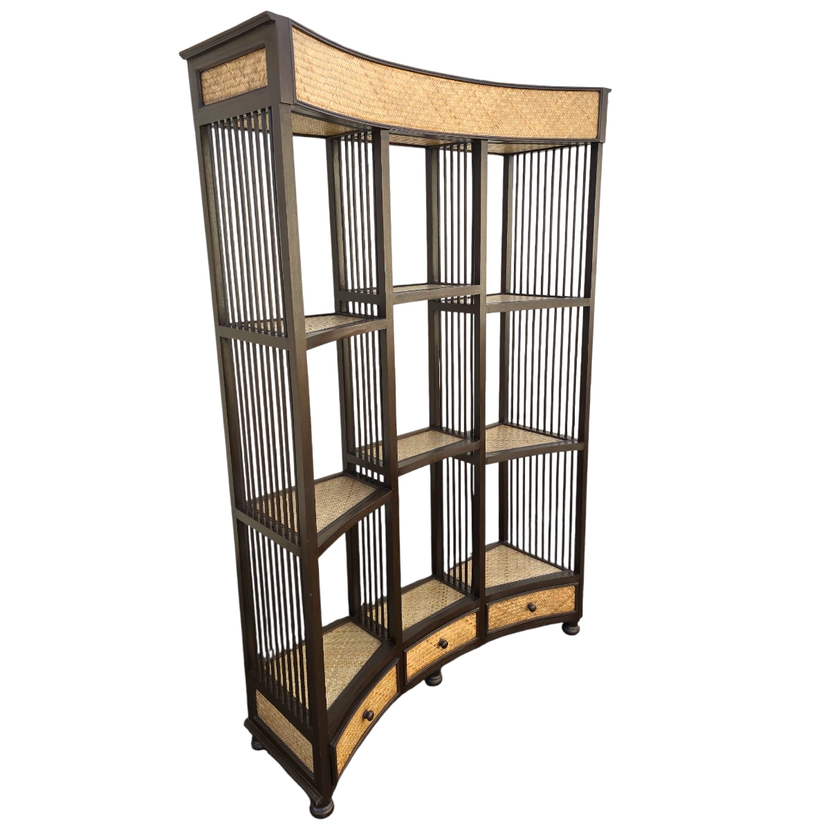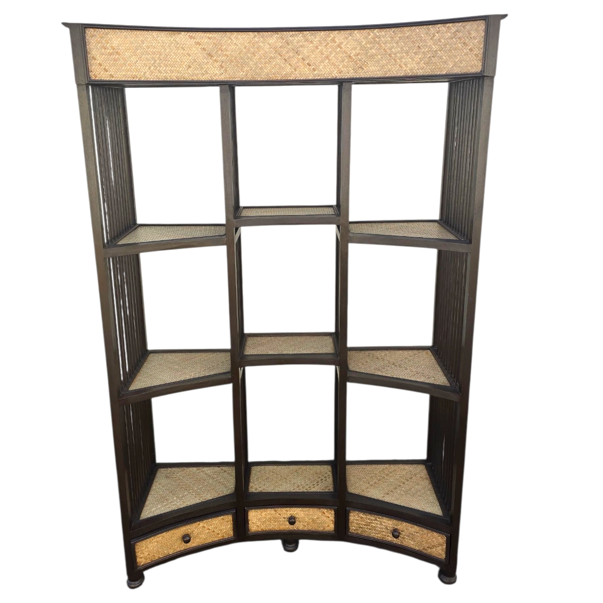 - Künstlerisch bezogene Schubladen: Die drei Schubladen sind mit kunstvollem Rattan bezogen und bieten zusätzlichen Stauraum für persönliche Gegenstände. Diese Kombination aus natürlichem Material und feinster Handwerkskunst macht die Schubladen zu einem Highlight des Regals.