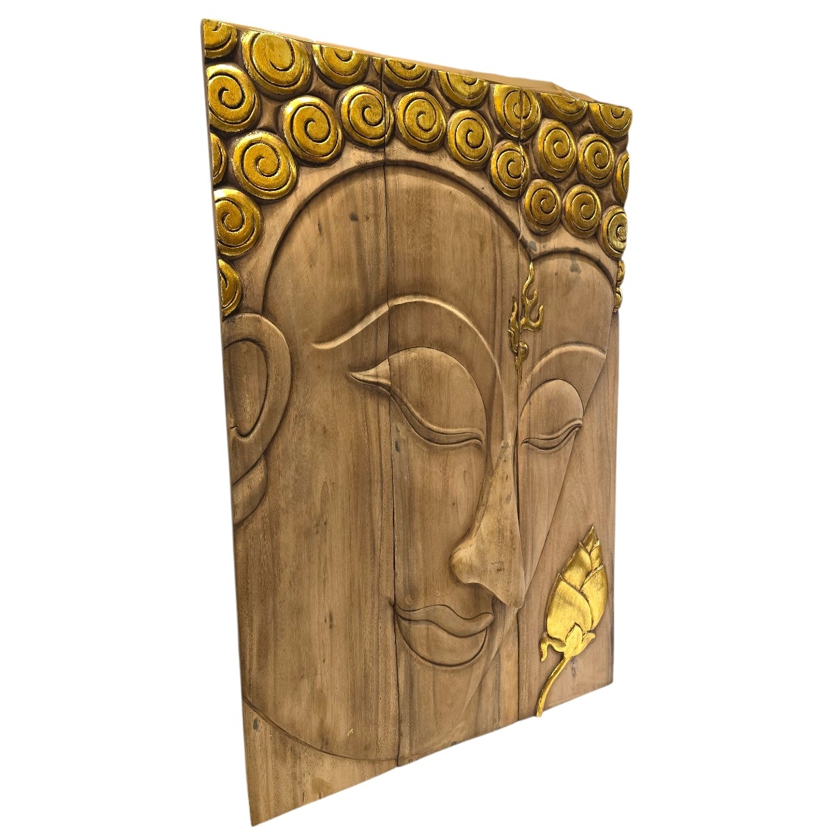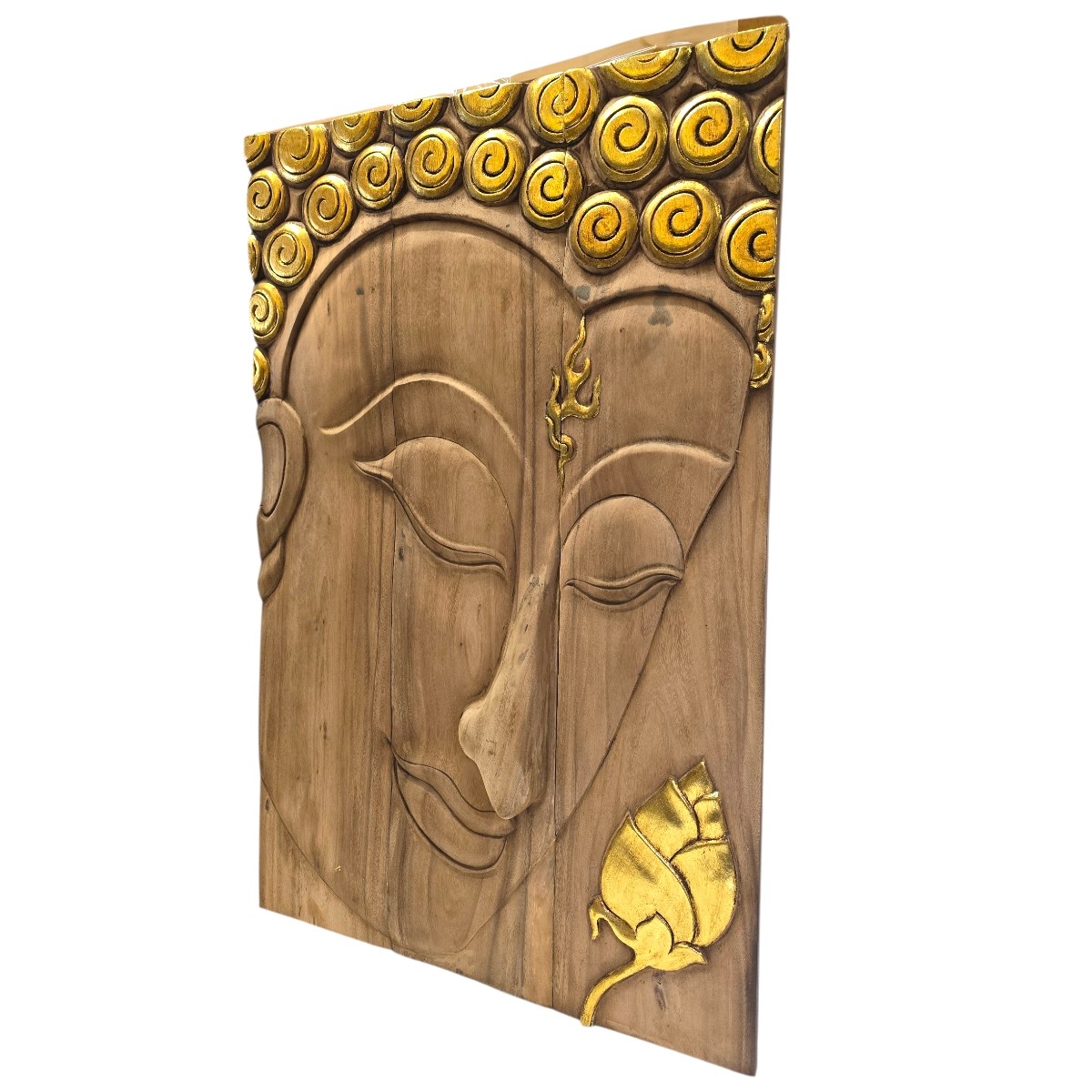 Eben Sie die Schönheit und Ruhe des Ostens in Ihrem Zuhause mit unserem exquisiten 3-teiligen Buddha Kopf Relief. Dieses handgefertigte Kunstwerk aus Thailand ist ein Meisterstück traditioneller Handwerkskunst und verkörpert die zeitlose Weisheit und Gelassenheit Buddhas. Produktmerkmale: Handgefertigt in Thailand: Jedes Stück wird mit größter Sorgfalt und Fachkenntnis von erfahrenen thailändischen Kunsthandwerkern gefertigt, die ihre Leidenschaft und ihr Talent in jedes Detail einfließen lassen. Aufwendige Schnitzerei: Der Buddha Kopf besticht durch seine filigrane und detaillierte Schnitzerei, die eine beeindruckende Tiefe und Lebendigkeit erzeugt. 3-teilige Gestaltung: Das Relief besteht aus drei Teilen, die eine vielseitige Präsentation an Ihrer Wand ermöglichen und jedem Raum eine ansprechende Dimension verleihen. Goldene Akzente: Dezente goldene Akzente fügen einen Hauch von Eleganz hinzu und verleihen dem Buddha Kopf einen edlen Glanz, der das Licht wunderbar reflektiert. Dieses atemberaubende Kunstwerk ist nicht nur ein Blickfang, sondern auch eine Quelle der Inspiration und Ruhe. Perfekt für Wohnräume, Meditationsbereiche oder als einzigartiges Geschenk für Liebhaber asiatischer Kultur. Bereichern Sie Ihr Heim mit diesem Symbol der inneren Harmonie und Gelassenheit.