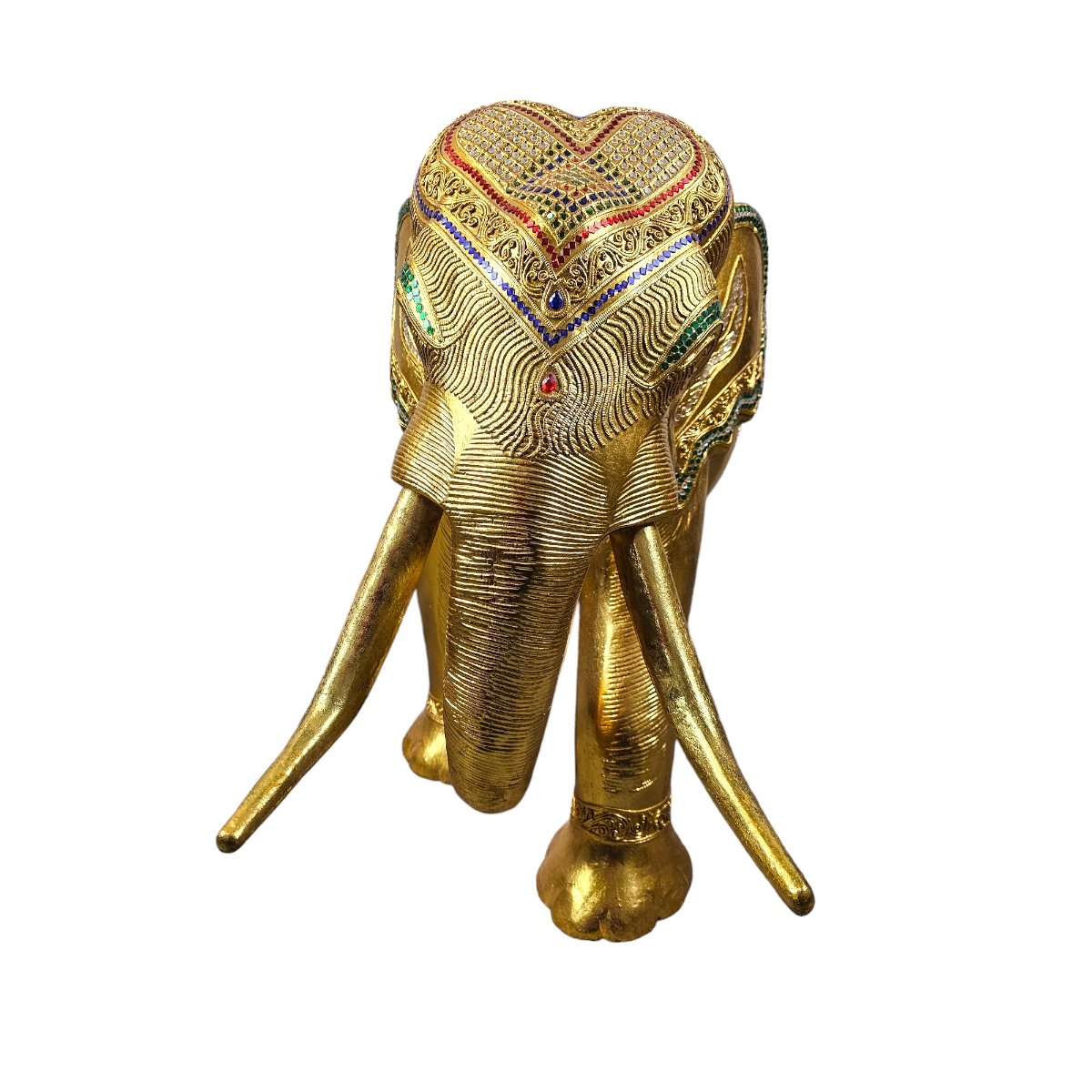 Dieser handgefertigte Elefant aus Holz ist nicht nur ein bemerkenswertes Kunstwerk, sondern auch ein Hauch von Exotik für Ihr Zuhause. Mit seiner goldenen Farbe und den sorgfältig angeordneten Mosaiksteinen strahlt er eine eindrucksvolle Pracht aus, die sicherlich die Aufmerksamkeit aller Betrachter auf sich zieht. In mühevoller Handarbeit in Thailand gefertigt, spiegelt jeder Zentimeter dieses atemberaubenden Stücks die unvergleichliche Kunstfertigkeit seiner Hersteller wider. Der Elefant symbolisiert in der thailändischen Kultur Stärke, Weisheit und Ausdauer und repräsentiert damit überzeugende Werte, die in jedes Zuhause integriert werden können. Dieser Holzelefant ist nicht nur ein Dekorationsobjekt, er erzählt auch eine Geschichte. Die individuelle Gestaltung von jedem einzelnen Mosaikstein lässt dieses Kunstwerk lebendig und einzigartig wirken, fast so, als ob ein Stück thailändische Kultur direkt zu Ihnen nach Hause geliefert würde.