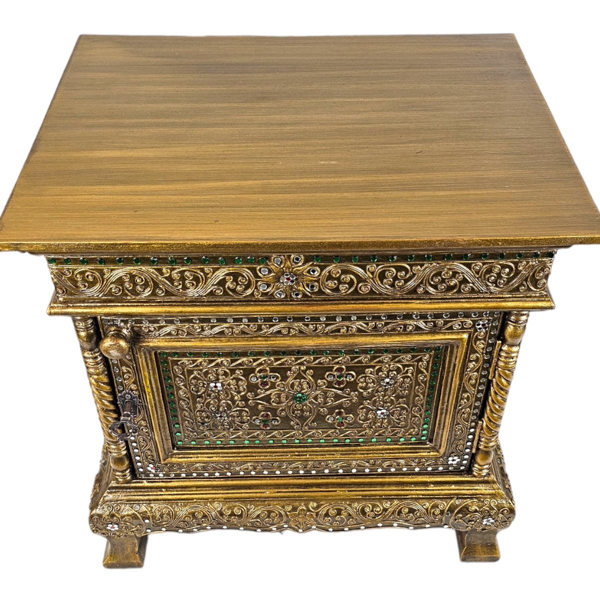 Erfreuen Sie sich an der außergewöhnlichen Schönheit dieser handgefertigten Kommode aus Thailand. Jedes Stück ist ein Unikat, individuell gestaltet und mit viel Liebe zum Detail verziert. Die goldene Farbe verleiht der Kommode ein luxuriöses Aussehen, während die Mosaiksteine auf dem Nachttisch für einen einzigartigen, künstlerischen Touch sorgen. Diese Kommode ist nicht nur ein Möbelstück, sondern auch eine beeindruckende Präsentation von Kunst und Handwerk, die jedes Zuhause bereichert.
