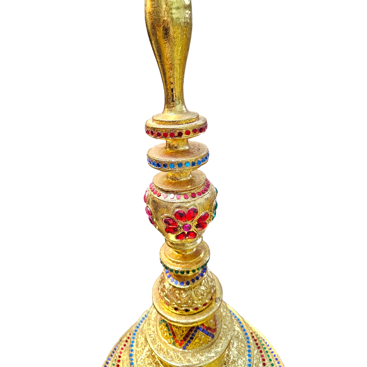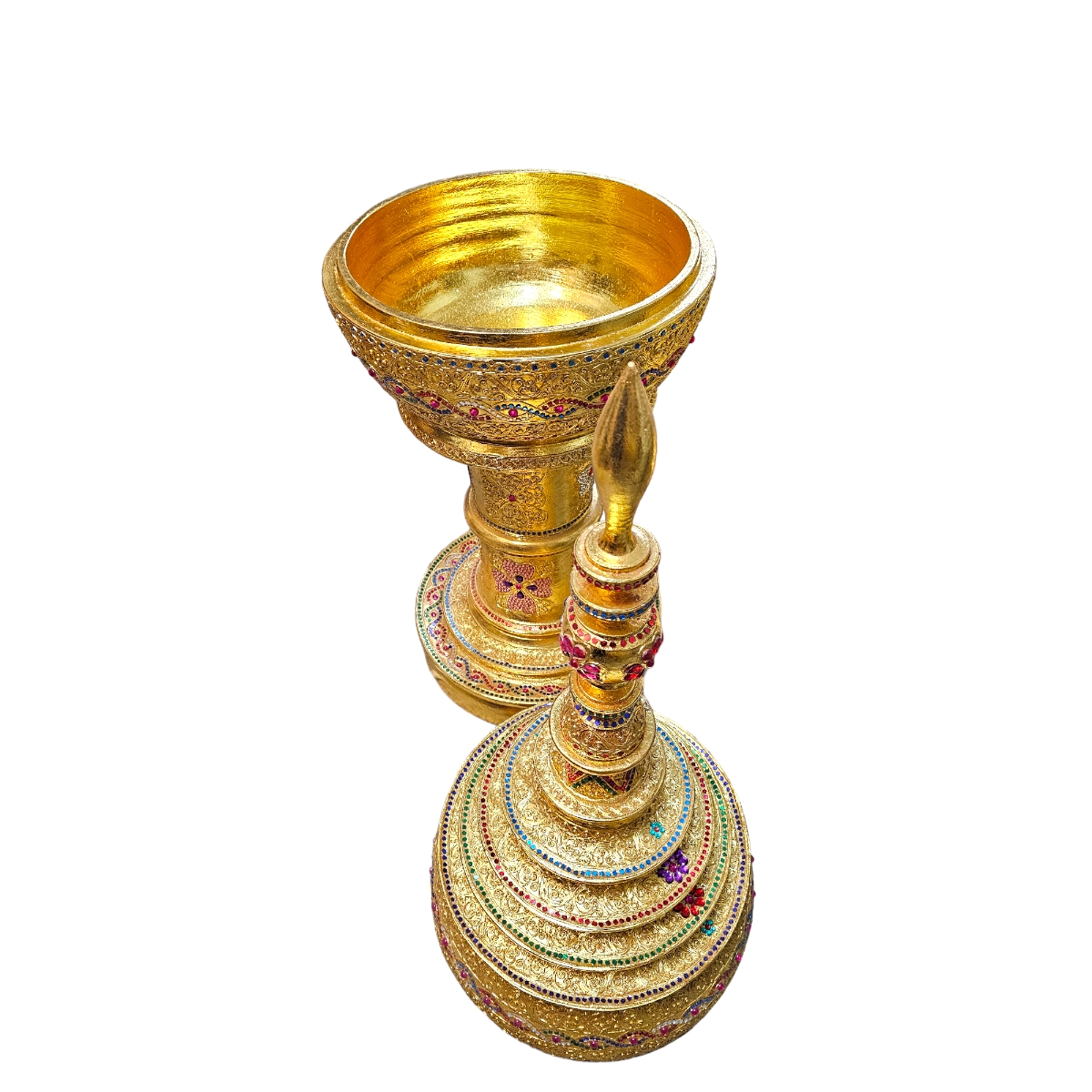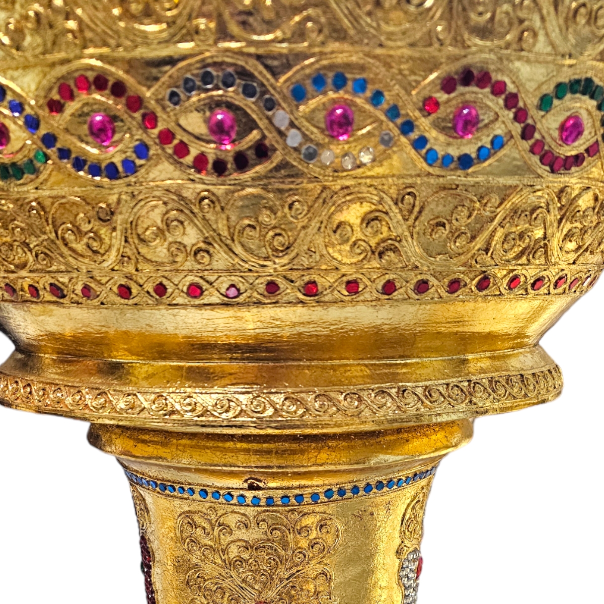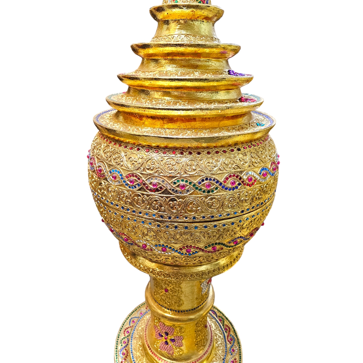 Eintauchen in die majestätische Welt der Kunst und Handwerkskunst mit Pha-Ob, unserer goldenen Skulptur. Diese aufwändig gefertigte Skulptur ist nicht nur sehr groß - sie ist ein echtes Statement Piece und zeugt von fantastischem Kunsthandwerk. Gefertigt aus robustem Holz in Thailand, zeichnet sie sich durch hervorragende Handwerkskunst und Liebe zum Detail aus. Ihr abnehmbarer Deckel fügt eine zusätzliche Dimension der Einzigartigkeit hinzu. Geziert mit funkelnden Mosaiksteinen, die im Licht schillern, bietet diese Skulptur einen faszinierenden Blickpunkt für jeden Raum. Der Goldton verleiht der Skulptur zusätzlich ein Gefühl von Luxus und Prestige. Entdecken Sie mit Pha-Ob die Exzellenz von handgefertigter Kunst - ein Schmuckstück, das in Ihrem Zuhause zweifellos Bewunderung erntet.