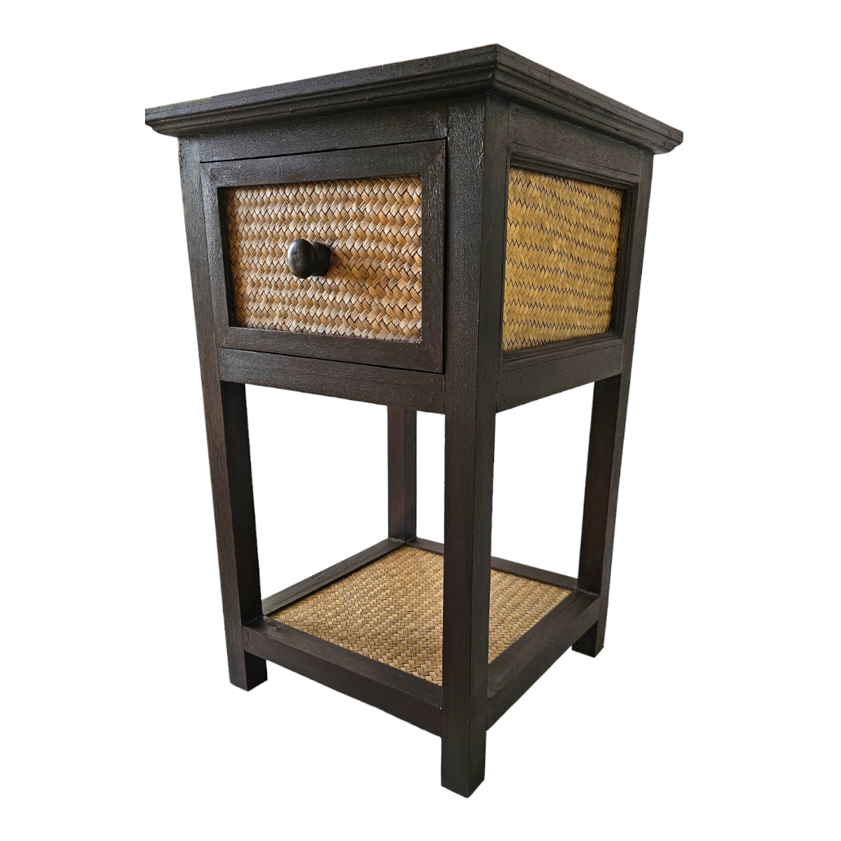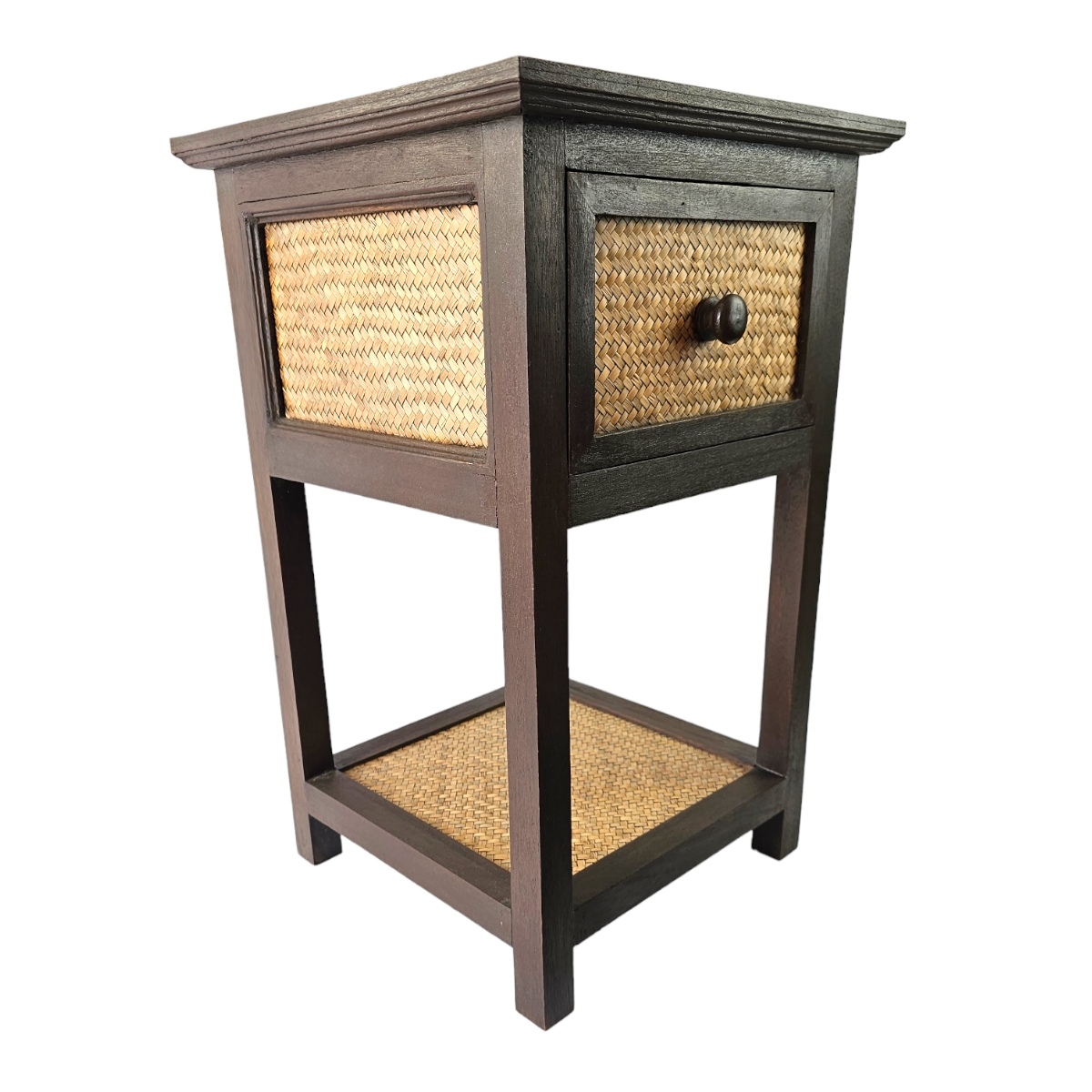 Entdecken Sie die Faszination von Handarbeit aus dem Herzen Thailands. Diese luxuriöse Kommode aus Rattan ist ein Meisterwerk, das handgefertigt wurde, um Ihrem Zuhause eine einzigartige und stilvolle Note zu verleihen. Die dunkelholzigen Rahmen verleihen der Kommode einen edlen, robusten Charakter, während die Rattanschublade für funktionale Schönheit und Praktikabilität sorgt. Stellen Sie es neben Ihr Bett als charmanten Nachttisch oder im Wohnzimmer als stilvollen Akzent. Diese beeindruckende Kommode zieht alle Blicke auf sich und verschönert jeden Raum mit ihrer eleganten Ausstrahlung. Shoppen Sie jetzt und verleihen Sie Ihrem Zuhause einen Hauch thailändischer Handwerkskunst.