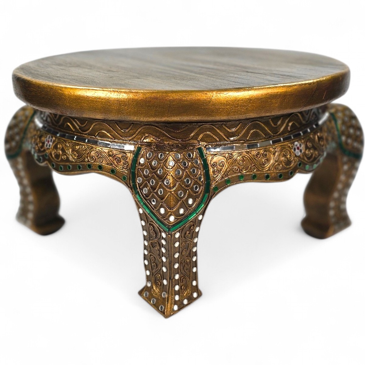 Entdecken Sie den Charme und die Tradition thailändischer Handwerkskunst mit unserem runden Beistelltisch, der Ihrem Zuhause einen Hauch von Exklusivität verleiht. Gefertigt aus hochwertigem Holz, präsentiert sich der Tisch in einer dunkel goldenen Farbe, die Wärme und Eleganz ausstrahlt.