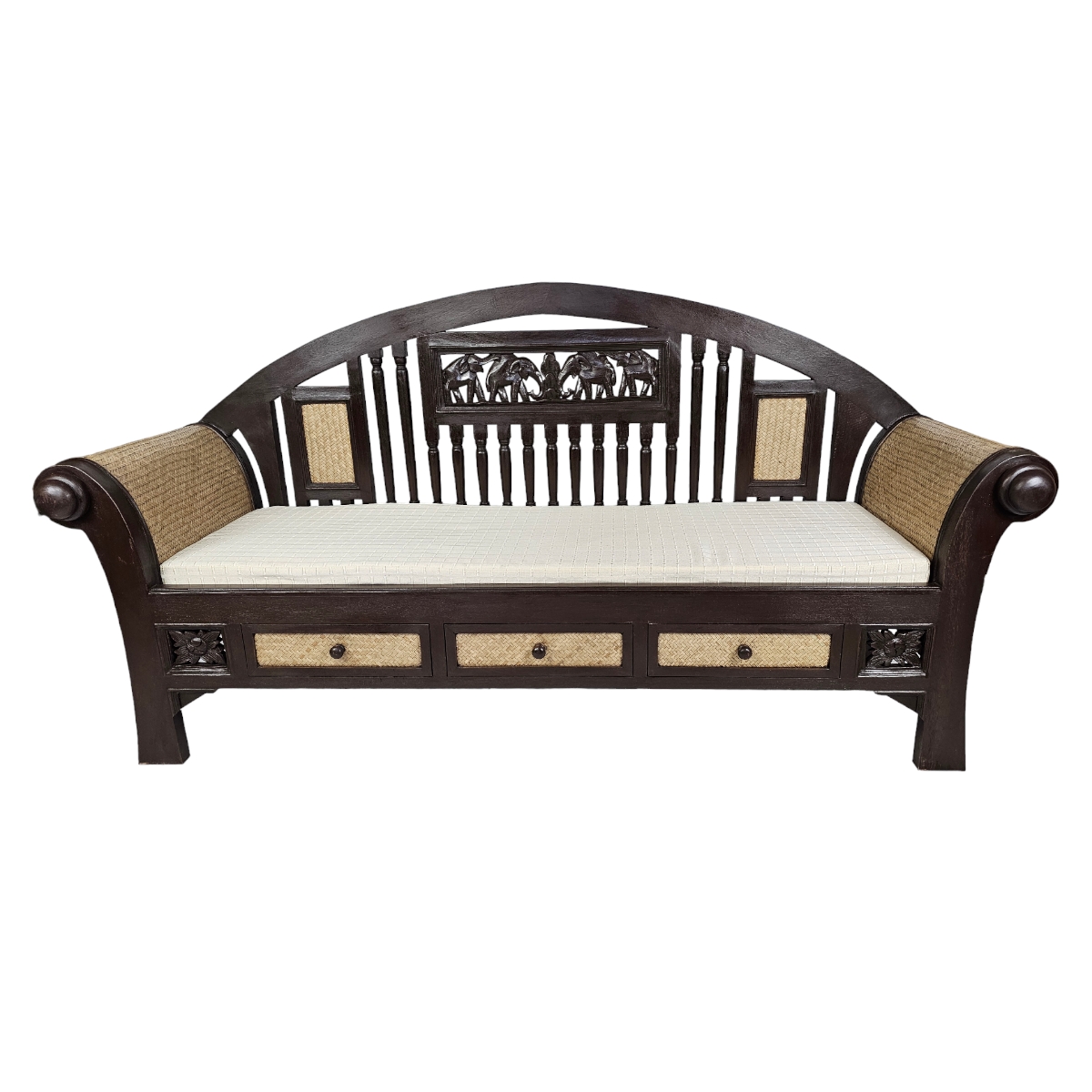 Entdecken Sie exotischen Charme und unvergleichlichen Komfort mit unserem handgefertigten Sofa aus Thailand. Jedes Stück ist einzigartig gefertigt aus hochwertigem Holz, das langlebigkeit und Stabilität verspricht. Die Rückwand, kunstvoll verziert mit einer detailreichen Elefantenschnitzerei, verleiht diesem Sofa eine majestätische Ausstrahlung, die jeden Raum aufwertet. Zusätzlich zur ästhetischen Eleganz bietet das Sofa praktische Funktionalität mit drei geräumigen Schubladen, ideal zur Aufbewahrung von Alltagsgegenständen, um Ihr Wohnzimmer ordentlich und stilvoll zu halten. Die komfortablen Sitzpolster garantieren gemütliche Stunden, ob beim Lesen Ihres Lieblingsbuchs oder einem entspannenden Nachmittag mit Freunden und Familie. Die Seitenwände sind mit feinem Rattan bezogen, was das natürliche und luftige Design unterstreicht und Ihrem Wohnambiente eine warme, einladende Note verleiht. Dieses Sofa ist nicht nur ein Möbelstück, sondern eine Bereicherung für Ihr Zuhause, das Stil und Funktion perfekt kombiniert. Machen Sie es sich gemütlich und genießen Sie den Luxus dieses thailändischen Meisterwerks in Ihrem eigenen Heim. Ideal für alle, die Wert auf Design, Komfort und Funktionalität legen.