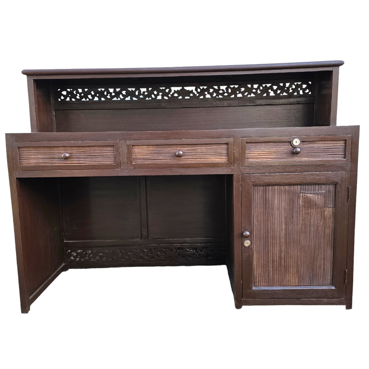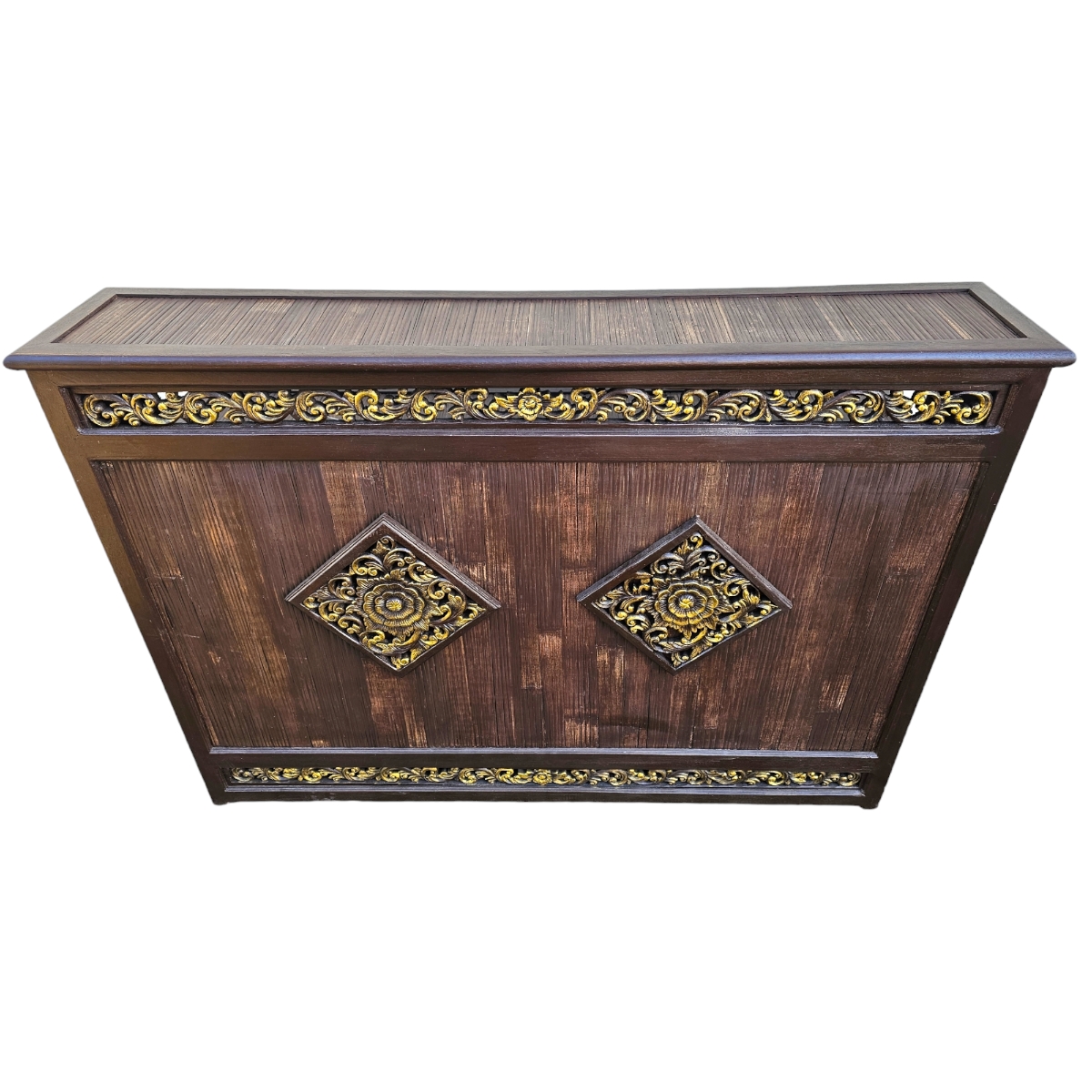Entdecken Sie die exklusive Eleganz des Tresens, handgefertigt in Thailand. Dieses einzigartige Möbelstück vereint traditionelles Handwerk mit modernem Design und wird zum Mittelpunkt jeder Raumgestaltung. Der markante, kantige Rahmen aus hochwertigem Holz bietet eine robuste Grundlage, während die fein verarbeiteten Bambusflächen eine natürliche Ästhetik verleihen. Ausgestattet mit drei praktischen Schubladen und einem geräumigen Unterschrank bietet dieser Tresen ausreichend Stauraum für Ihre Bedürfnisse. Ein besonderes Highlight sind die drei kunstvoll gestalteten Reliefs auf der Vorderseite, die jedes Exemplar zu einem unvergleichlichen Kunstwerk machen. Ideal für Ihr Wohnzimmer, Ihre Bar oder als stilvolle Ergänzung in Ihrem Geschäftsbereich – dieser Tresen verbindet Funktionalität mit außergewöhnlichem Design.