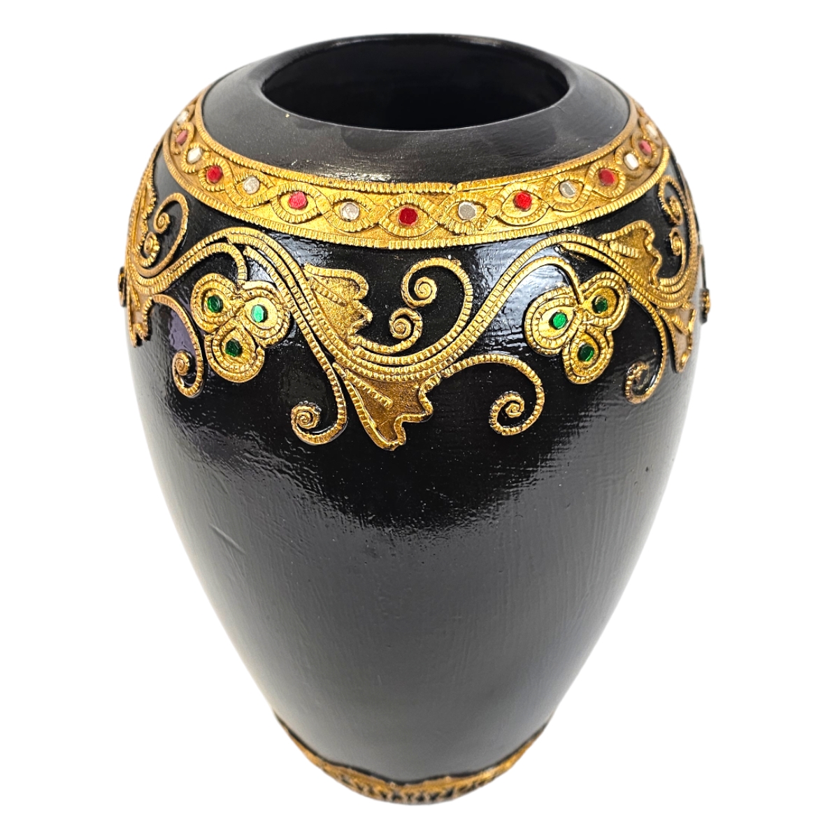 Erwecken Sie die Schönheit thailändischer Handwerkskunst in Ihrem Zuhause mit diesem exquisiten Holzvase. Mit Liebe handgefertigt und kunstvoll bemalt in edlem Schwarz, zeichnet sich dieses Produkt durch seine hervorragende Qualität und Detailgenauigkeit aus. Veredelt ist sie mit eleganten goldenen Verzierungen und verziert mit schimmernden Mosaiksteinen, die im Licht funkeln. Diese besondere Vase ist nicht nur ein praktisches Wohnaccessoire zum Aufstellen von Blumen und Zweigen, sondern auch ein echter Hingucker und eine exquisite Bereicherung für jeden Wohnraum. Erleben Sie mit dieser Vase die einzigartige Mischung aus Tradition und Moderne, die Ihr Zuhause in ein exotisches Paradies verwandelt.