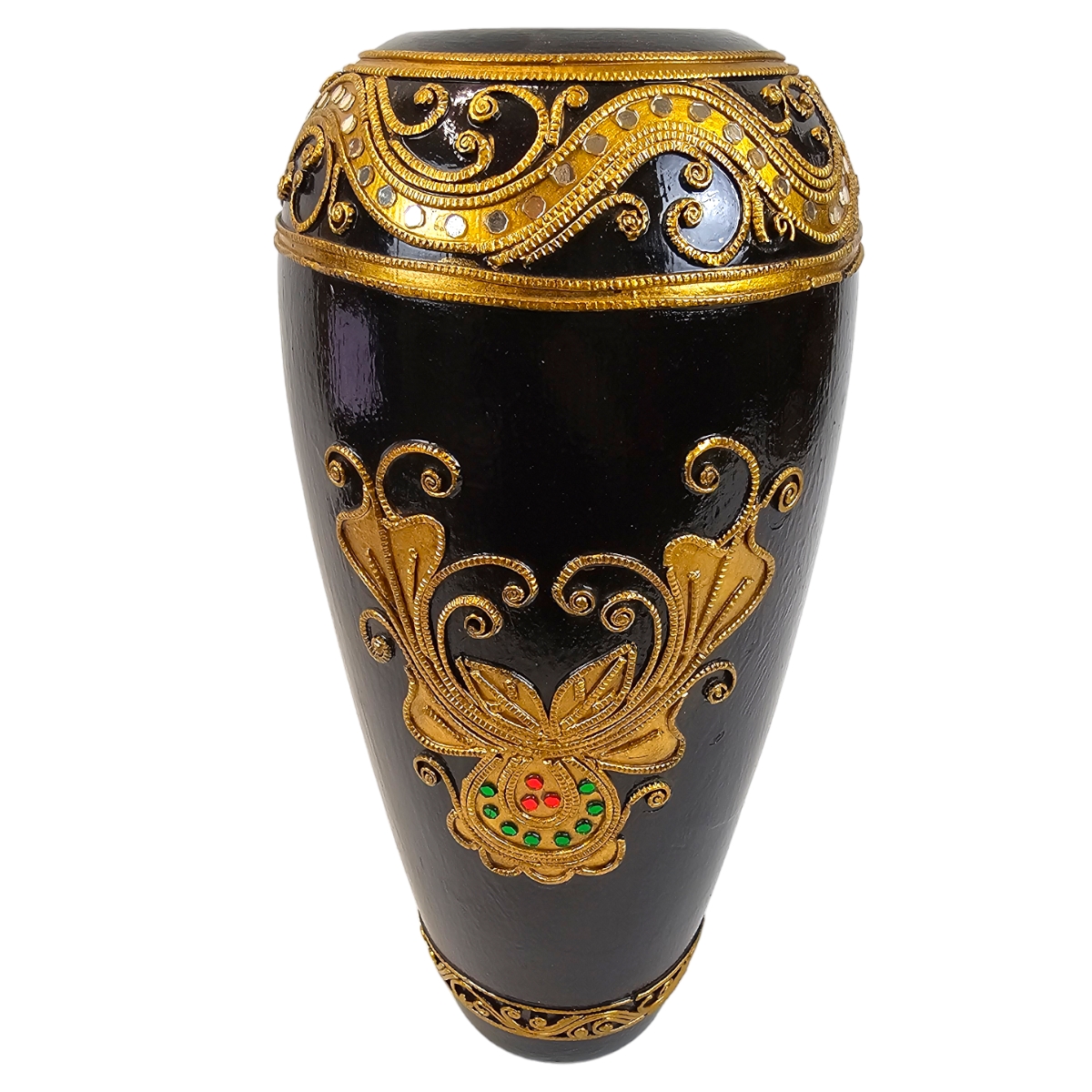 Erwecken Sie die Schönheit thailändischer Handwerkskunst in Ihrem Zuhause mit diesem exquisiten Holzvase. Mit Liebe handgefertigt und kunstvoll bemalt in edlem Schwarz, zeichnet sich dieses Produkt durch seine hervorragende Qualität und Detailgenauigkeit aus. Veredelt ist sie mit eleganten goldenen Verzierungen und verziert mit schimmernden Mosaiksteinen, die im Licht funkeln. Diese besondere Vase ist nicht nur ein praktisches Wohnaccessoire zum Aufstellen von Blumen und Zweigen, sondern auch ein echter Hingucker und eine exquisite Bereicherung für jeden Wohnraum. Erleben Sie mit dieser Vase die einzigartige Mischung aus Tradition und Moderne, die Ihr Zuhause in ein exotisches Paradies verwandelt.