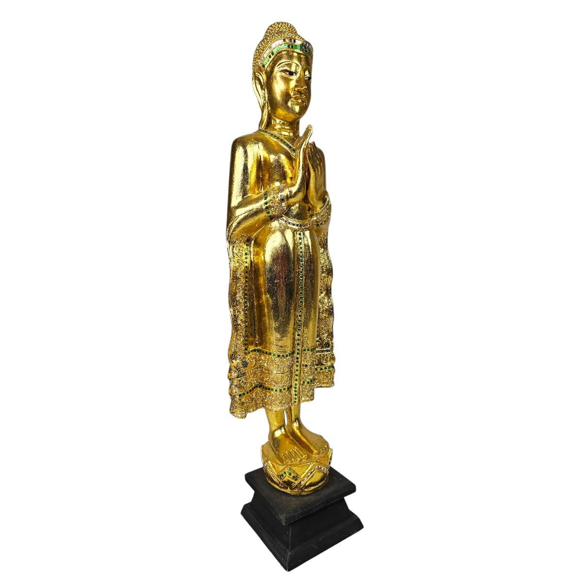 "Erleben Sie ein Stück thailändischer Handwerkskunst mit unserem einzigartigen, goldenen Buddha, prächtig verziert mit funkelnden Mosaiksteinen. Handgefertigt aus hochwertigem Holz, ist dieser Buddha ein echtes Unikat und versteht es, durch sein detailgenaues Design zu faszinieren. Die sanften Konturen und die warmen, goldenen Töne schaffen ein harmonisches Ambiente, während das reiche Mosaikmuster einen exotischen Flair verleiht. Dieser Buddha ist mehr als nur eine Dekoration - er ist ein Ausdruck von Ruhe, Eleganz und spiritueller Tiefe. Lassen Sie sich von seiner majestätischen Präsenz inspirieren und tauchen Sie ein in eine Welt der inneren Ruhe und Gelassenheit."