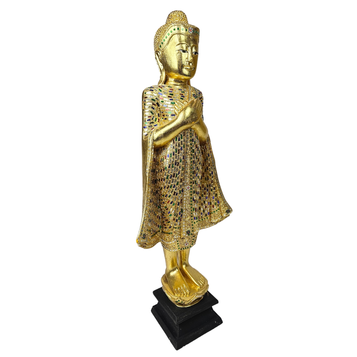 "Eintauchen in die mystische Welt der spirituellen Erleuchtung mit unserem handgefertigten goldfarbenen Holz-Buddha. Ein wahrhaft einzigartiges Kunstwerk, meisterhaft in Thailand hergestellt und üppig mit glitzernden Mosaiksteinen verziert. Seine majestätische goldene Farbe symbolisiert Weisheit und Wissen, während die sorgfältig platzierten Mosaiksteine die kulturelle Tiefe des Buddhismus hervorbringen. Lassen Sie diesen Buddha einen Raum mit Ausgeglichenheit und Frieden füllen, während er zugleich ein beeindruckendes dekoratives Schmuckstück darstellt. Schaffen Sie eine Oase der Ruhe in Ihrem Zuhause mit diesem handgefertigten Schatz aus dem exotischen Thailand."