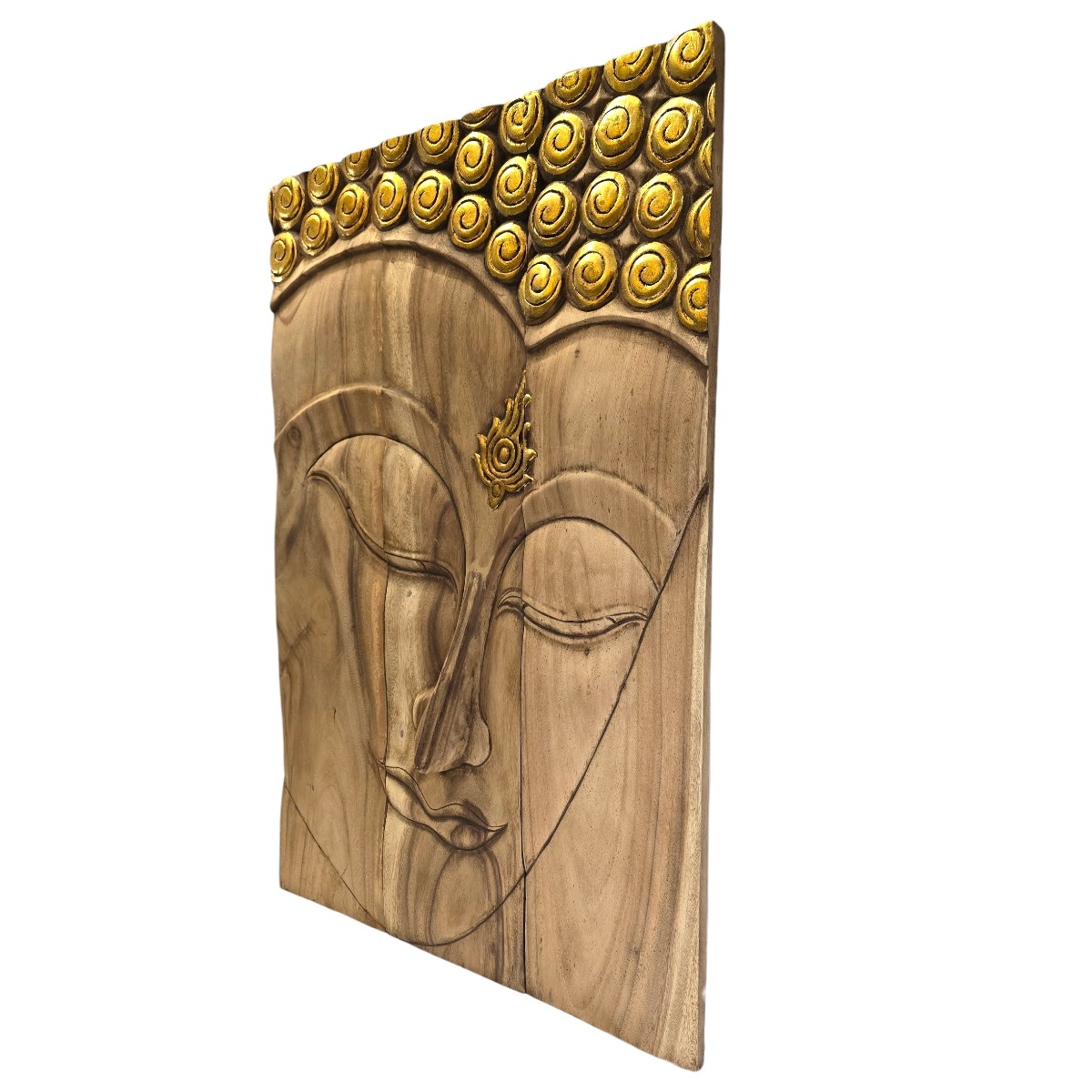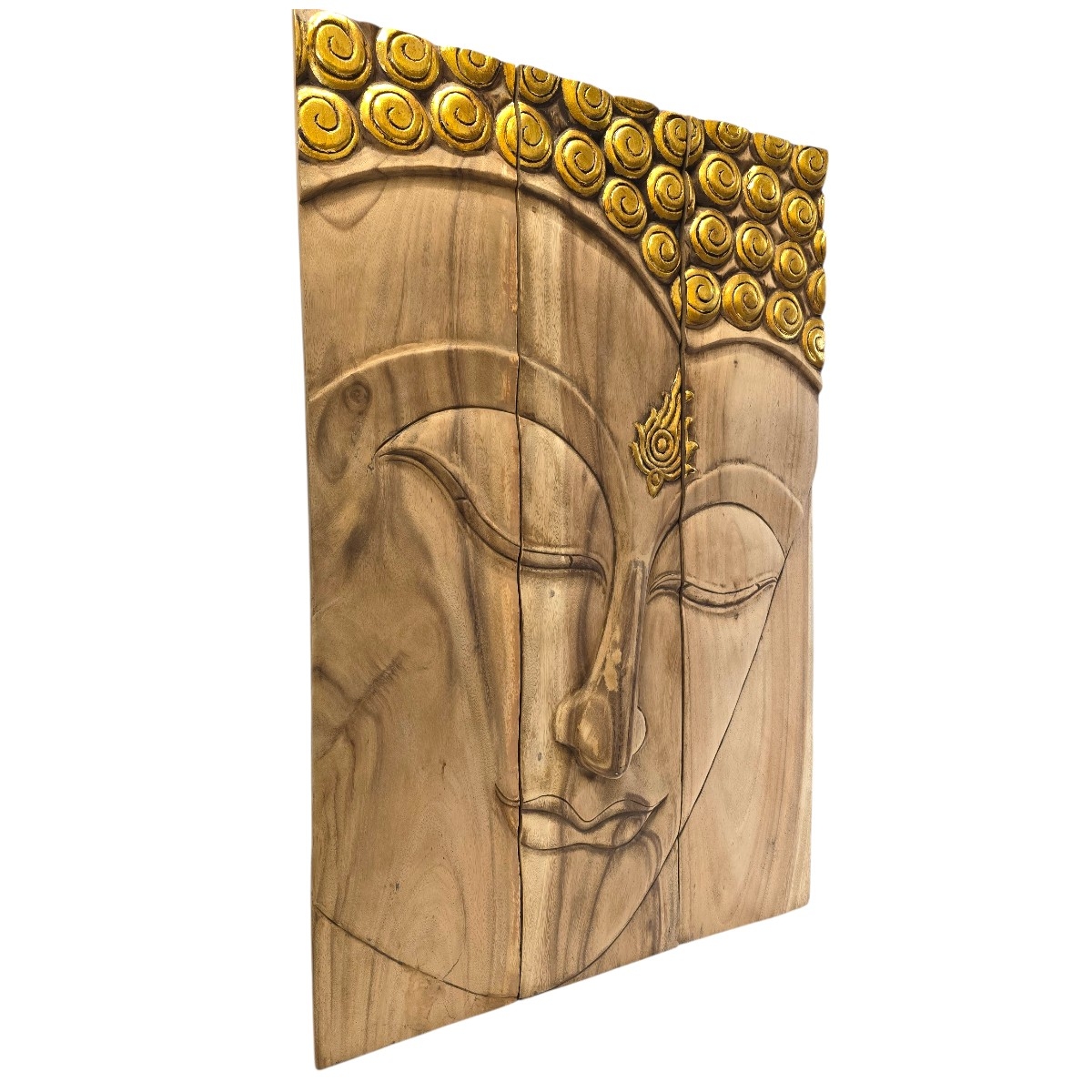 Eben Sie die Schönheit und Ruhe des Ostens in Ihrem Zuhause mit unserem exquisiten 3-teiligen Buddha Kopf Relief. Dieses handgefertigte Kunstwerk aus Thailand ist ein Meisterstück traditioneller Handwerkskunst und verkörpert die zeitlose Weisheit und Gelassenheit Buddhas. Produktmerkmale: Handgefertigt in Thailand: Jedes Stück wird mit größter Sorgfalt und Fachkenntnis von erfahrenen thailändischen Kunsthandwerkern gefertigt, die ihre Leidenschaft und ihr Talent in jedes Detail einfließen lassen. Aufwendige Schnitzerei: Der Buddha Kopf besticht durch seine filigrane und detaillierte Schnitzerei, die eine beeindruckende Tiefe und Lebendigkeit erzeugt. 3-teilige Gestaltung: Das Relief besteht aus drei Teilen, die eine vielseitige Präsentation an Ihrer Wand ermöglichen und jedem Raum eine ansprechende Dimension verleihen. Goldene Akzente: Dezente goldene Akzente fügen einen Hauch von Eleganz hinzu und verleihen dem Buddha Kopf einen edlen Glanz, der das Licht wunderbar reflektiert. Dieses atemberaubende Kunstwerk ist nicht nur ein Blickfang, sondern auch eine Quelle der Inspiration und Ruhe. Perfekt für Wohnräume, Meditationsbereiche oder als einzigartiges Geschenk für Liebhaber asiatischer Kultur. Bereichern Sie Ihr Heim mit diesem Symbol der inneren Harmonie und Gelassenheit.