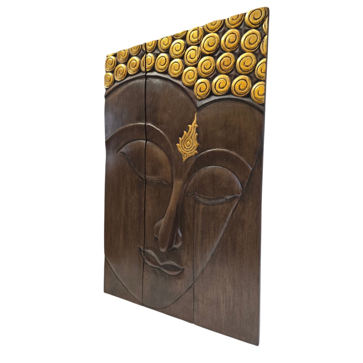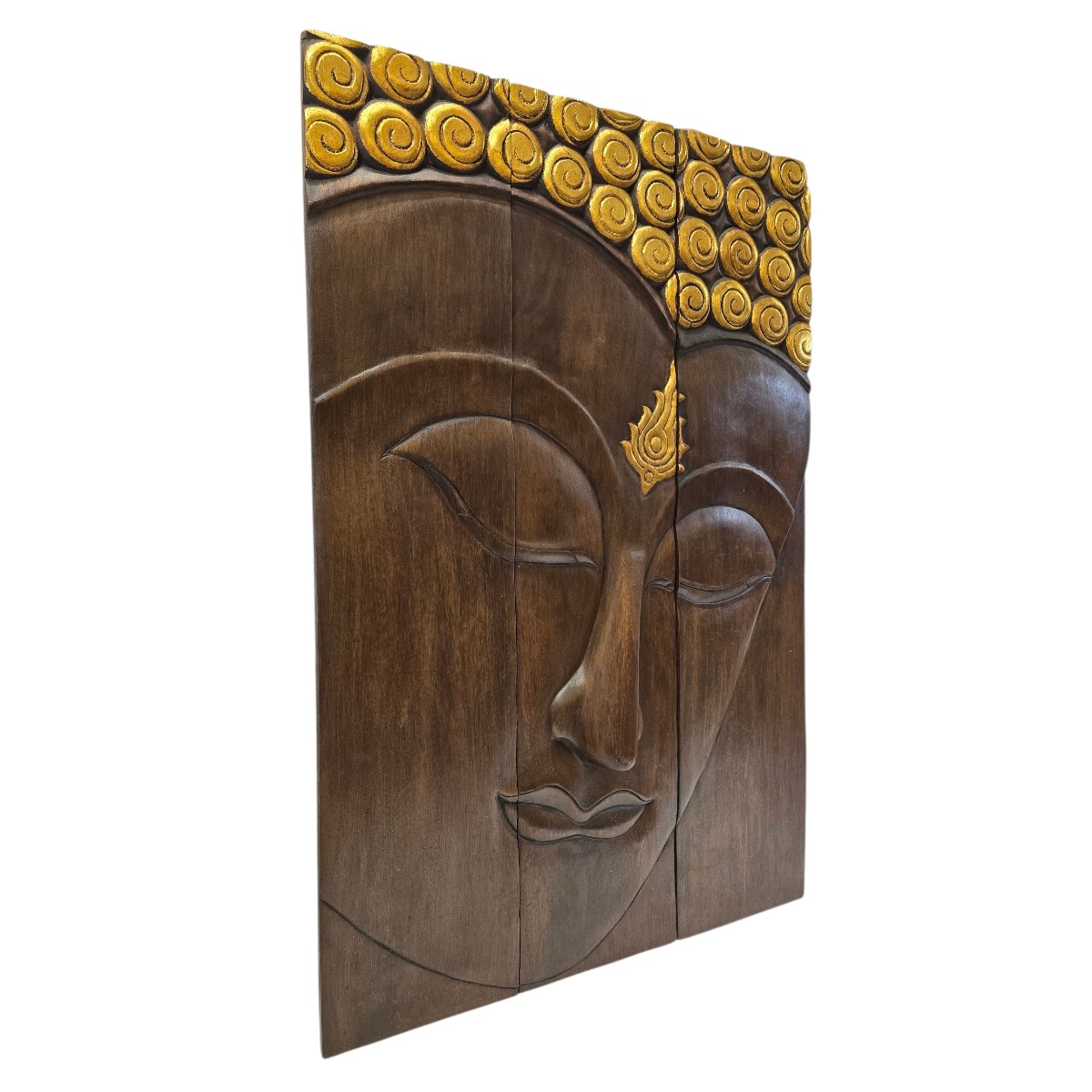 Eben Sie die Schönheit und Ruhe des Ostens in Ihrem Zuhause mit unserem exquisiten 3-teiligen Buddha Kopf Relief. Dieses handgefertigte Kunstwerk aus Thailand ist ein Meisterstück traditioneller Handwerkskunst und verkörpert die zeitlose Weisheit und Gelassenheit Buddhas. Produktmerkmale: Handgefertigt in Thailand: Jedes Stück wird mit größter Sorgfalt und Fachkenntnis von erfahrenen thailändischen Kunsthandwerkern gefertigt, die ihre Leidenschaft und ihr Talent in jedes Detail einfließen lassen. Aufwendige Schnitzerei: Der Buddha Kopf besticht durch seine filigrane und detaillierte Schnitzerei, die eine beeindruckende Tiefe und Lebendigkeit erzeugt. 3-teilige Gestaltung: Das Relief besteht aus drei Teilen, die eine vielseitige Präsentation an Ihrer Wand ermöglichen und jedem Raum eine ansprechende Dimension verleihen. Goldene Akzente: Dezente goldene Akzente fügen einen Hauch von Eleganz hinzu und verleihen dem Buddha Kopf einen edlen Glanz, der das Licht wunderbar reflektiert. Dieses atemberaubende Kunstwerk ist nicht nur ein Blickfang, sondern auch eine Quelle der Inspiration und Ruhe. Perfekt für Wohnräume, Meditationsbereiche oder als einzigartiges Geschenk für Liebhaber asiatischer Kultur. Bereichern Sie Ihr Heim mit diesem Symbol der inneren Harmonie und Gelassenheit.