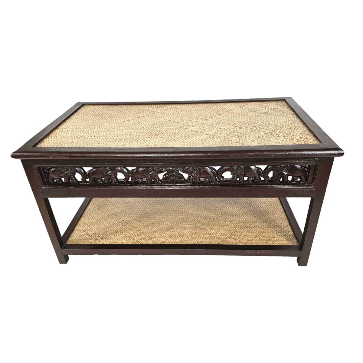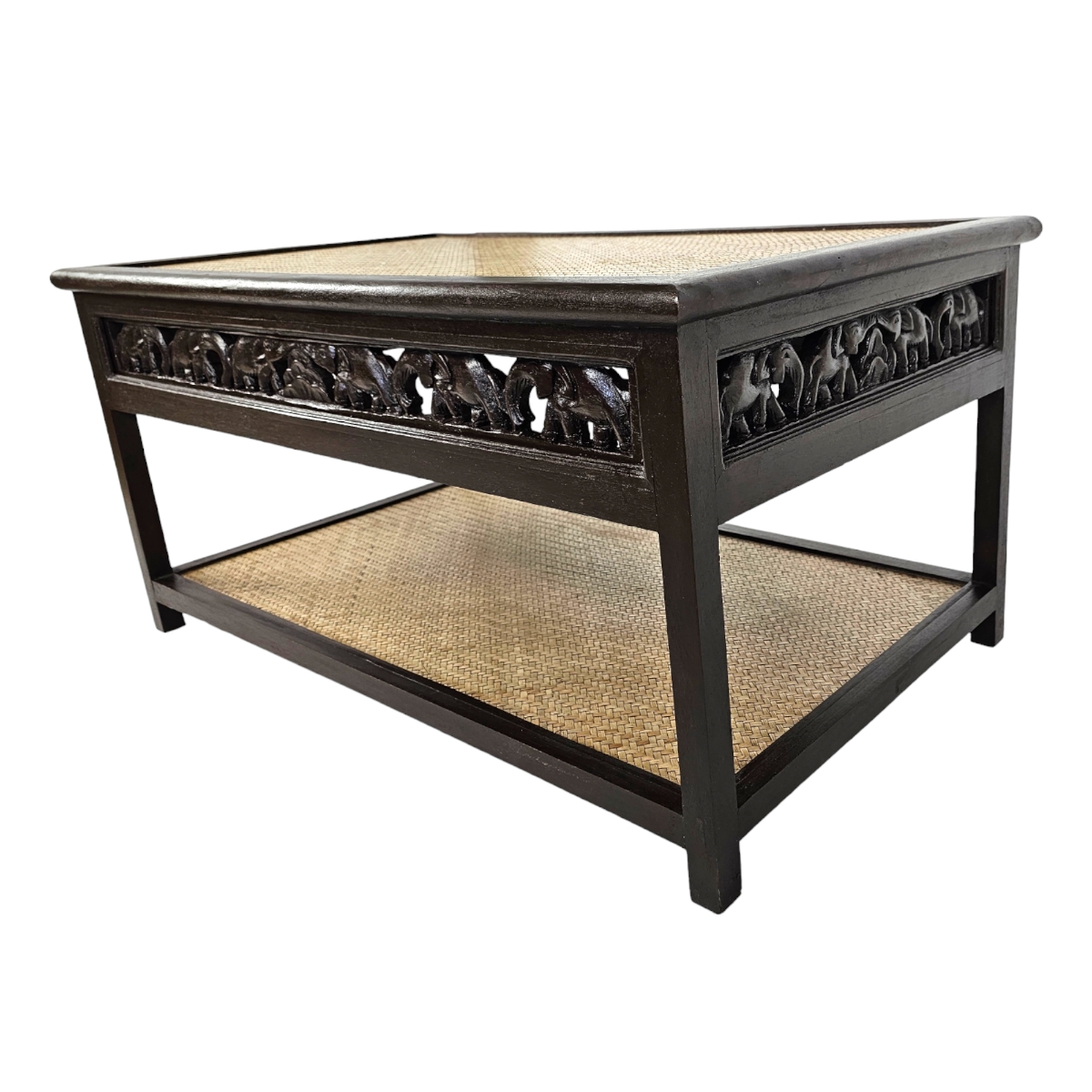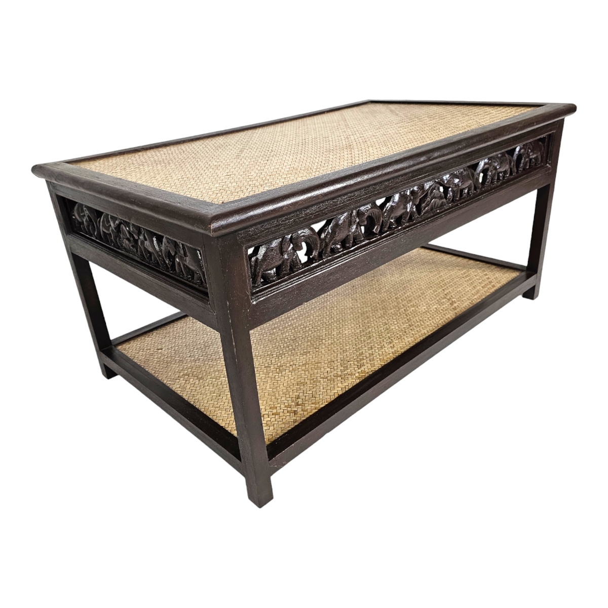 Verleihen Sie Ihrem Wohnzimmer einen Hauch von Exotik mit unserem einzigartigen Couchtisch aus Thailand. Dieses Meisterwerk der Handwerkskunst sticht besonders durch die liebevoll handgeschnitzten Elefantenmotive hervor, die den kompletten Rand des Tisches zieren. Jedes Detail der Schnitzerei erzählt eine eigene Geschichte und zieht die Blicke Ihrer Gäste magisch an. Der Couchtisch besticht nicht nur durch seine kunstvolle Oberfläche, sondern auch durch seine Funktionalität. Unter der Hauptplatte bietet eine zusätzliche Ablagefläche, die mit edlem Rattan bezogen ist, ausreichend Platz für Zeitschriften, Fernbedienungen und andere Alltagsgegenstände. Die Tischplatte selbst besteht ebenfalls aus hochwertigem Rattan, das nicht nur robust, sondern auch pflegeleicht ist. Mit seinen natürlichen Materialien und der handwerklichen Detailarbeit bringt dieser Tisch Wärme und Charakter in jeden Raum. Ob im Wohnzimmer, im Wintergarten oder in einer Leseecke, dieser Couchtisch ist nicht nur ein Möbelstück, sondern ein echtes Kunstwerk, das Ihre Einrichtung bereichert. Investieren Sie in dieses Schmuckstück, und bringen Sie ein Stück thailändische Kultur und Kunstfertigkeit in Ihr Zuhause. Der Couchtisch ist ideal für alle, die Wert auf Design, Qualität und Einzigartigkeit legen.