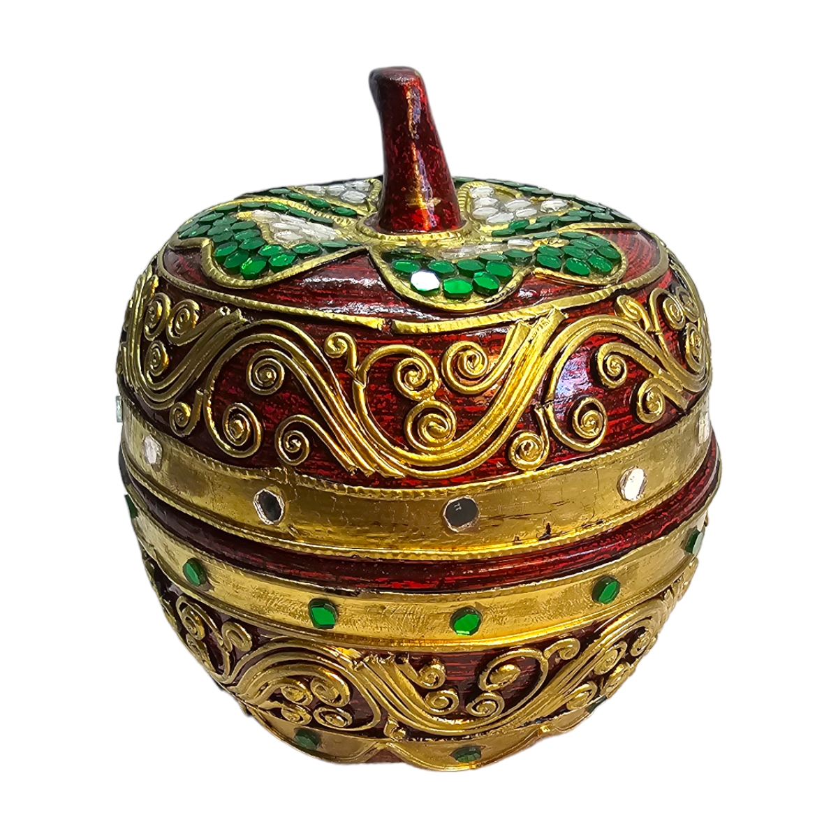 Erleben Sie die exquisite Handwerkskunst aus dem fernen Thailand mit unserer prächtig verzierten Dose. Meisterhaft aus sorgfältig ausgewähltem Holz gefertigt, besticht diese Dose durch ihre einzigartige Apfelform. Hervorgehoben durch goldene Verzierungen, wird die Schönheit dieses Stücks durch farbenprächtige Mosaiksteine zum Leben erweckt. Diese Dose ist nicht nur eine funktionale Aufbewahrungsmöglichkeit, sondern auch ein auffälliges Dekorationsobjekt, das jedem Raum einen Hauch von Luxus verleiht. Hinweis: Jedes Stück wird von Hand gefertigt und kann daher leicht variieren.