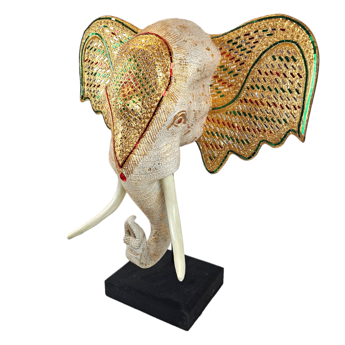 Stellen Sie sich mit dem handgefertigten Elefantenkopf aus Holz eine exotische, verzaubernde Atmosphäre direkt in Ihr Zuhause. Kompetent gearbeitet in Thailand, ist jedes Stück ein Unikat, durch das Sie einen Hauch von fernöstlicher Kultur erleben können. Jedes Detail des Elefanten wurde sorgfältig gestaltet, um seine majestätische Schönheit widerzuspiegeln. Mosaiksteine, die kunstvoll an einem robusten Ständerwerk befestigt sind, verleihen diesem Produkt zusätzlichen Glanz und Reflektion, wodurch Anspruch und Eleganz unterstrichen werden. Der Holzelefantenkopf ist nicht nur ein auffälliger Blickfang, sondern erzählt auch eine Geschichte von Handwerkskunst und Tradition. Machen Sie ihr Zuhause zu einem Ort voller Seele und Charakter. Der Elefantenkopf aus Holz transportiert eine tiefe Symbolik und fügt Ihrem Zuhause eine ästhetische und zugleich tiefgründige Dimension hinzu. Verschönern Sie Ihre Wohnkultur und lassen Sie sich ins Land der Tempel und Tuk-Tuks entführen.