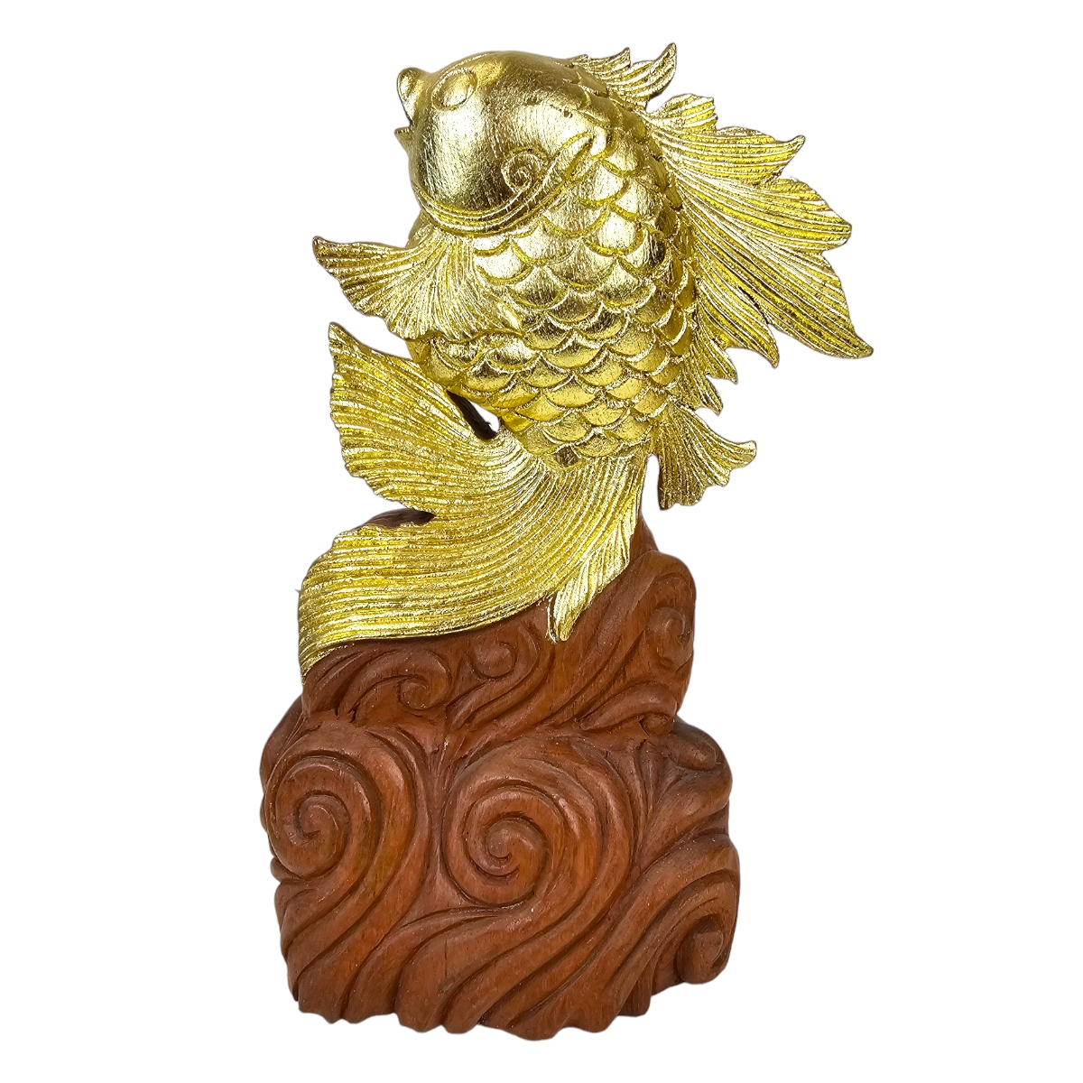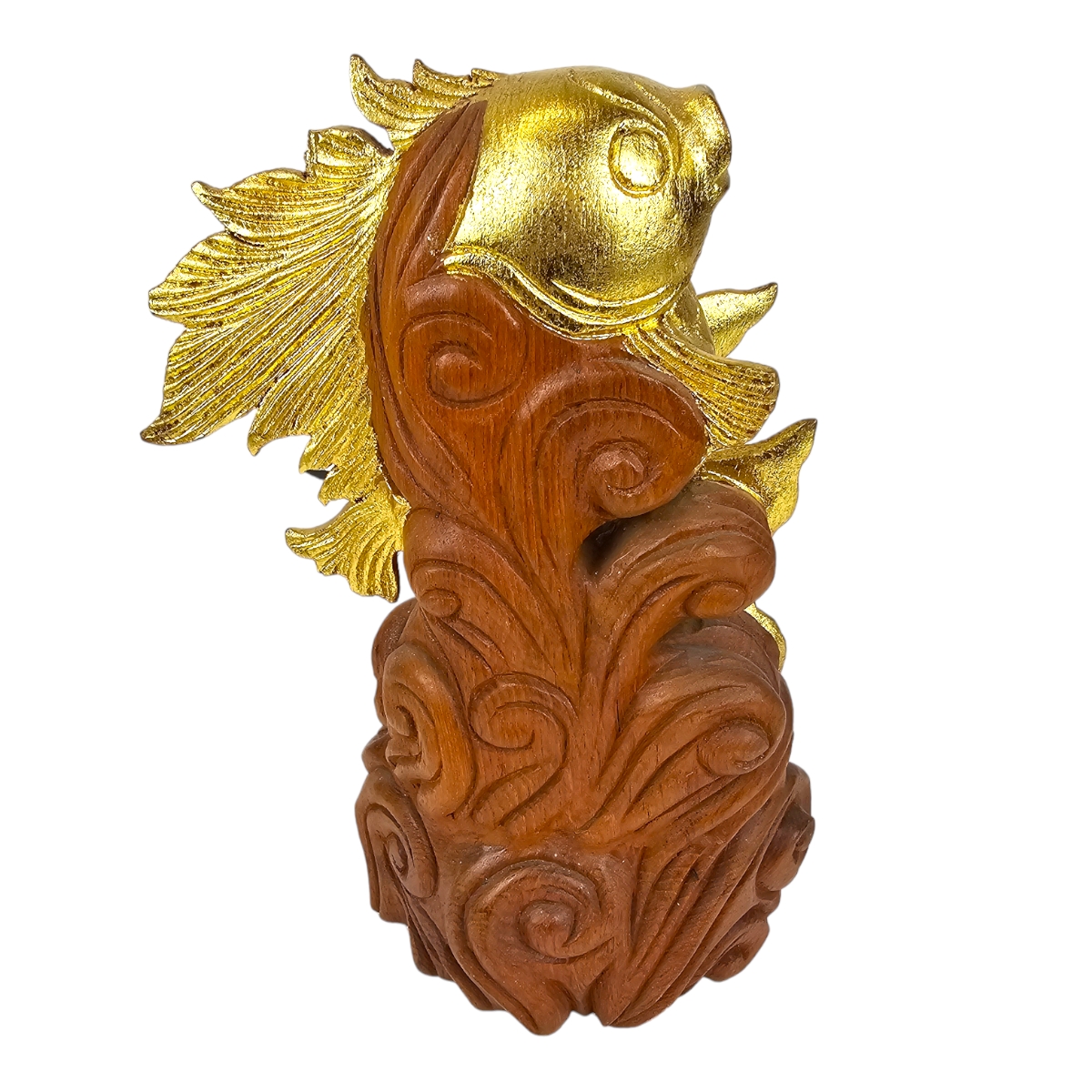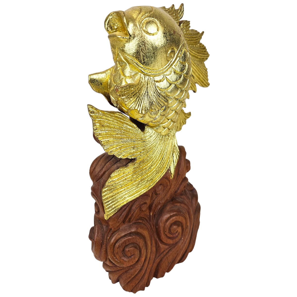 Attraktivieren Sie Ihr Zuhause mit unserem auffallend schönen, in Thailand handgefertigten, "Fisch der aus dem Wasser springt". Dieses exquisit gestaltete Kunstwerk ist aus hochwertigem Holz gefertigt und in einem luxuriösen Goldton bemalt, der jedem Raum einen Hauch von Raffinesse und Eleganz verleiht. Darüber hinaus symbolisiert dieser goldene Fisch das Glück, was ihn zu einem perfekten Geschenk oder zu einer wertvollen Ergänzung Ihrer eigenen Sammlung macht. Erwecken Sie Ihre Inneneinrichtung mit diesem spektakulären Stück zum Leben und lassen Sie sich von seinem Charme verzaubern. Der Fisch, der aus dem Wasser springt, ist mehr als nur eine Dekoration - er ist ein Omen für Wohlstand und Glück.