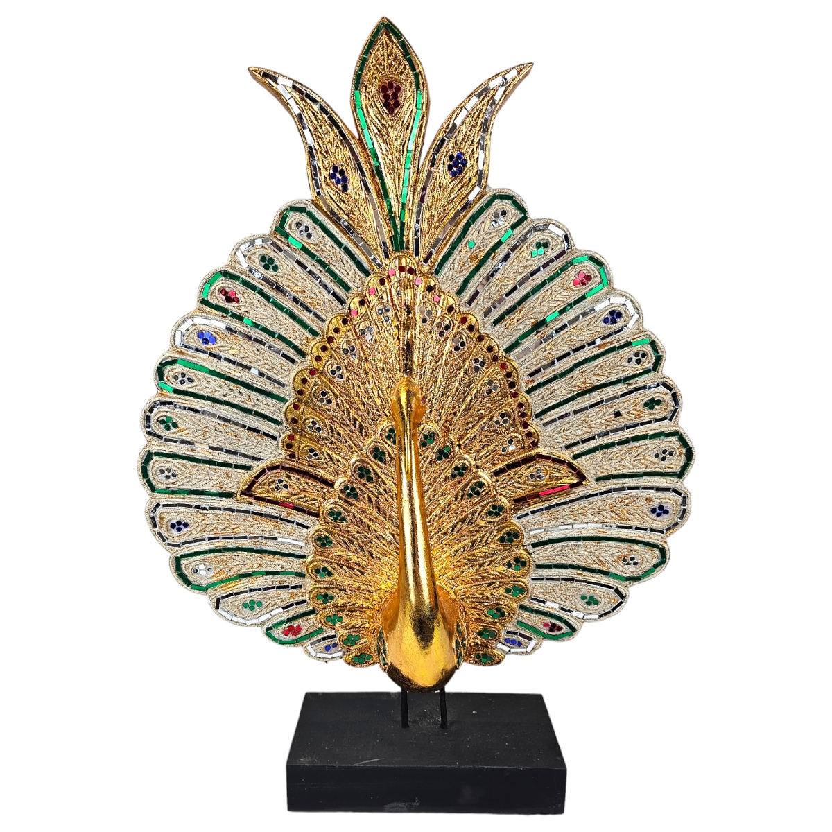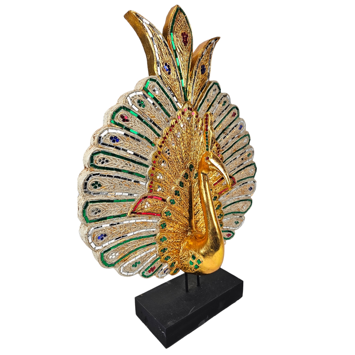 Entzücken Sie Ihre Sinne und füllen Sie Ihr Zuhause mit einem Hauch von serener Eleganz mit unserem "Glücks Pfau" - einem handgefertigten Meisterwerk direkt aus Thailand. Dieses exquisite Produkt, sorgfältig aus Holz geschnitzt, verströmt den Charme und die Herrlichkeit der thailändischen Handwerkskunst. Bedeckt in einer atemberaubenden weiß goldenen Farbe, spiegelt dieser Pfau nicht nur die Pracht der Natur wider, sondern bringt auch eine Aura von Glück und Wohlstand in Ihr Zuhause. Die funkelnden Mosaiksteine, die kunstvoll auf dem gesamten Körper des Pfaus platziert sind, fügen einen Hauch von Opulenz und Raffinesse hinzu, der sicherlich die Aufmerksamkeit aller auf sich zieht. Der Glücks Pfau ist nicht nur ein Ausdruck von Schönheit und Luxus, sondern symbolisiert auch Wohlstand und Glück - eine perfekte Ergänzung für jedes Heim oder Büro. Verschenken Sie es als einzigartiges Geschenk oder gönnen Sie sich selbst dieses exquisite Kunstwerk. Machen Sie Ihr Zuhause mit unserem Glücks Pfau einzigartig und spektakulär! Für jeden, der die Kunst und Kultur Thailands schätzt, ist der Glücks Pfau eine unwiderstehliche Ergänzung zu Ihrer Sammlung. Setzen Sie ein Zeichen mit unserem prächtigen Glücks Pfau und lassen Sie Ihr Zuhause in neuer Pracht erstrahlen.