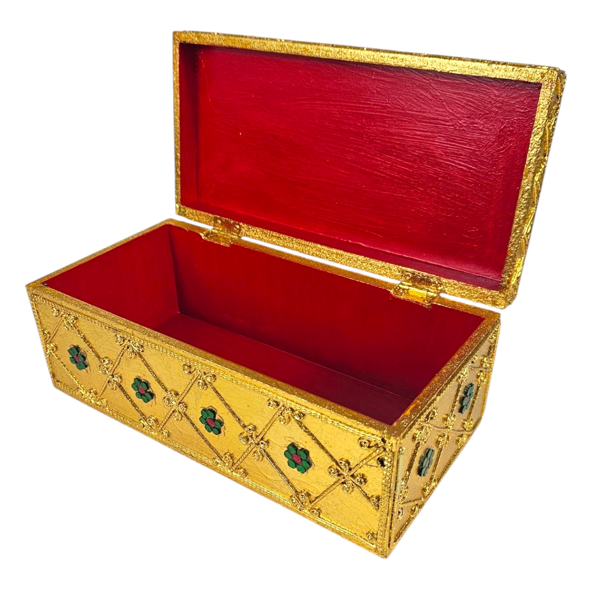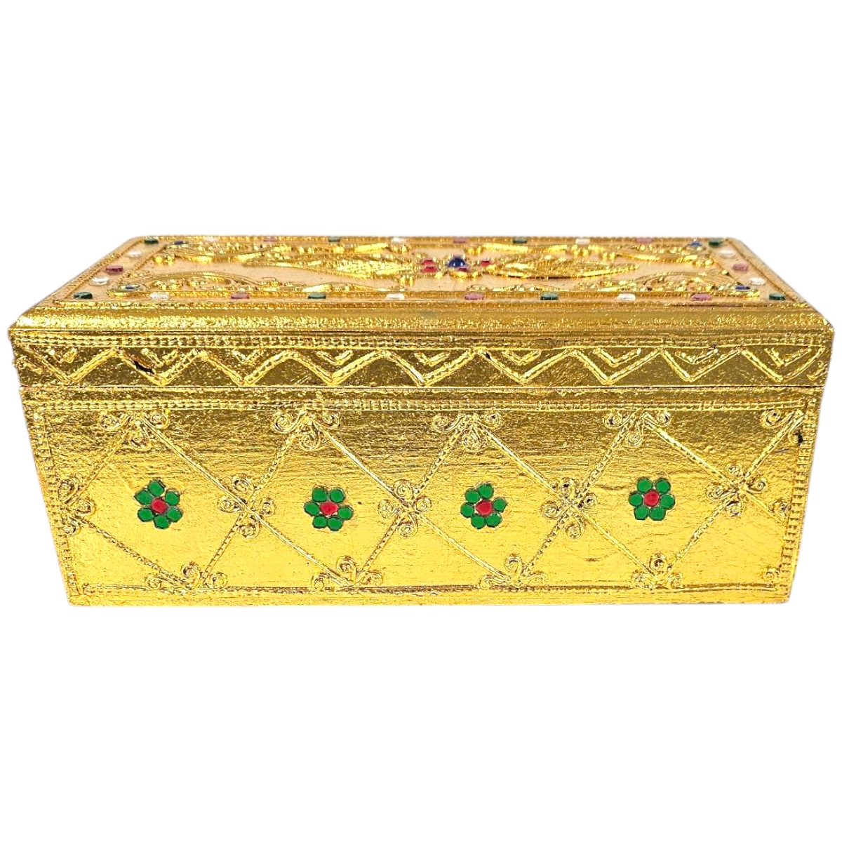 Eleganz, Handwerkskunst und Einzigartigkeit sind die Schlagworte für unsere Schmuck Box, sorgfältig handgefertigt in Thailand. Hergestellt aus hochwertigen Materialien und verziert mit prächtigen Mosaiksteinen, ist diese Schmuck Box ein echter Hingucker in goldener Farbe. Ein luxuriöses Heim für Ihre edelsten Schmuckstücke, das sich gleichzeitig als dekoratives Kunstwerk präsentiert. Lassen Sie sich von der einmaligen Schönheit dieser Box verzaubern und verwöhnen Sie Ihre Schmuckkollektion mit einem würdigen Aufbewahrungsort. Bestellen Sie jetzt Ihre Schmuck Box und erleben Sie exklusives thailändisches Handwerk in seiner schönsten Form.