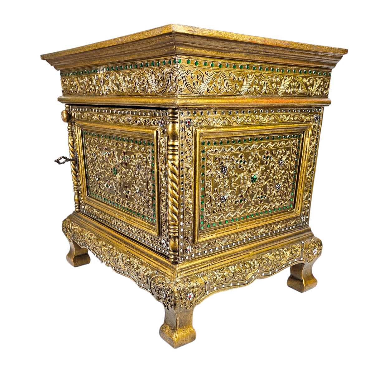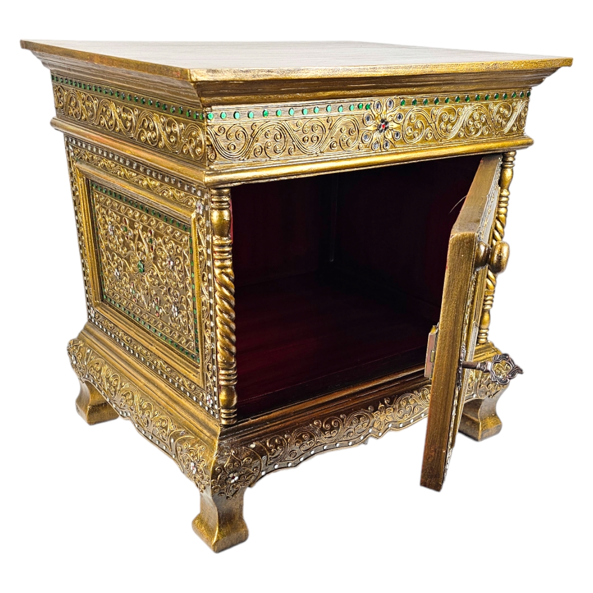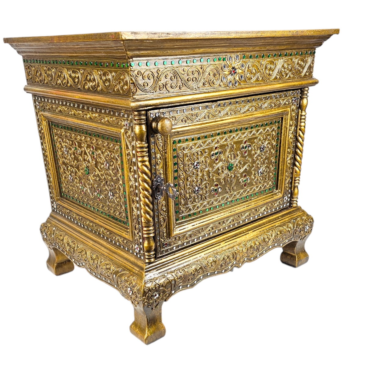Erfreuen Sie sich an der außergewöhnlichen Schönheit dieser handgefertigten Kommode aus Thailand. Jedes Stück ist ein Unikat, individuell gestaltet und mit viel Liebe zum Detail verziert. Die goldene Farbe verleiht der Kommode ein luxuriöses Aussehen, während die Mosaiksteine auf dem Nachttisch für einen einzigartigen, künstlerischen Touch sorgen. Diese Kommode ist nicht nur ein Möbelstück, sondern auch eine beeindruckende Präsentation von Kunst und Handwerk, die jedes Zuhause bereichert.