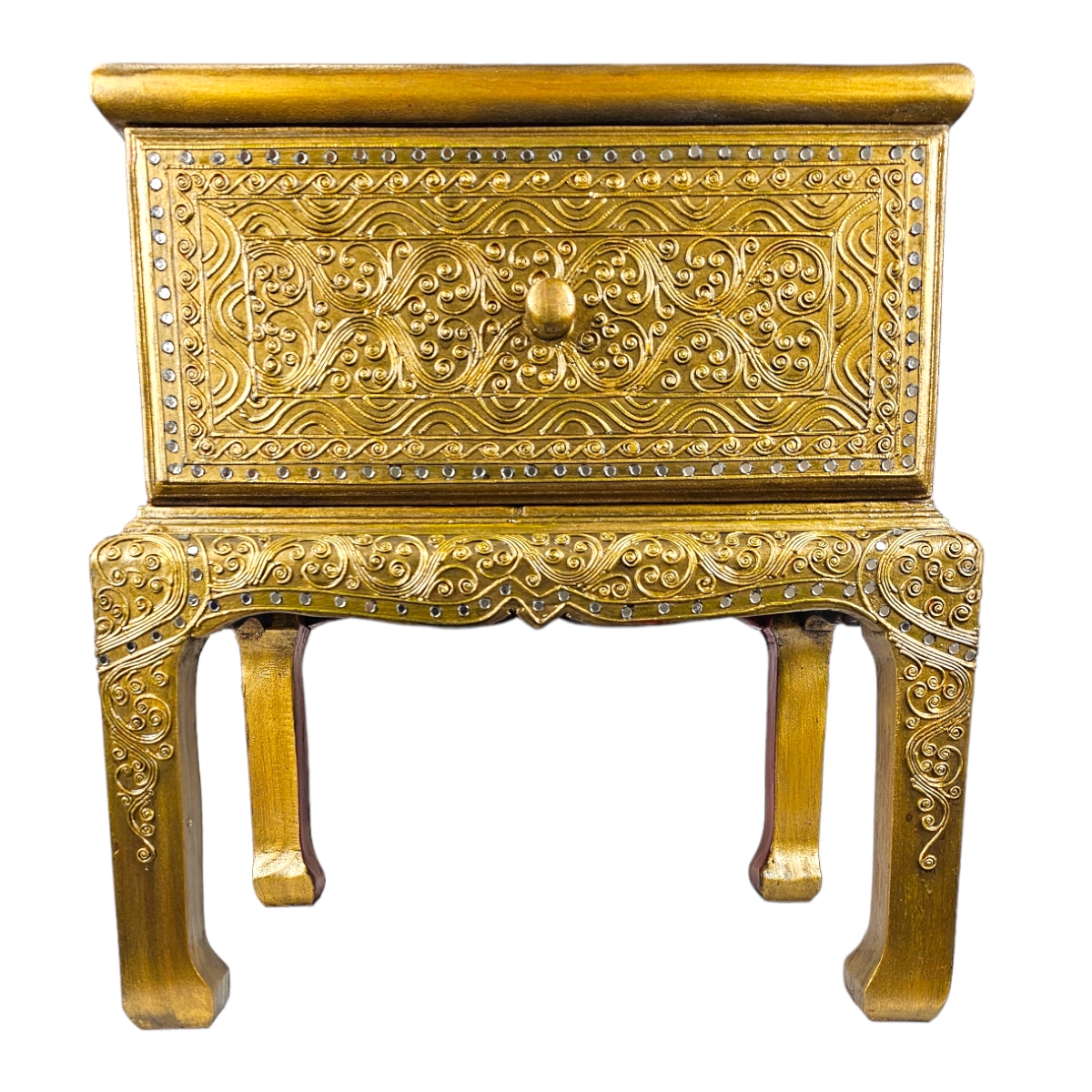 Erfreuen Sie sich an der außergewöhnlichen Schönheit dieser handgefertigten Kommode aus Thailand. Jedes Stück ist ein Unikat, individuell gestaltet und mit viel Liebe zum Detail verziert. Die goldene Farbe verleiht der Kommode ein luxuriöses Aussehen, während die Mosaiksteine auf dem Nachttisch für einen einzigartigen, künstlerischen Touch sorgen. Diese Kommode ist nicht nur ein Möbelstück, sondern auch eine beeindruckende Präsentation von Kunst und Handwerk, die jedes Zuhause bereichert.