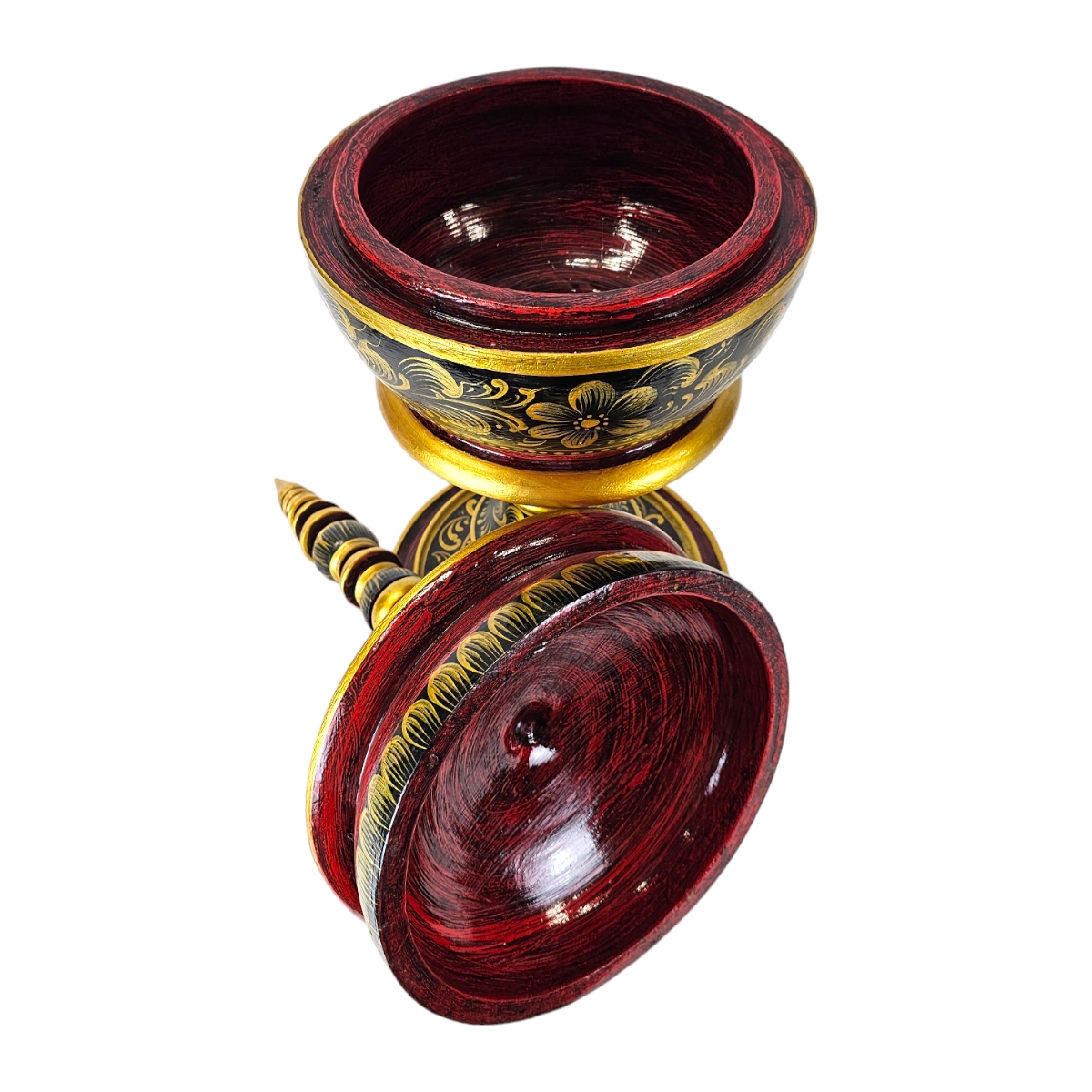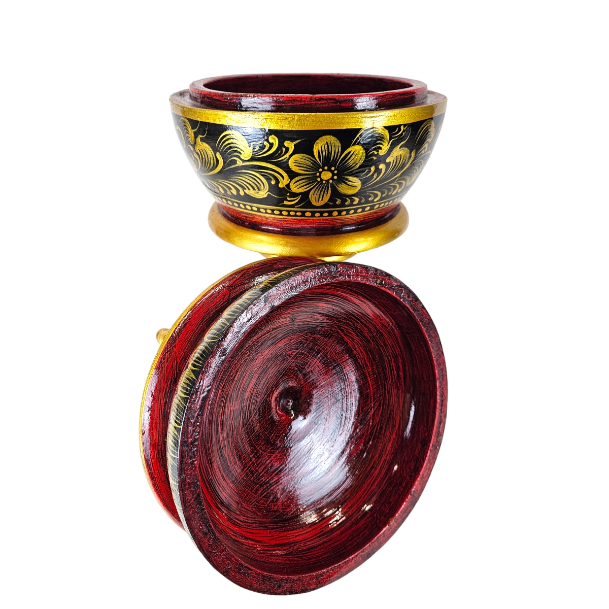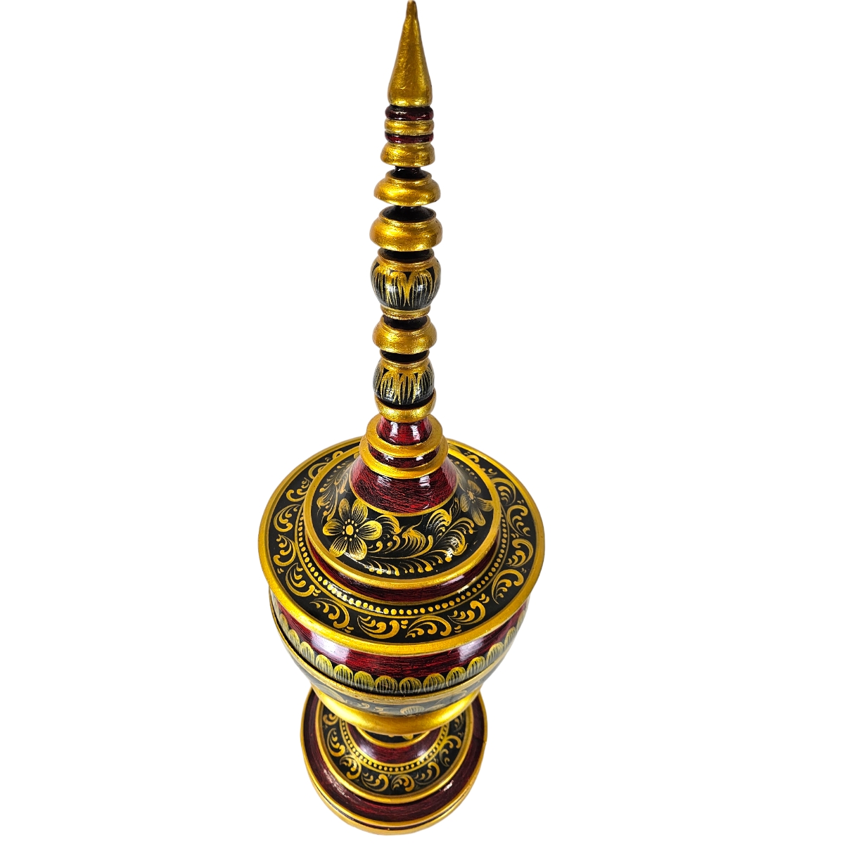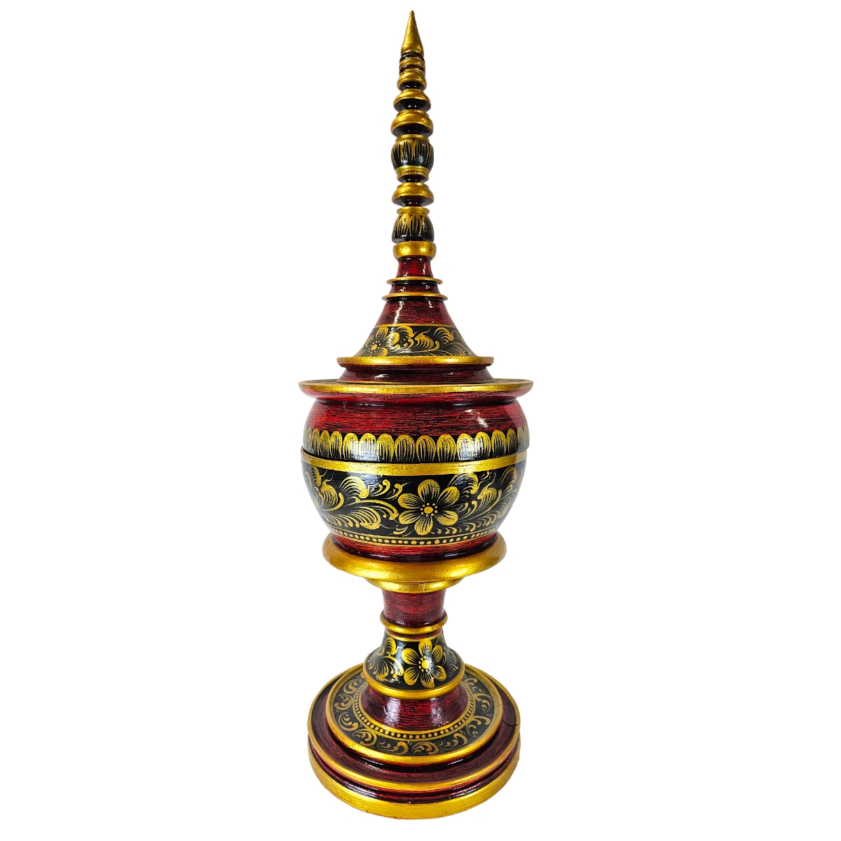Verlieren Sie sich in der beeindruckenden Schönheit dieser rot-schwarzen Skulptur, Pha-Ob. Hergestellt in Thailand, zeichnet sie sich durch ihre beeindruckende Größe und ihr einzigartiges Design aus. Pha-Ob, die eine harmonische Fusion von Tradition und Handwerk darstellt, besteht aus hochwertigem Holz und ist mit eleganten goldenen Verzierungen verziert. Das edle tiefrote und schwarze Finish ist nicht nur eine Freude für die Augen, sondern verleiht jedem Raum eine besondere Ausstrahlung. Der abnehmbare Deckel ist ein weiteres Highlight dieses Kunstschatzes. Er bietet eine interessante und praktische Funktion, die es Ihnen ermöglicht, die Skulptur nach Belieben zu nutzen. Pha-Ob ist nicht nur eine Skulptur, sondern ein Zeugnis thailändischer Handwerkskunst. Seien Sie ein stolzer Besitzer dieses Kunstwerks und bringen Sie ein Stück asiatische Kultur in Ihr Zuhause. Dank der aufwendigen Details und des beeindruckenden Designs wird dieser auffällige Hingucker jeden Gast begeistern. Bestellen Sie Pha-Ob noch heute und lassen Sie sich von seiner majestätischen Präsenz inspirieren. Setzen Sie ein starkes Statement mit dieser exquisiten Skulptur. Erwecken Sie die Kunst von Pha-Ob zum Leben und lassen Sie sich von der zeitlosen Eleganz verzaubern. Machen Sie diesen Blickfang zum Herzstück Ihrer Raumgestaltung. Pha-Ob - der Inbegriff von Schönheit und Qualität.
