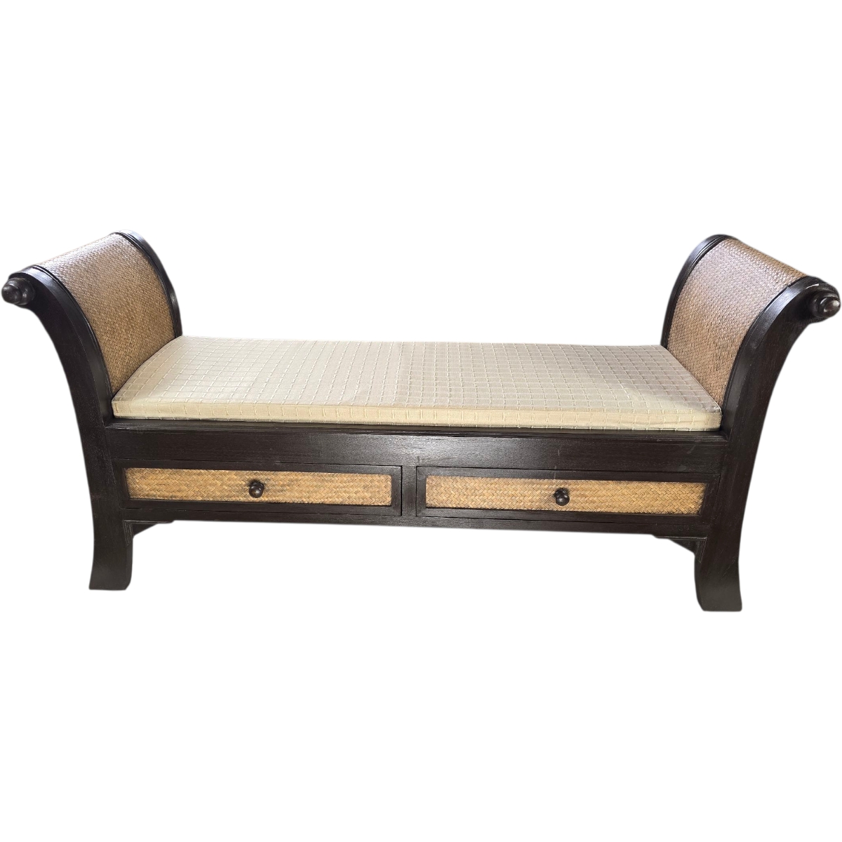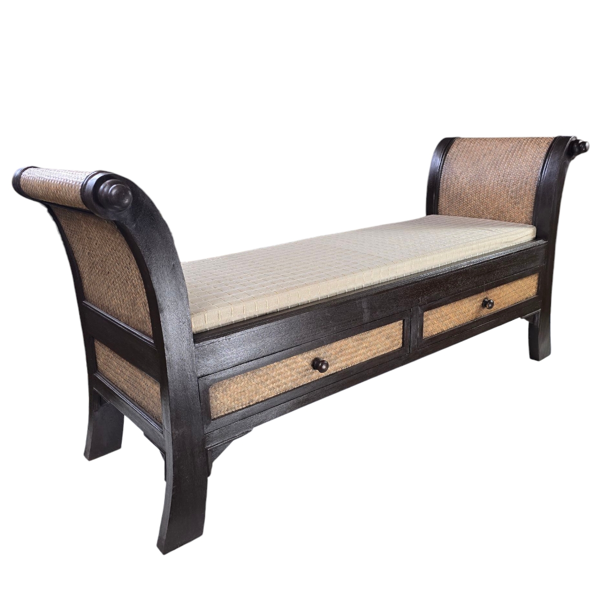 Unsere Rattan Sitzbank überzeugt durch ihr ansprechendes Design in einer warmen, braunen Farbe, die jedem Raum eine einladende Atmosphäre verleiht. Das Gestell der Bank ist aus hochwertigem Holz gefertigt und garantiert Stabilität sowie Langlebigkeit. Die Seitenteile und die Fronten der beiden großzügigen Schubladen sind mit feinem Rattan bezogen, was dem Möbelstück eine natürliche und gleichzeitig elegante Optik verleiht.