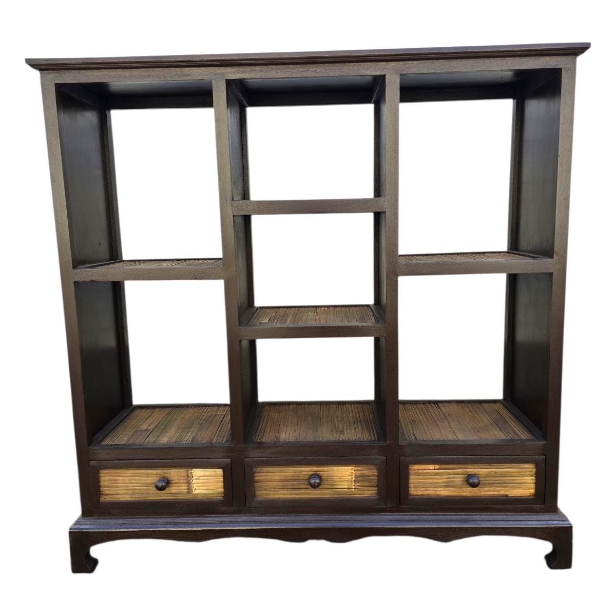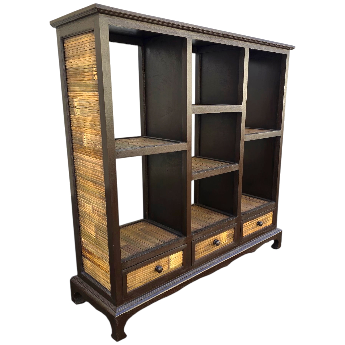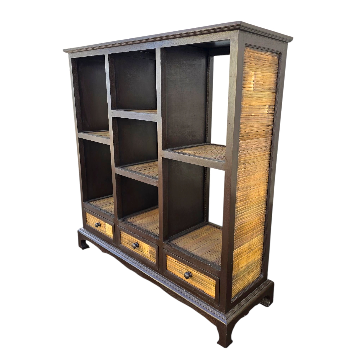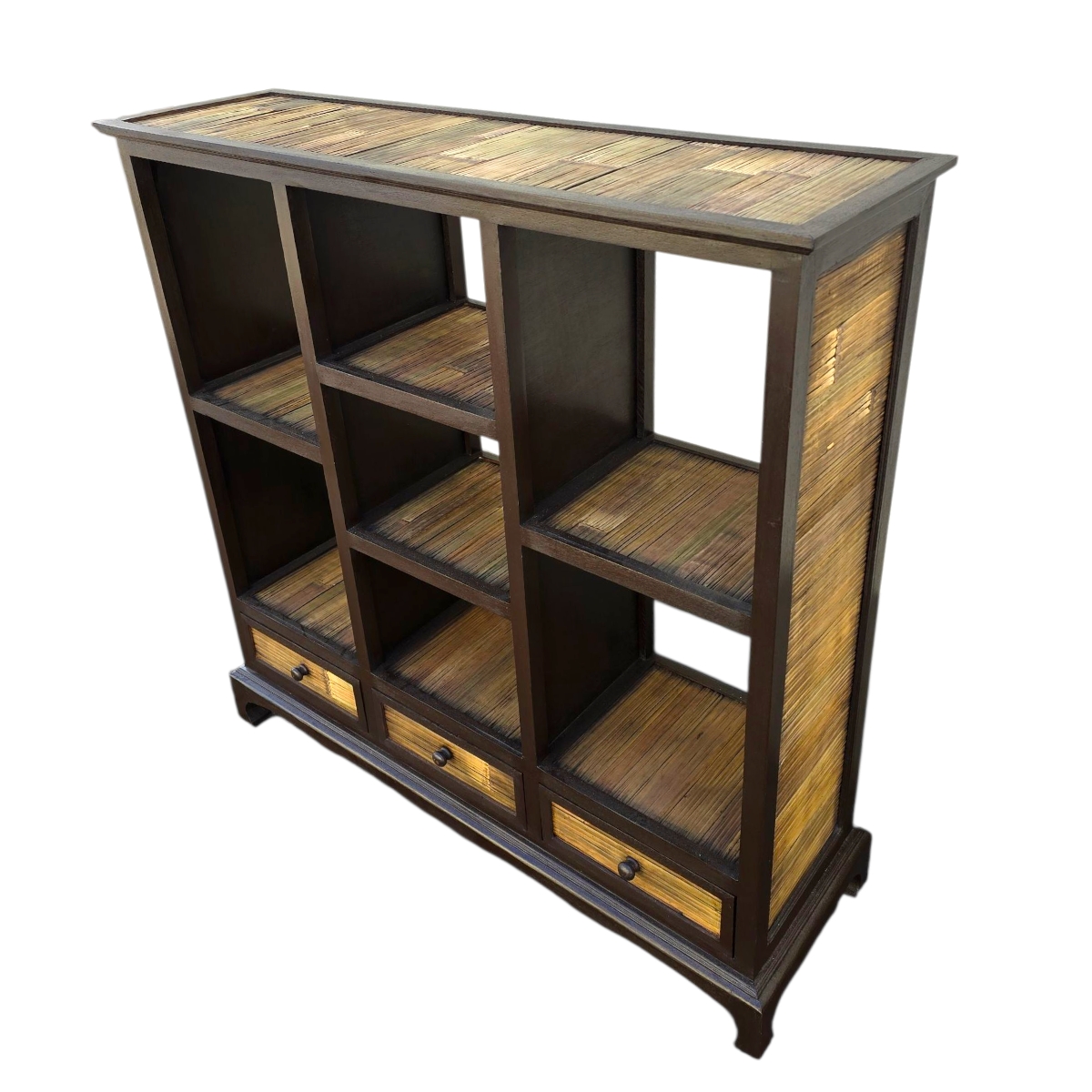 - Seitenwände mit Bambus verkleidet: Die kunstvoll gestalteten Seitenwände sind mit Bambus verkleidet und unterstreichen die natürliche Ästhetik des Regals. Der Bambus verleiht dem Möbelstück nicht nur eine besondere Textur, sondern auch seine umweltfreundliche Note.