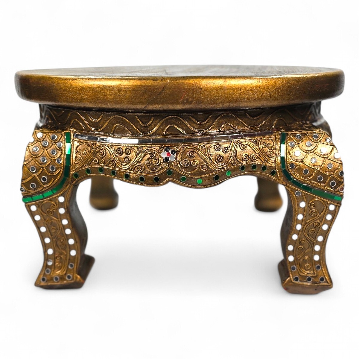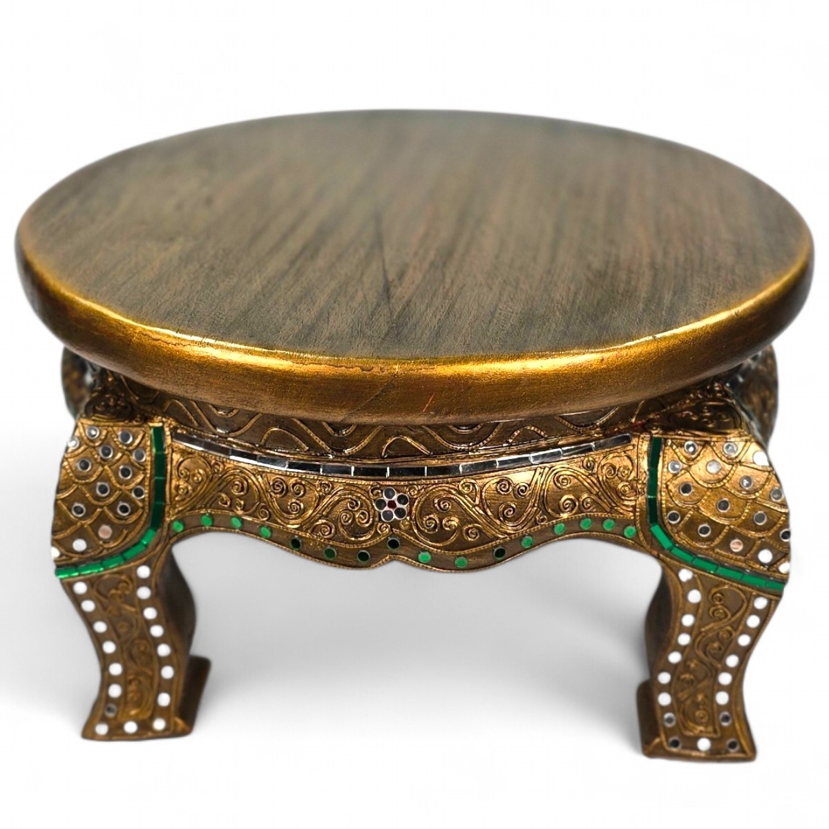 Entdecken Sie den Charme und die Tradition thailändischer Handwerkskunst mit unserem runden Beistelltisch, der Ihrem Zuhause einen Hauch von Exklusivität verleiht. Gefertigt aus hochwertigem Holz, präsentiert sich der Tisch in einer dunkel goldenen Farbe, die Wärme und Eleganz ausstrahlt.