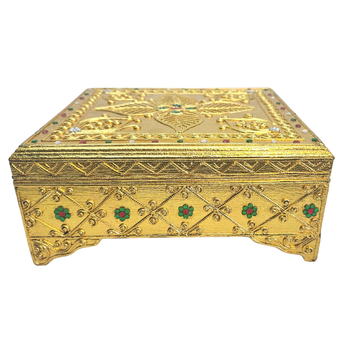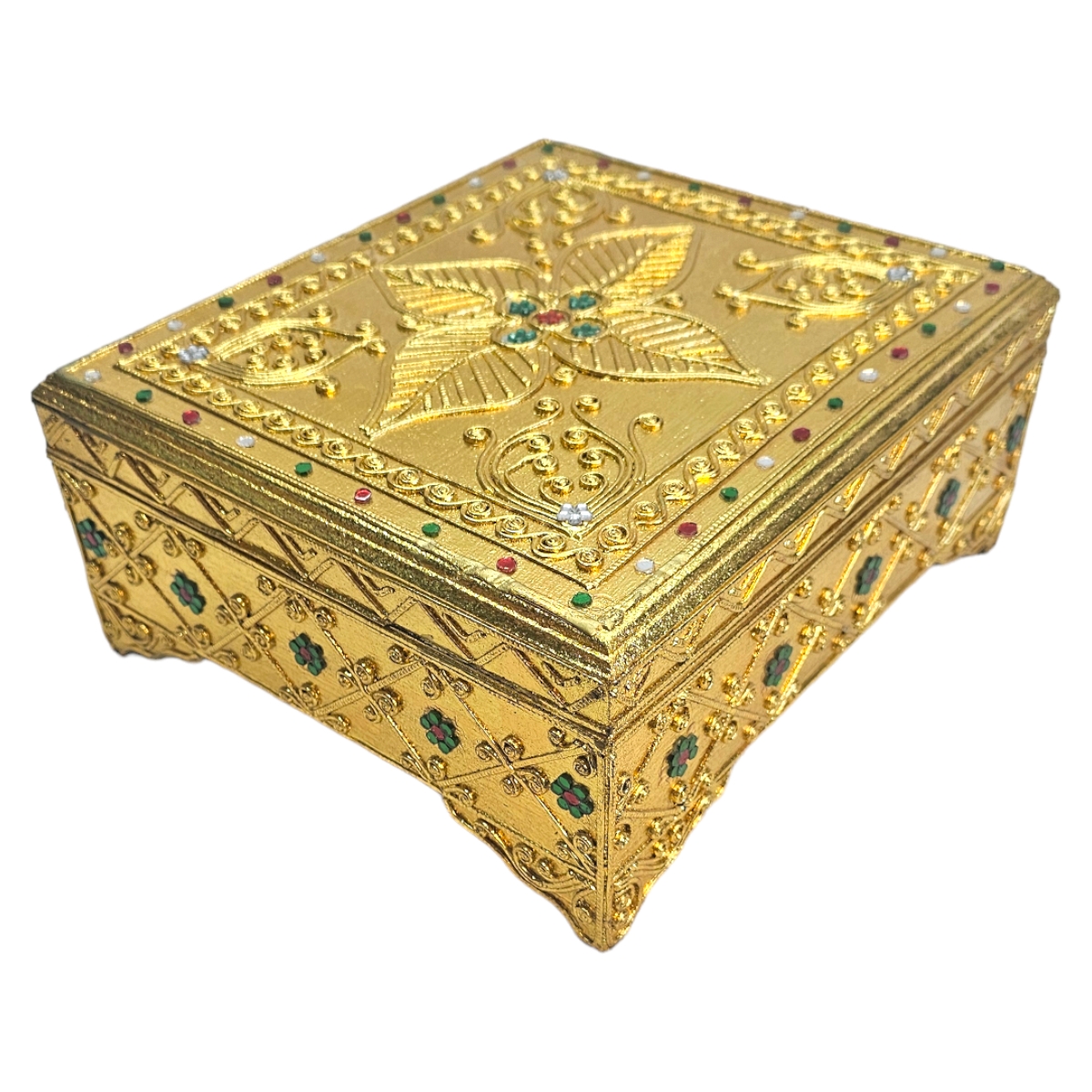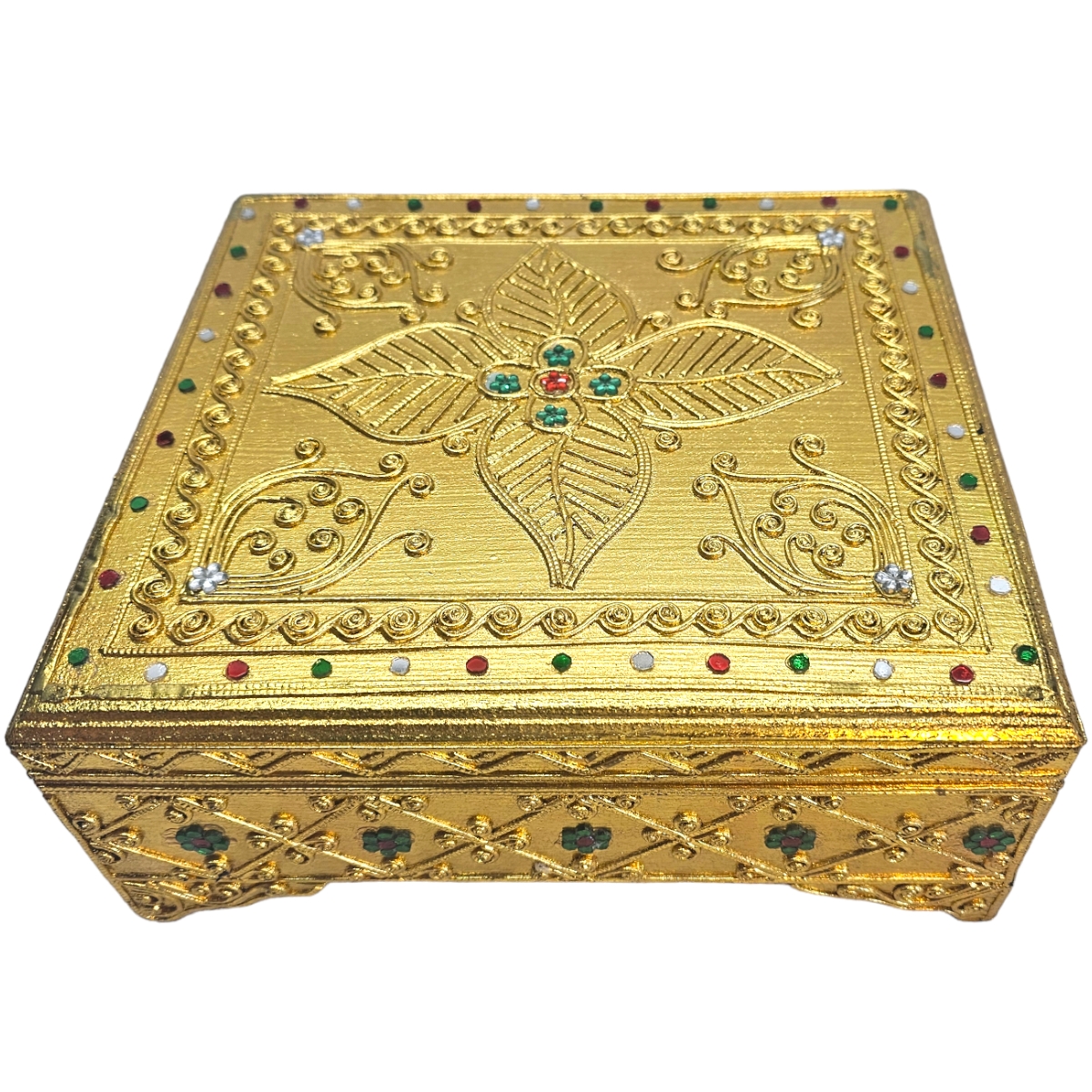 Eleganz, Handwerkskunst und Einzigartigkeit sind die Schlagworte für unsere Schmuck Box, sorgfältig handgefertigt in Thailand. Hergestellt aus hochwertigen Materialien und verziert mit prächtigen Mosaiksteinen, ist diese Schmuck Box ein echter Hingucker in goldener Farbe. Ein luxuriöses Heim für Ihre edelsten Schmuckstücke, das sich gleichzeitig als dekoratives Kunstwerk präsentiert. Lassen Sie sich von der einmaligen Schönheit dieser Box verzaubern und verwöhnen Sie Ihre Schmuckkollektion mit einem würdigen Aufbewahrungsort. Bestellen Sie jetzt Ihre Schmuck Box und erleben Sie exklusives thailändisches Handwerk in seiner schönsten Form.