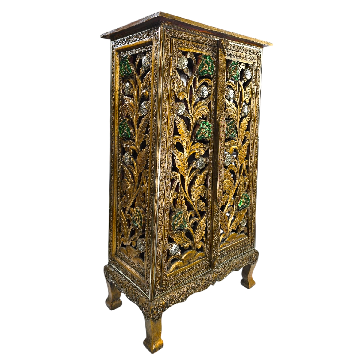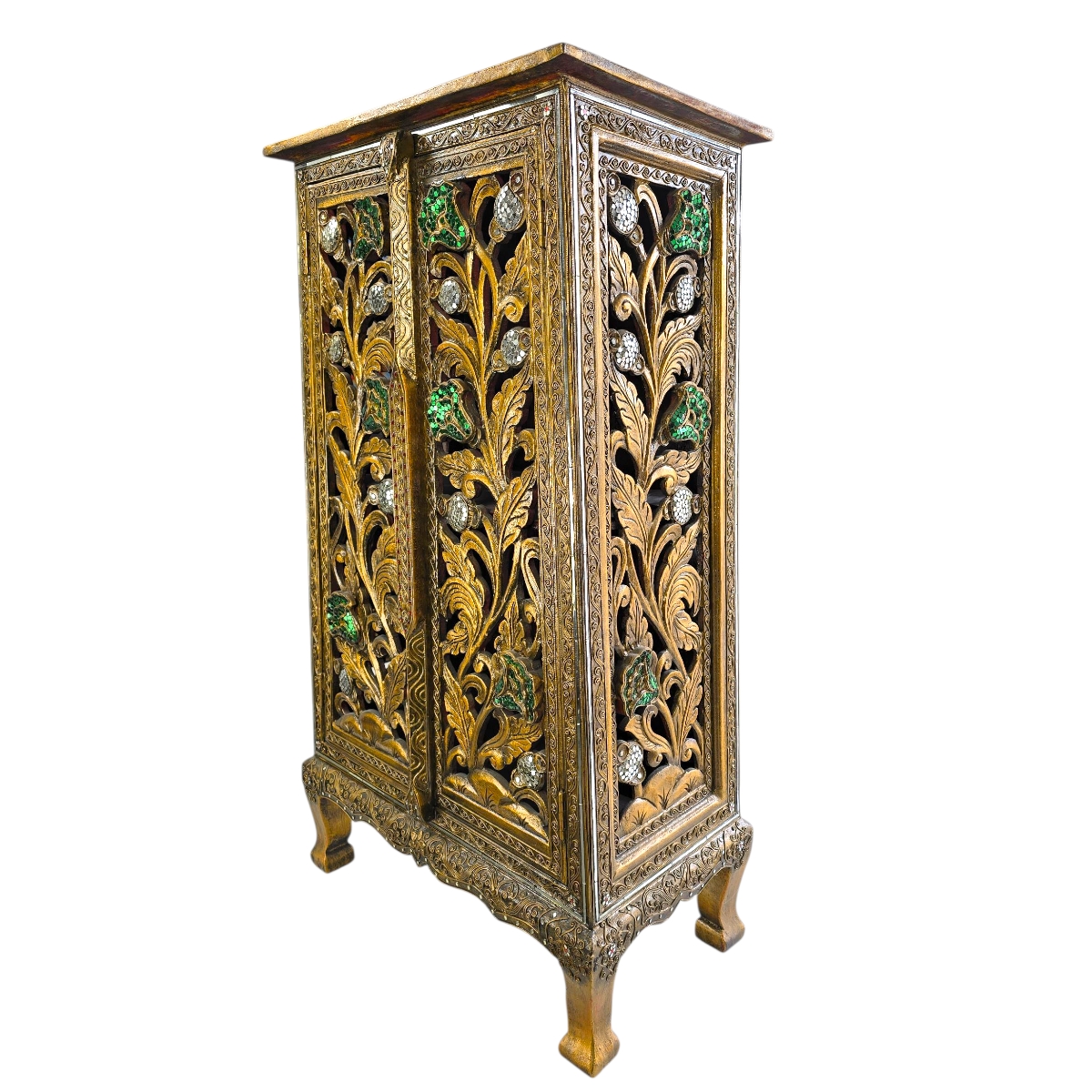 Was den Schrank Relief wirklich einzigartig macht, ist die Kombination aus traditioneller thailändischer Handwerkskunst und modernem Design. Jedes Detail erzählt von der Sorgfalt und Leidenschaft, mit der er gefertigt wurde. Die Reliefarbeit mit floralen Motiven in Kombination mit bunten Mosaiksteinen ist nicht nur ein Fest für die Sinne, sondern auch ein Ausdruck von Kreativität und kulturellem Erbe. Dieser Schrank ist mehr als nur ein Möbelstück; er ist ein Kunstwerk, das Geschichten erzählt und eine inspirierende Aura von exotischer Schönheit mit sich bringt.