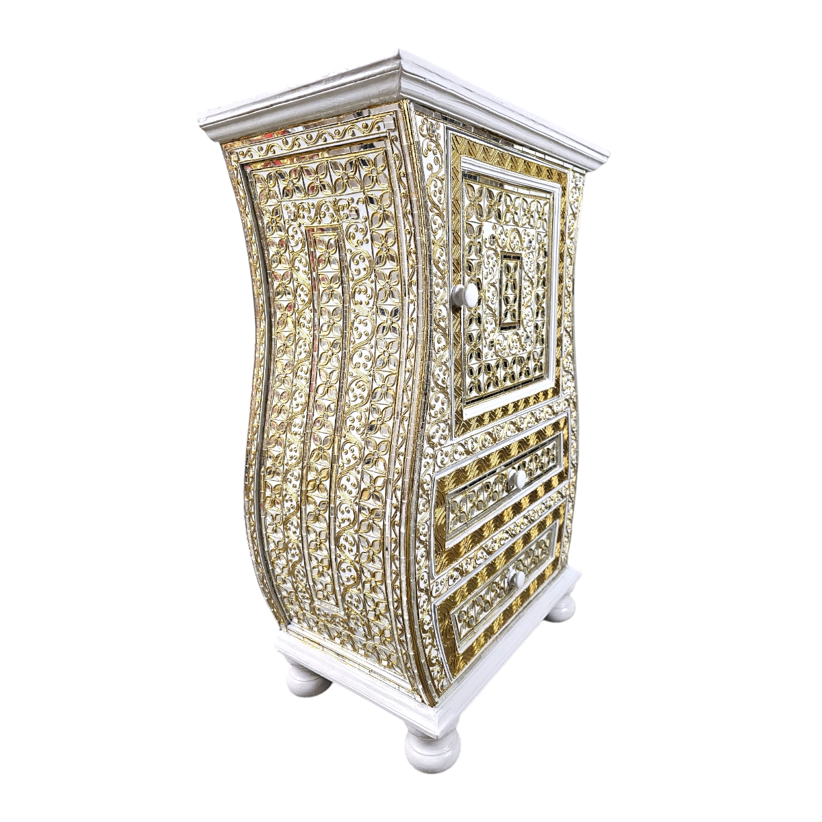 Ergreifen Sie diese Gelegenheit und fügen Sie Ihrer Inneneinrichtung eine Prise Eleganz und Raffinesse hinzu. Entdecken Sie unseren Schrank Weiß/Gold, handgefertigt in Thailand: eine perfekte Kombination aus kompromissloser Funktionalität und unvergleichlicher Schönheit. Mit glitzernden Goldakzenten, die auf seinem makellos weißen Hintergrund hervorstechen, wird dieser Schrank sicherlich zu einem wahren Blickfang in Ihrem Zuhause. Er dient nicht nur zur Aufbewahrung, sondern setzt auch ein beeindruckendes Stilelement. Genießen Sie die Faszination und den Charme, den er ausstrahlt, während er mühelos Komplimente von Ihren Gästen erntet. Unser Schrank Weiß/Gold - das perfekte Highlight für eine schicke und stilvolle Einrichtung.