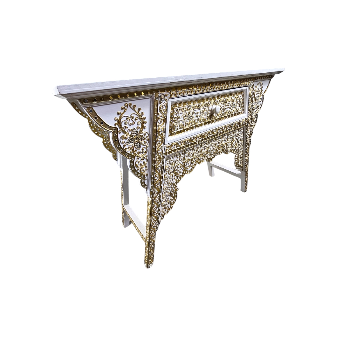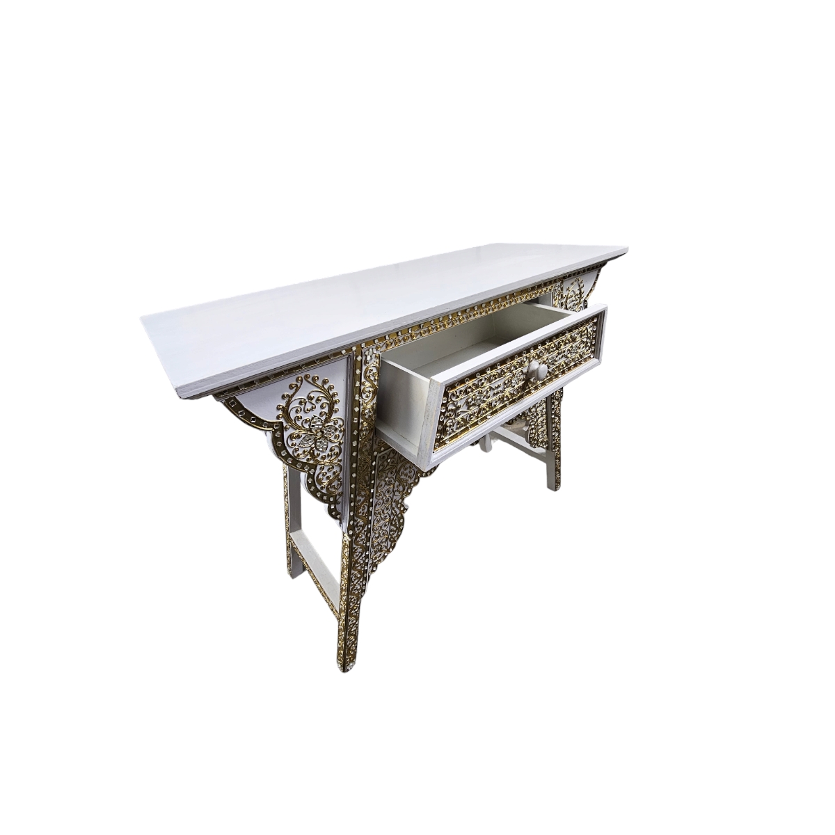 Ergreifen Sie diese Gelegenheit und fügen Sie Ihrer Inneneinrichtung eine Prise Eleganz und Raffinesse hinzu. Entdecken Sie unseren Schrank Weiß/Gold, handgefertigt in Thailand: eine perfekte Kombination aus kompromissloser Funktionalität und unvergleichlicher Schönheit. Mit glitzernden Goldakzenten, die auf seinem makellos weißen Hintergrund hervorstechen, wird dieser Schrank sicherlich zu einem wahren Blickfang in Ihrem Zuhause. Er dient nicht nur zur Aufbewahrung, sondern setzt auch ein beeindruckendes Stilelement. Genießen Sie die Faszination und den Charme, den er ausstrahlt, während er mühelos Komplimente von Ihren Gästen erntet. Unser Schrank Weiß/Gold - das perfekte Highlight für eine schicke und stilvolle Einrichtung.