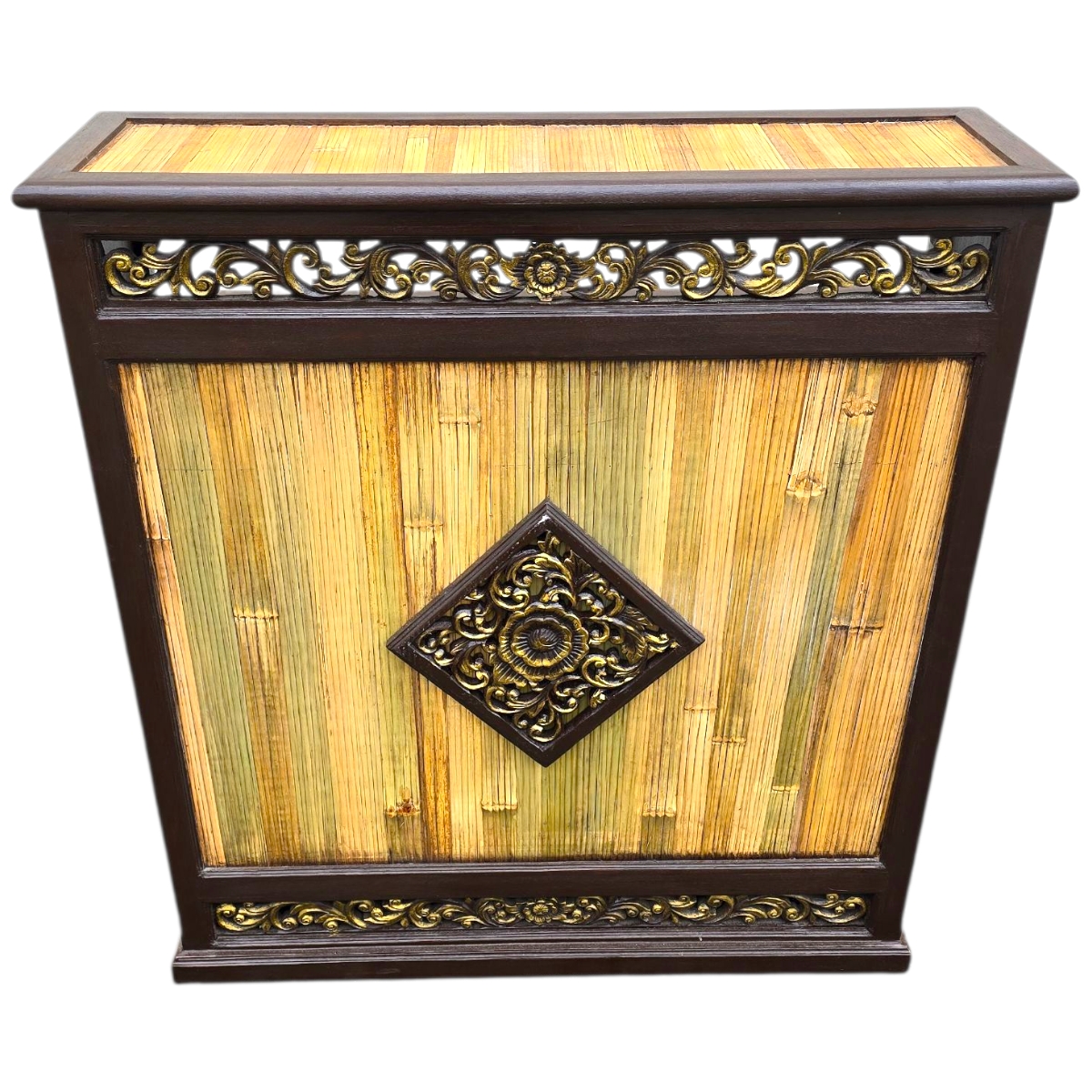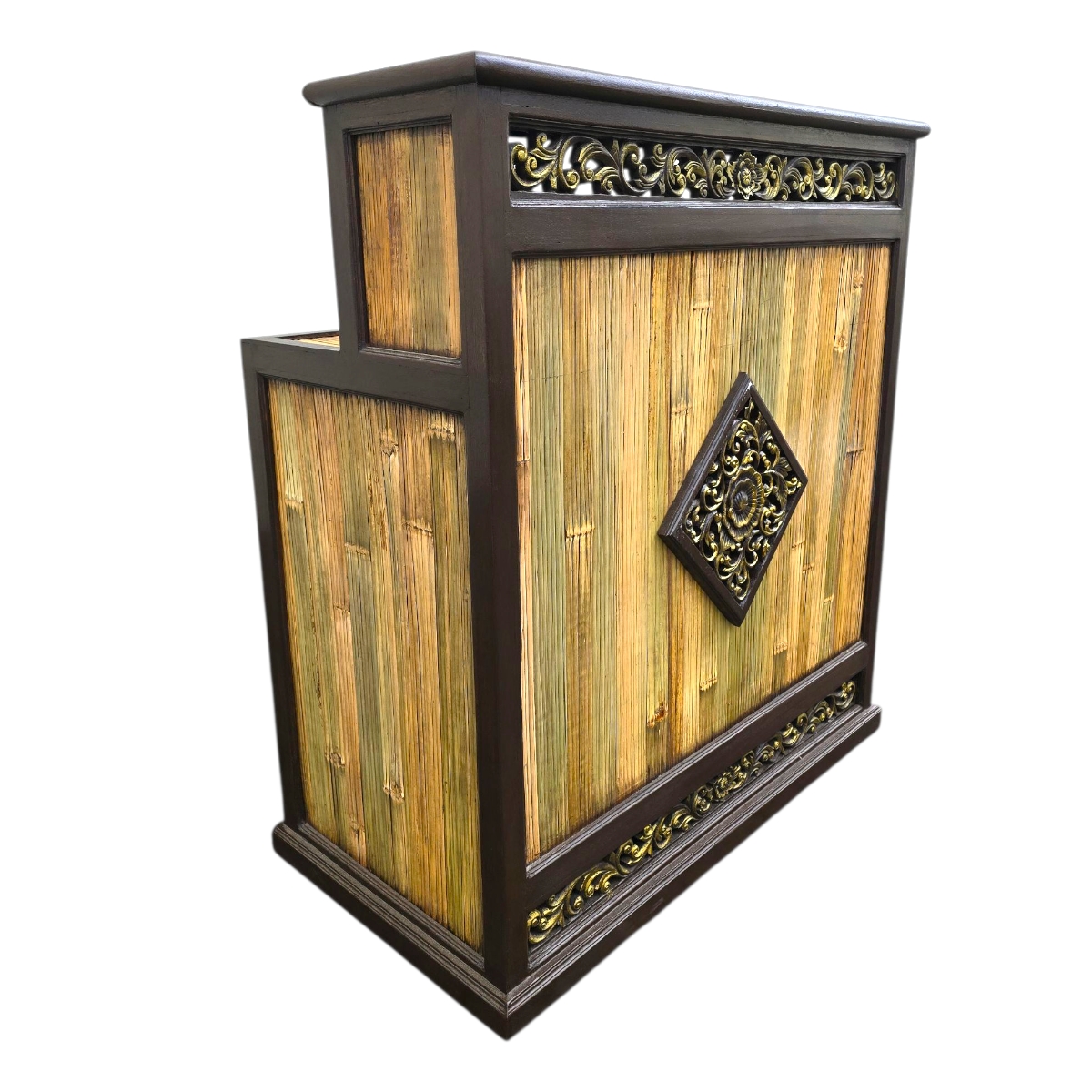 Dieses außergewöhnliche Produkt besticht durch seine Oberflächen und Seitenwände aus hochwertigem Bambus, die nicht nur für eine natürliche Optik sorgen, sondern auch durch Nachhaltigkeit überzeugen. Das edle Design wird durch kunstvolle Reliefverzierungen an der Vorderseite zusätzlich veredelt, sodass dieser Tresen zu einem echten Hingucker wird.