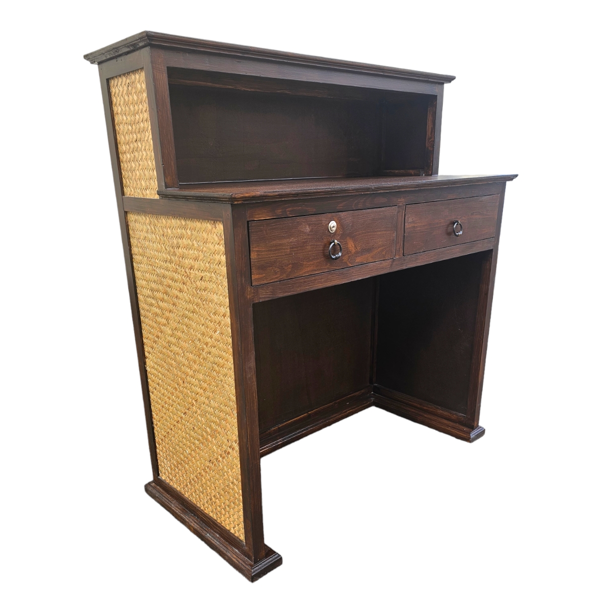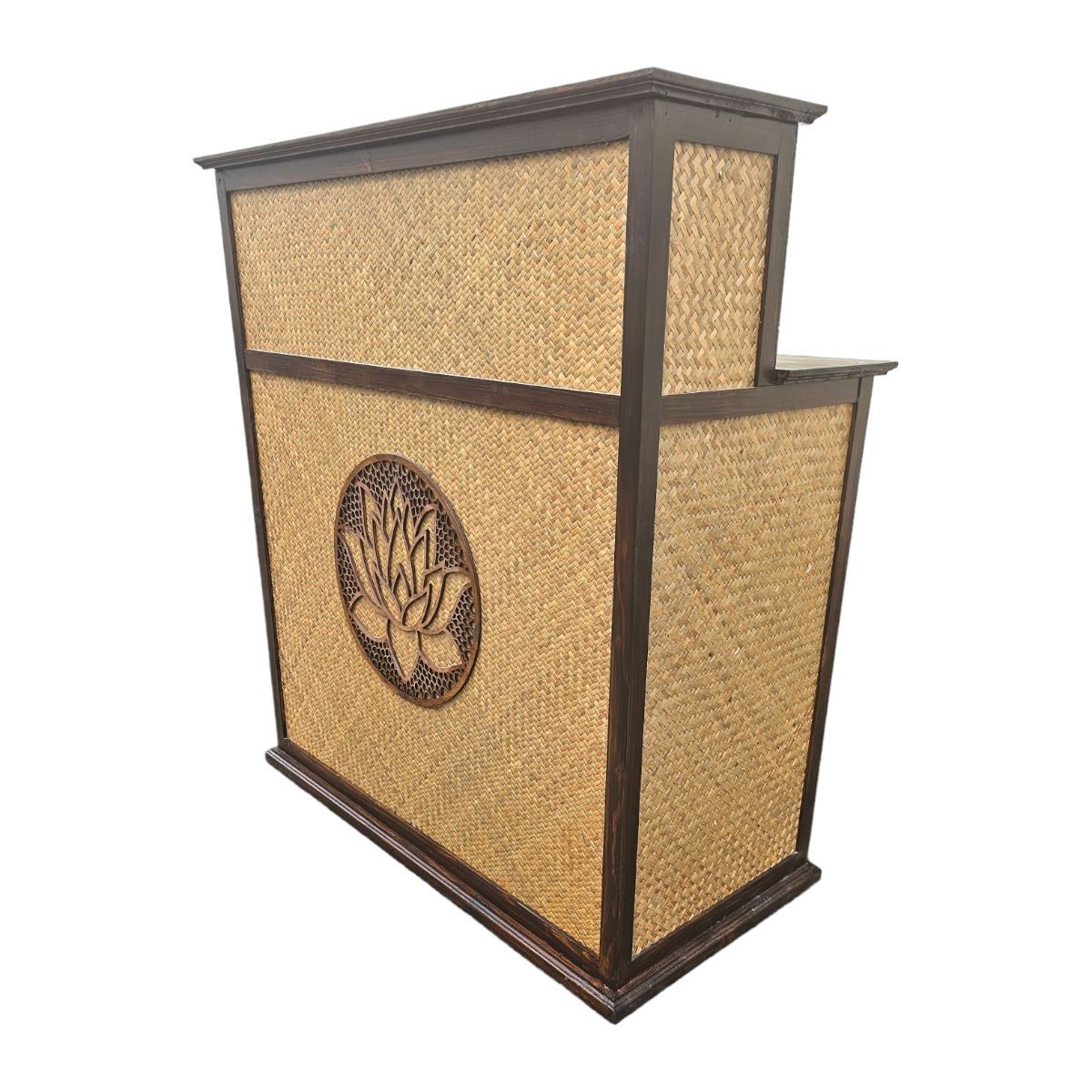 Werfen Sie Ihren Blick auf unseren exquisiten Tresen - ein herausragendes Produkt, das in eigener Produktion hergestellt wurde. Er ist mit Rattan Natur bezogen, was ihm ein ästhetisch ansprechendes Aussehen verleiht. Darüber hinaus unterstreicht der braune Rahmen seine Eleganz und lässt ihn in jedem Raum erstrahlen. Das besondere Highlight ist das verzierte Lotus Relief, das diesem Tresen ein einzigartiges und unverwechselbares Design verleiht. Machen Sie Ihre Bar oder Ihr Wohnzimmer zu einem Hingucker par Excellence mit diesem handgefertigten Tresen. Qualität, die beeindruckt, Design, das verzaubert - das ist unser Tresen für Sie.