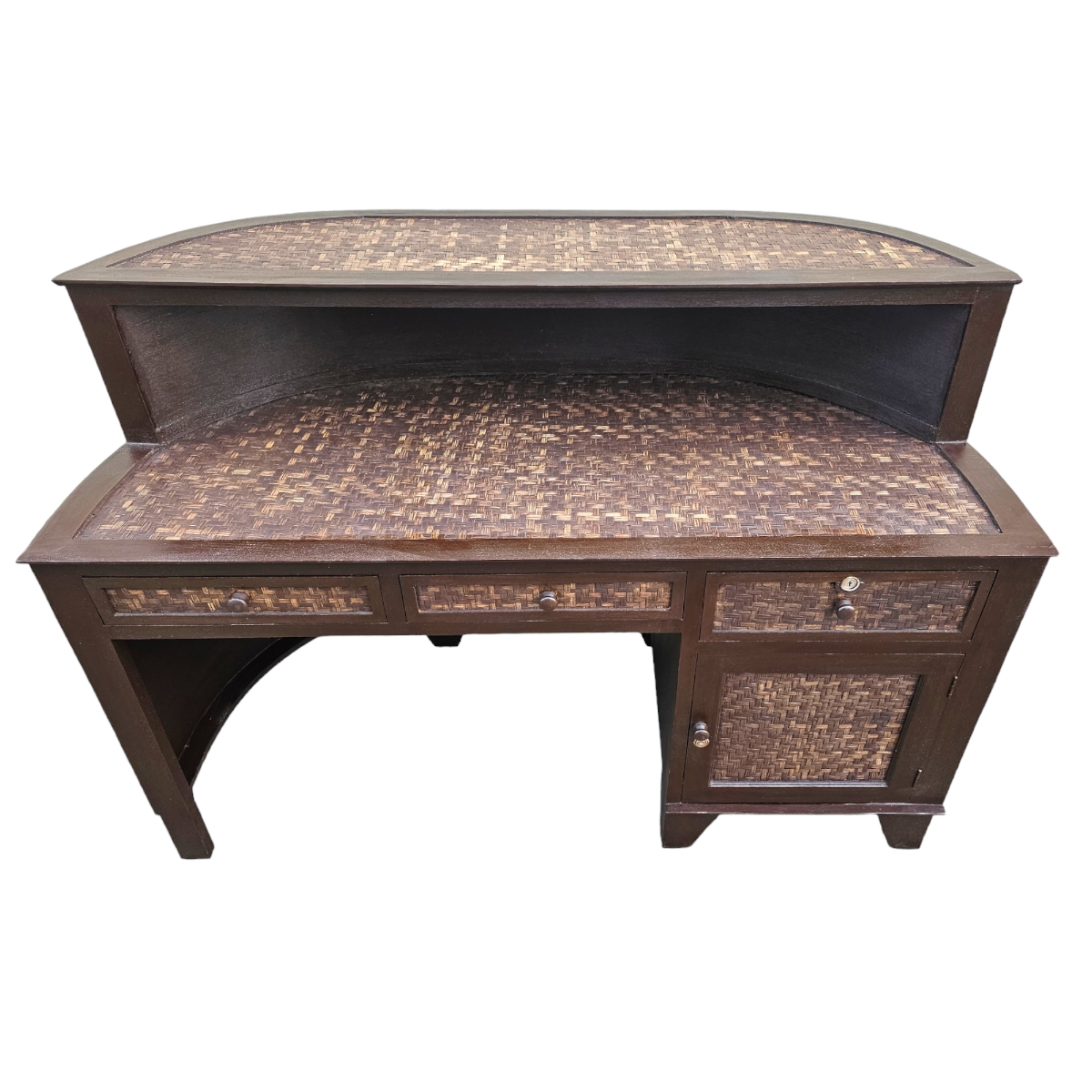 Entdecken Sie den Charme handgefertigter Perfektion mit unserem exquisiten Tresen, direkt aus den kunstvollen Händen thailändischer Handwerker. Dieses außergewöhnliche Möbelstück beeindruckt durch seine elegante, halbrunde Form, die sich nahtlos in jedes Raumkonzept einfügt – perfekt für Ihr Wohnzimmer, Ihre Küche oder den Eingangsbereich. Der stabile Rahmen aus hochwertigem Holz verspricht Langlebigkeit und Stabilität, während die mit Rattan bezogenen Flächen dem Tresen eine natürliche, warme Ausstrahlung verleihen. Rattan, bekannt für seine Robustheit, verbindet Tradition mit modernem Design und macht jedes Stück zu einem Unikat. Funktionalität trifft auf Ästhetik: Ausgestattet mit drei praktischen Schubladen und einem großzügigen Unterschrank bietet dieser Tresen ausreichend Stauraum für all Ihre Bedürfnisse. Die Frontseite wird durch zwei kunstvoll gestaltete Reliefs verziert, die dem Möbelstück einen Hauch von thailändischer Kultur und Handwerkskunst verleihen. Ob als stilvoller Empfang im Eingangsbereich oder als funktionales Highlight in Ihrer Küche, dieser handgefertigte Tresen ist mehr als nur ein Möbelstück – er ist eine Investition in Qualität und Design, die den Test der Zeit bestehen wird. Verleihen Sie Ihrem Zuhause ein Stück thailändischer Tradition und genießen Sie die Kombination aus Stil und Funktionalität.