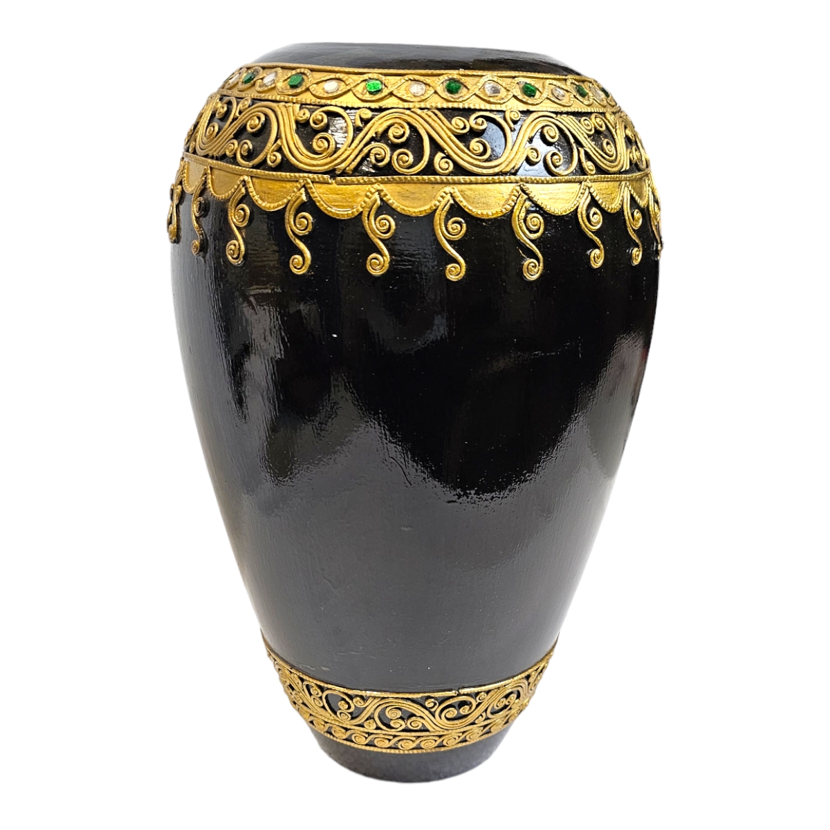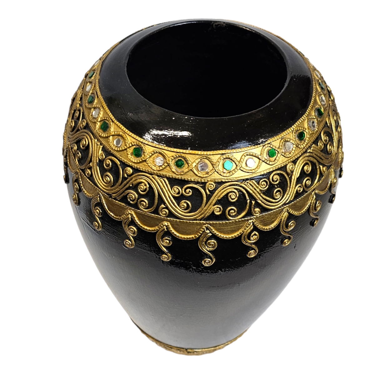 Erwecken Sie die Schönheit thailändischer Handwerkskunst in Ihrem Zuhause mit diesem exquisiten Holzvase. Mit Liebe handgefertigt und kunstvoll bemalt in edlem Schwarz, zeichnet sich dieses Produkt durch seine hervorragende Qualität und Detailgenauigkeit aus. Veredelt ist sie mit eleganten goldenen Verzierungen und verziert mit schimmernden Mosaiksteinen, die im Licht funkeln. Diese besondere Vase ist nicht nur ein praktisches Wohnaccessoire zum Aufstellen von Blumen und Zweigen, sondern auch ein echter Hingucker und eine exquisite Bereicherung für jeden Wohnraum. Erleben Sie mit dieser Vase die einzigartige Mischung aus Tradition und Moderne, die Ihr Zuhause in ein exotisches Paradies verwandelt.