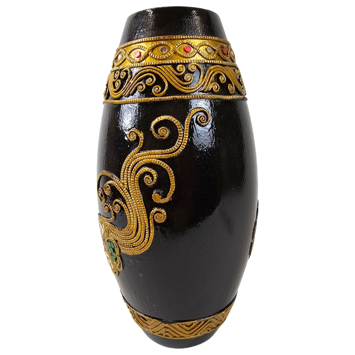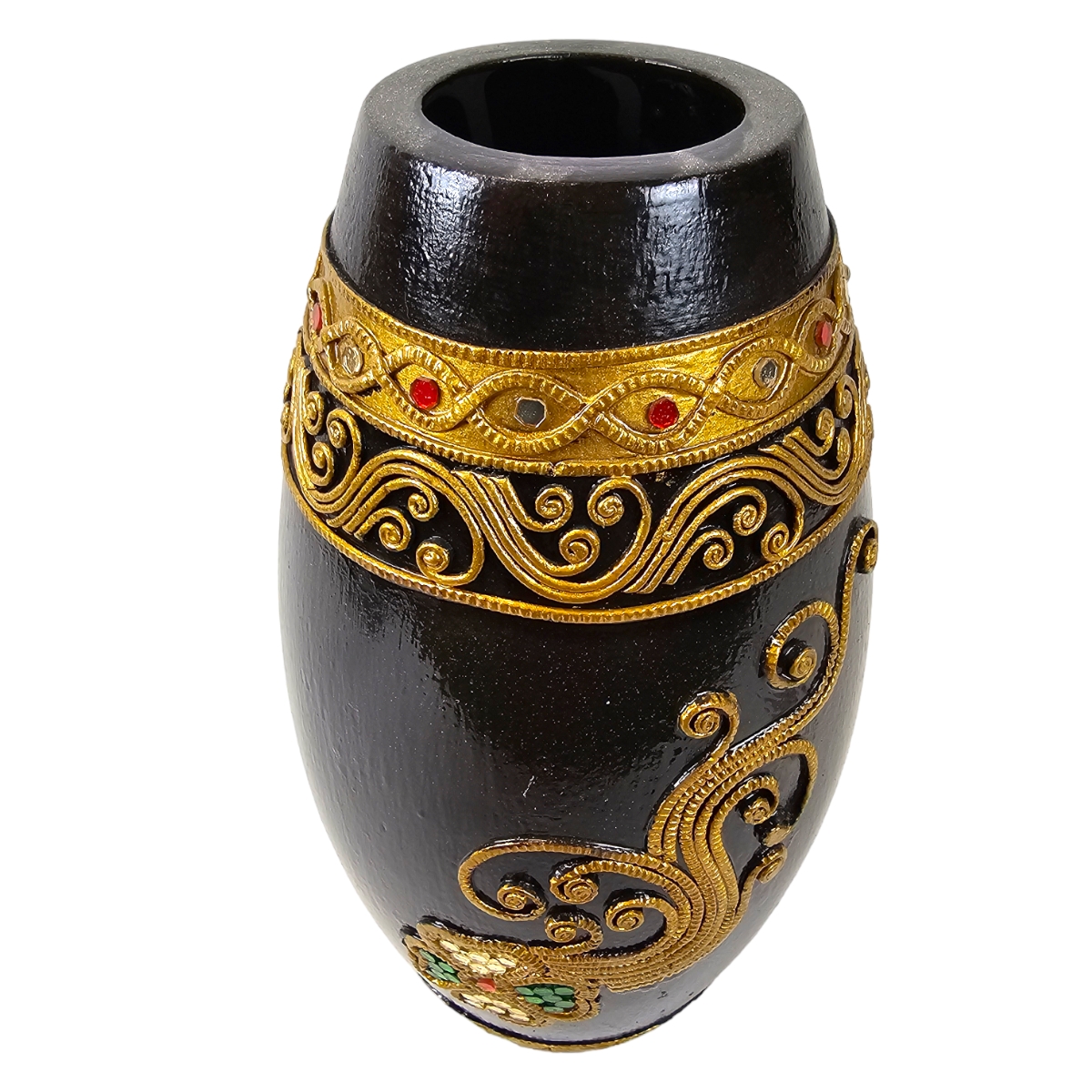 Erwecken Sie die Schönheit thailändischer Handwerkskunst in Ihrem Zuhause mit diesem exquisiten Holzvase. Mit Liebe handgefertigt und kunstvoll bemalt in edlem Schwarz, zeichnet sich dieses Produkt durch seine hervorragende Qualität und Detailgenauigkeit aus. Veredelt ist sie mit eleganten goldenen Verzierungen und verziert mit schimmernden Mosaiksteinen, die im Licht funkeln. Diese besondere Vase ist nicht nur ein praktisches Wohnaccessoire zum Aufstellen von Blumen und Zweigen, sondern auch ein echter Hingucker und eine exquisite Bereicherung für jeden Wohnraum. Erleben Sie mit dieser Vase die einzigartige Mischung aus Tradition und Moderne, die Ihr Zuhause in ein exotisches Paradies verwandelt.